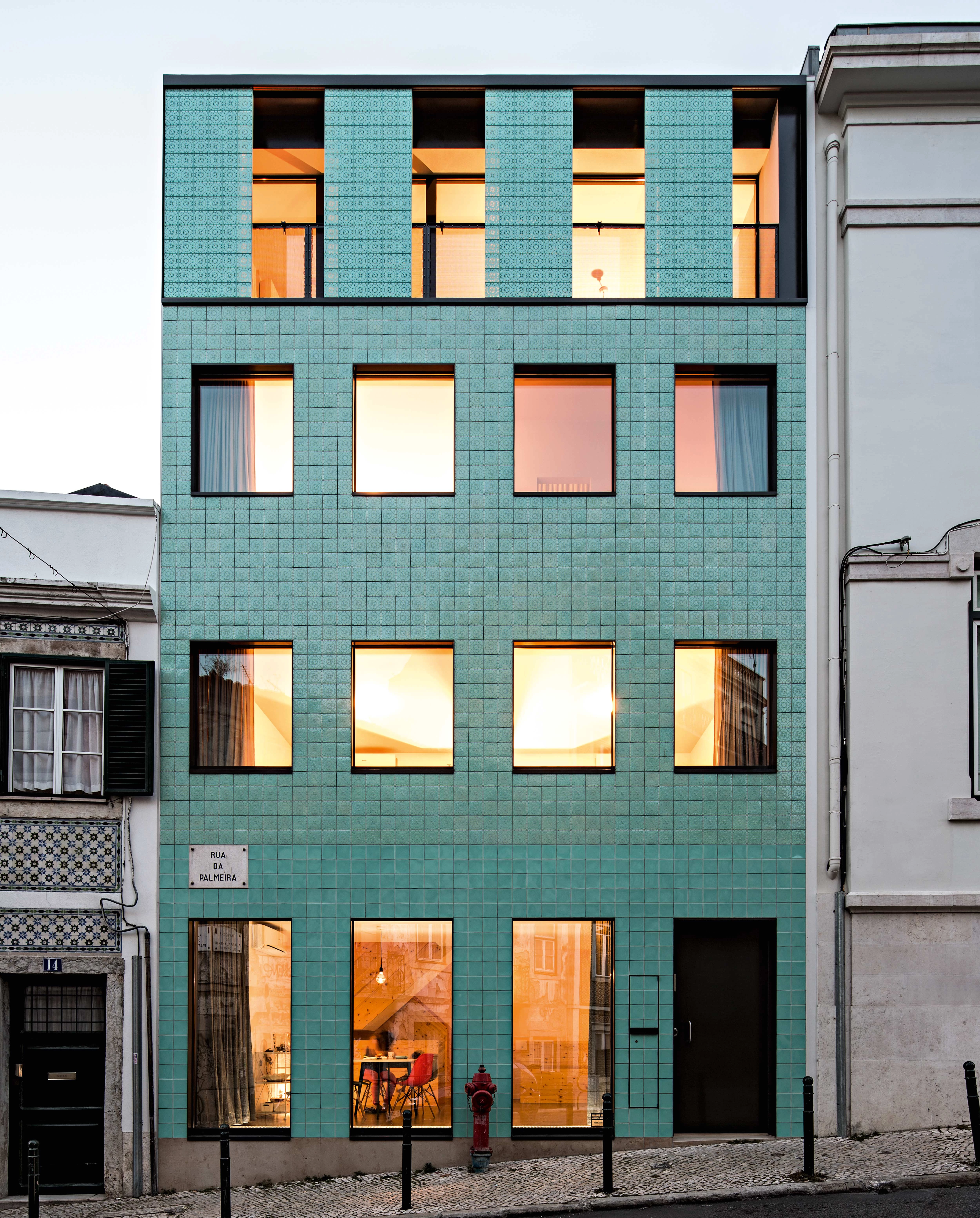 Situada en las inmediaciones del Jardín del Príncipe, en el Barrio Alto de Lisboa, la parcela entre medianeras donde se sitúa la vivienda tiene 41 metros de superficie, lo cual obligó a distribuir el programa doméstico en cinco alturas, a razón de una estancia por planta. Todas ellas se conectan a un pequeño atrio de sección variable, por donde entra la luz, y que hace las veces de chimenea solar que permite la ventilación natural durante el verano. Desde el punto de vista constructivo, lo más singular del edificio es su fachada principal, que está compuesta por piezas cerámicas cuyos motivos decorativos sintetizan de una manera muy sutil los tradicionales que definían la piel del edificio preexistente. Así, la envolvente está formada por tres tipos de piezas: plaquetas planas de tonos verdosos, plaquetas en relieve y finalmente contraventanas de cobre perforado, en el mismo color. Todo ello colocado sobre una estructura metálica ligera dotada de una gran capa de aislamiento térmico y acústico.