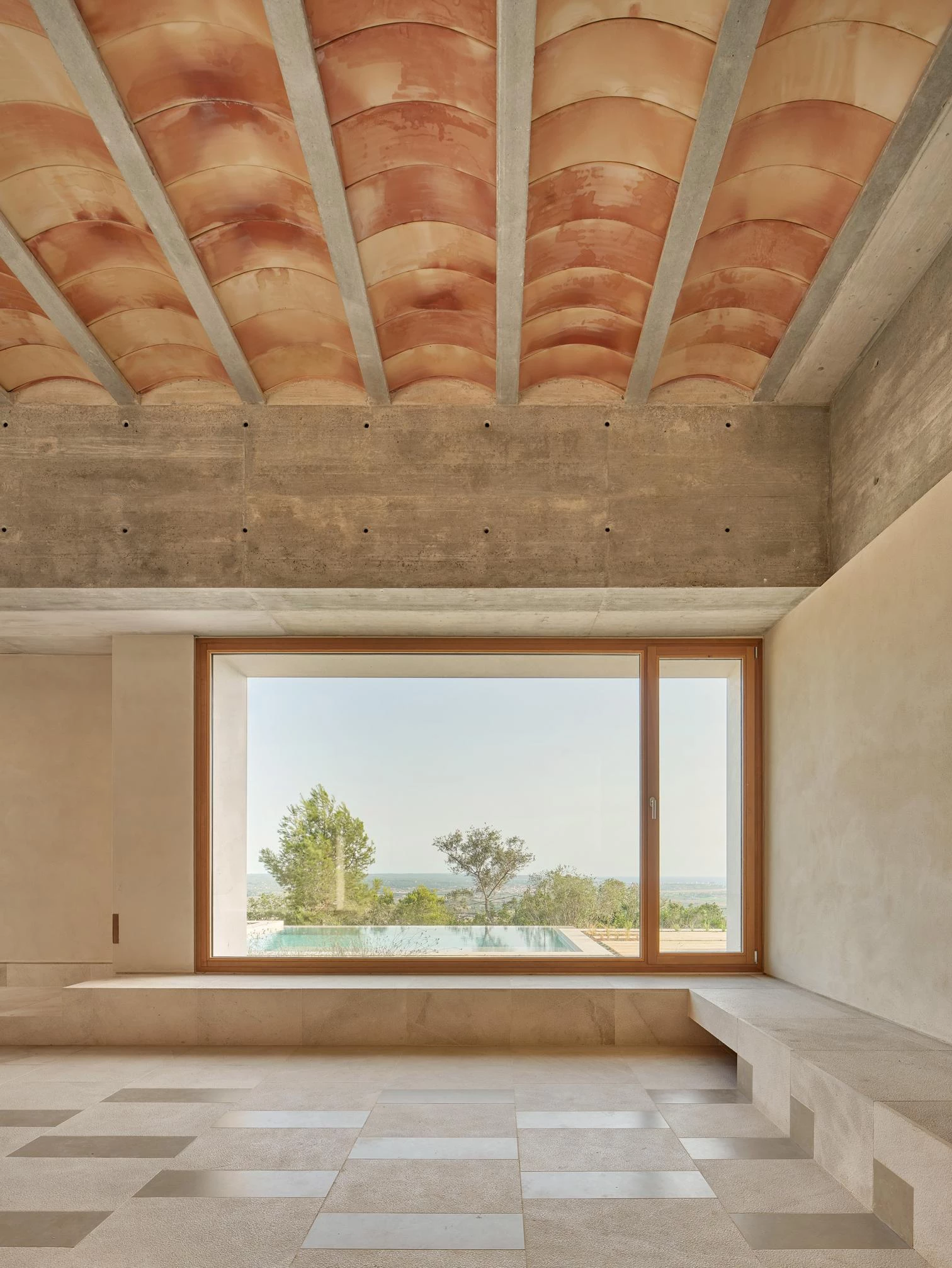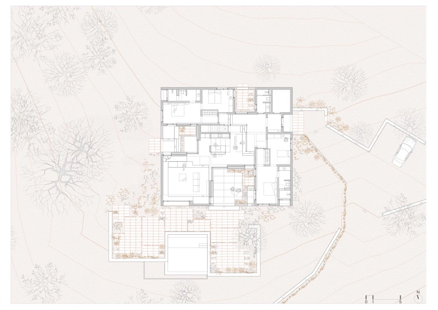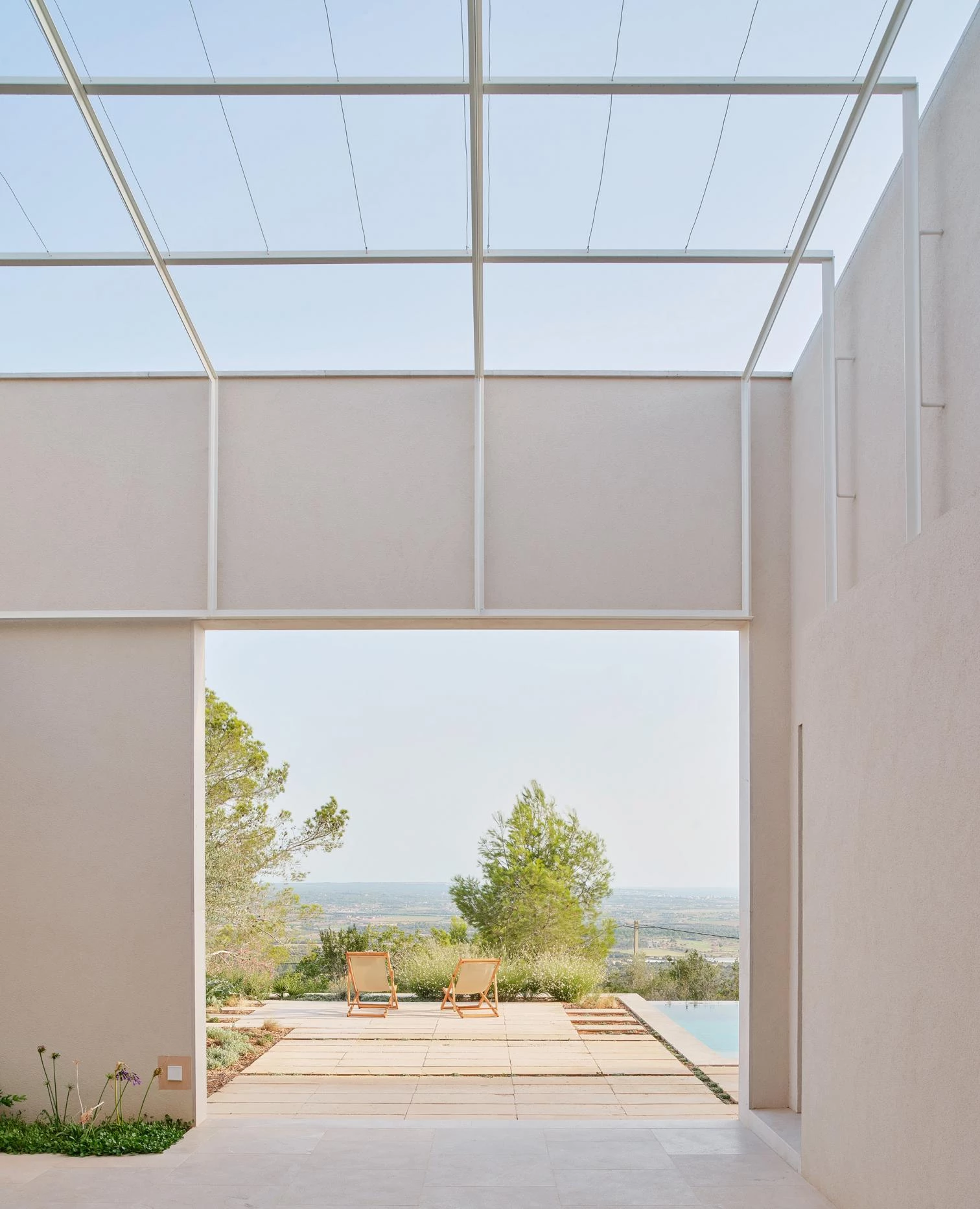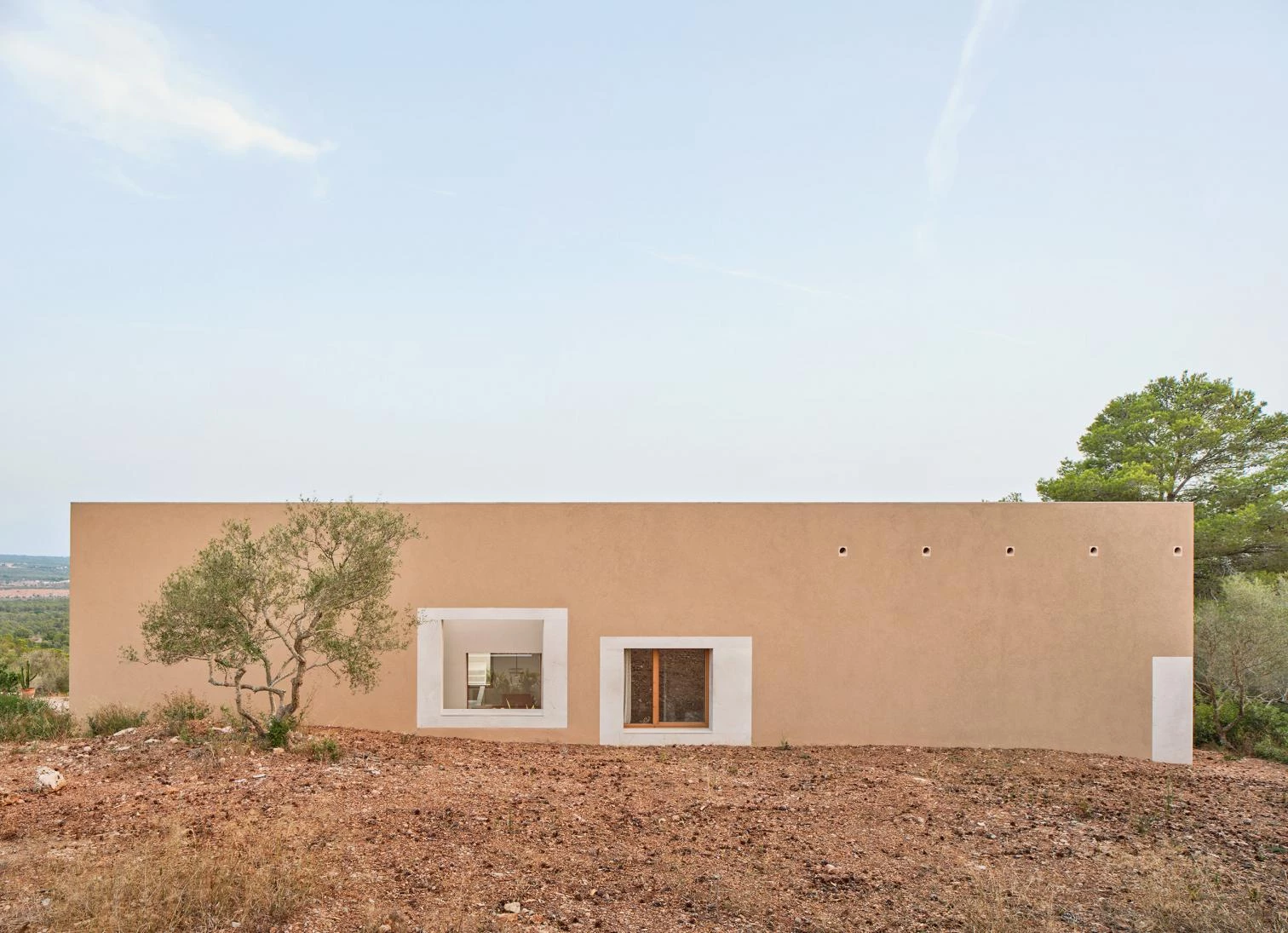 Con impresionantes vistas hacia la bahía de Palma, esta vivienda escalonada se sitúa en la parte alta de la parcela, adaptándose con diferentes niveles a la topografía inclinada del terreno. Tres patios se introducen en fachada como espacios de transición entre el interior y el exterior.