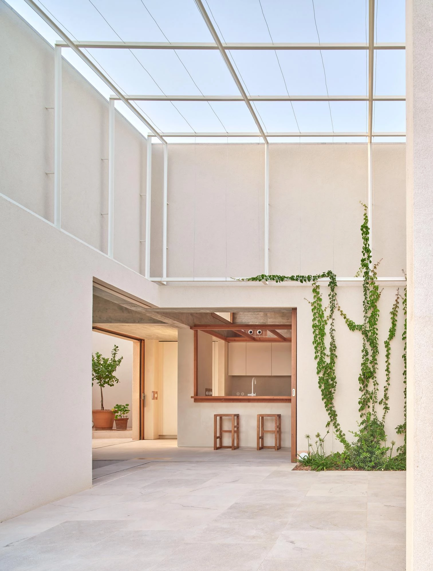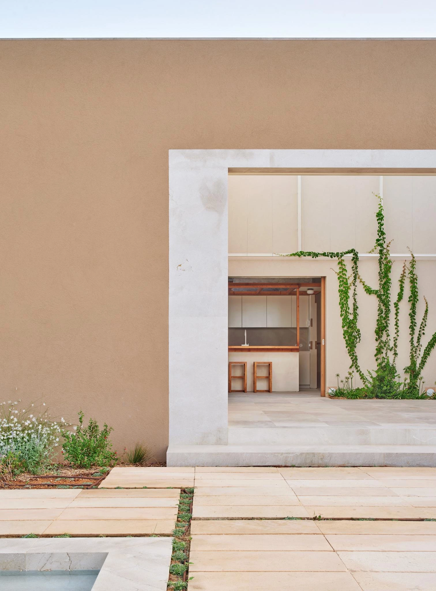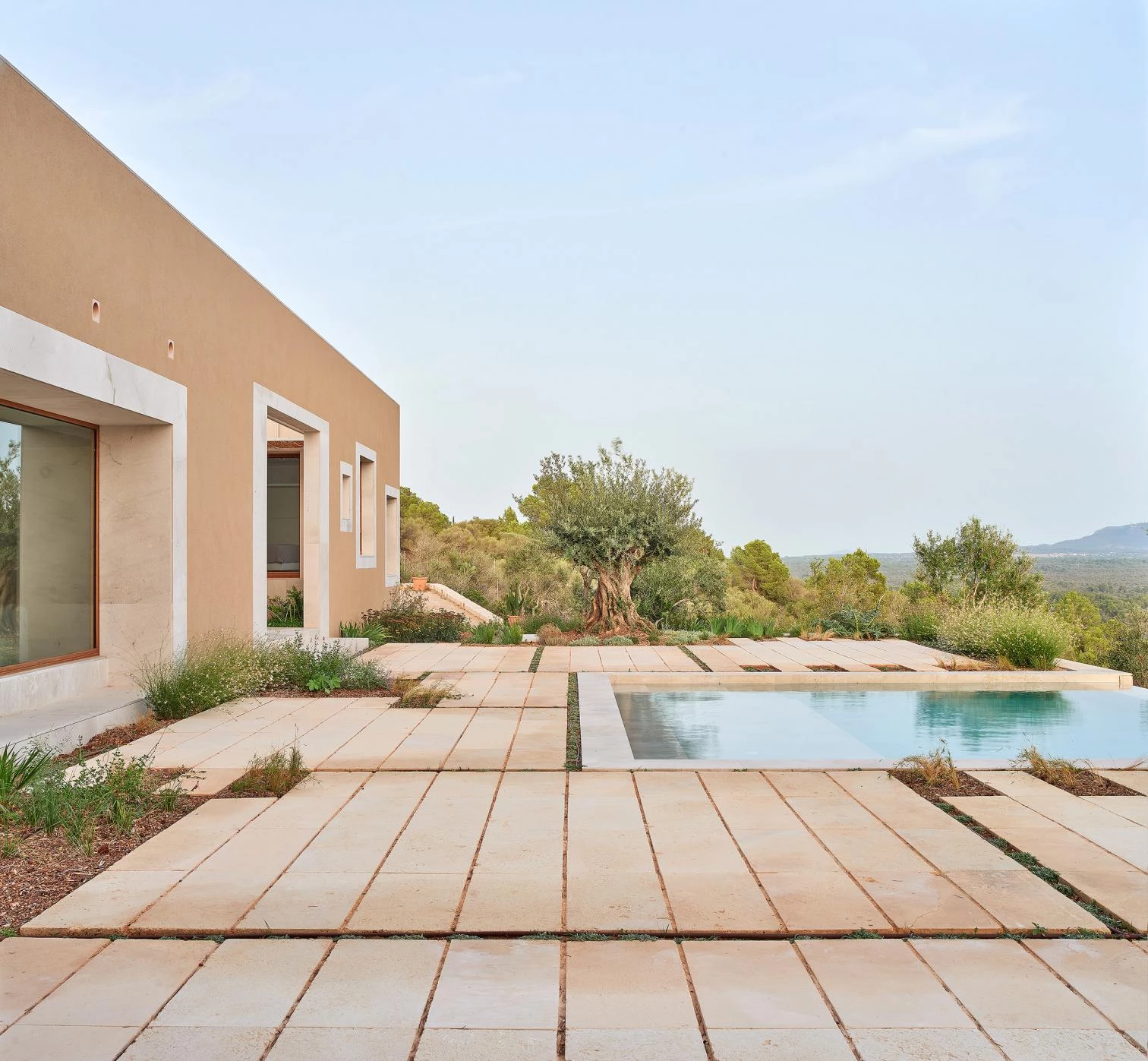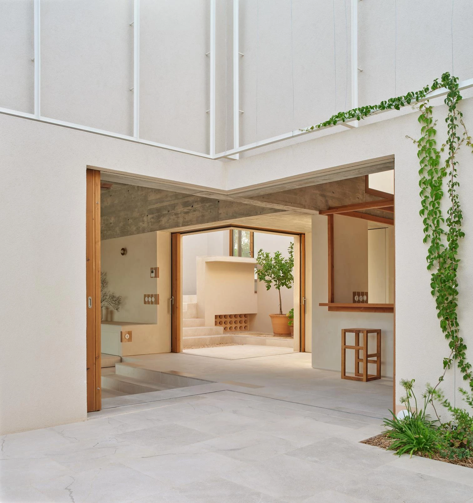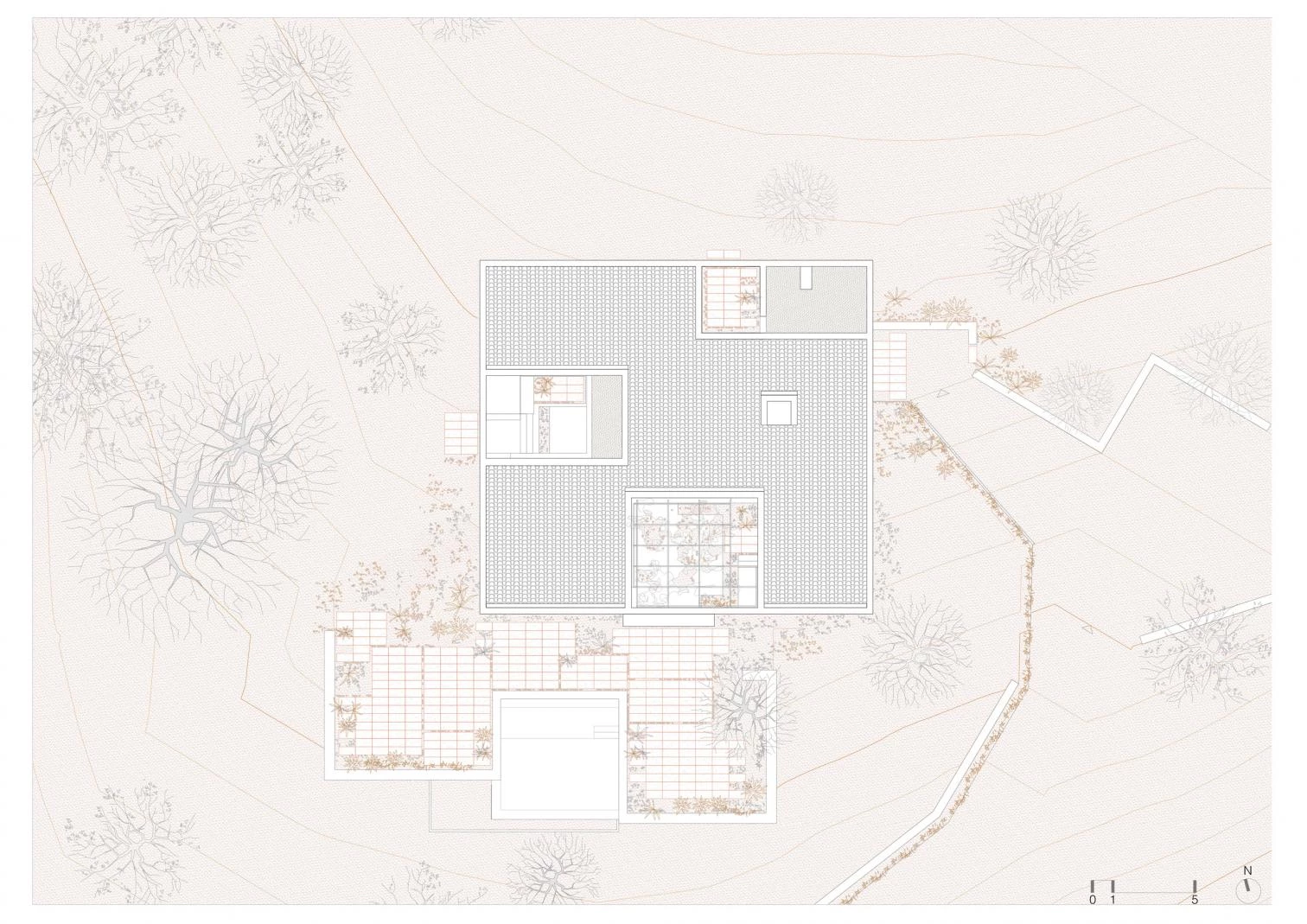 Con impresionantes vistas hacia la bahía de Palma, esta vivienda escalonada se sitúa en la parte alta de la parcela, adaptándose con diferentes niveles a la topografía inclinada del terreno. Tres patios se introducen en fachada como espacios de transición entre el interior y el exterior.