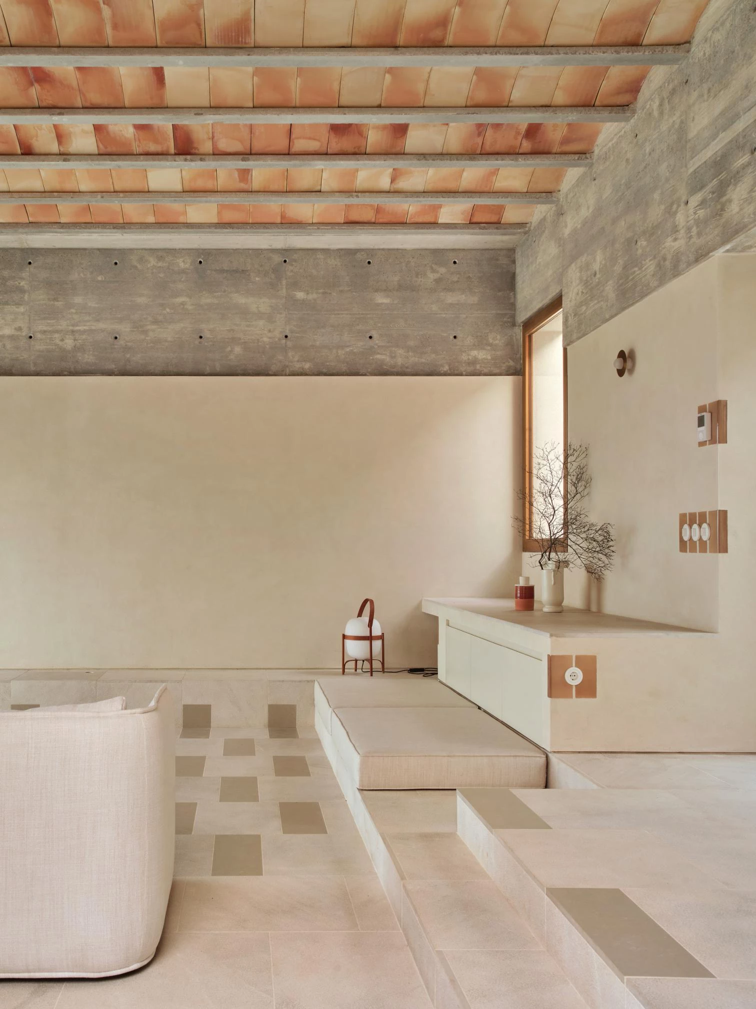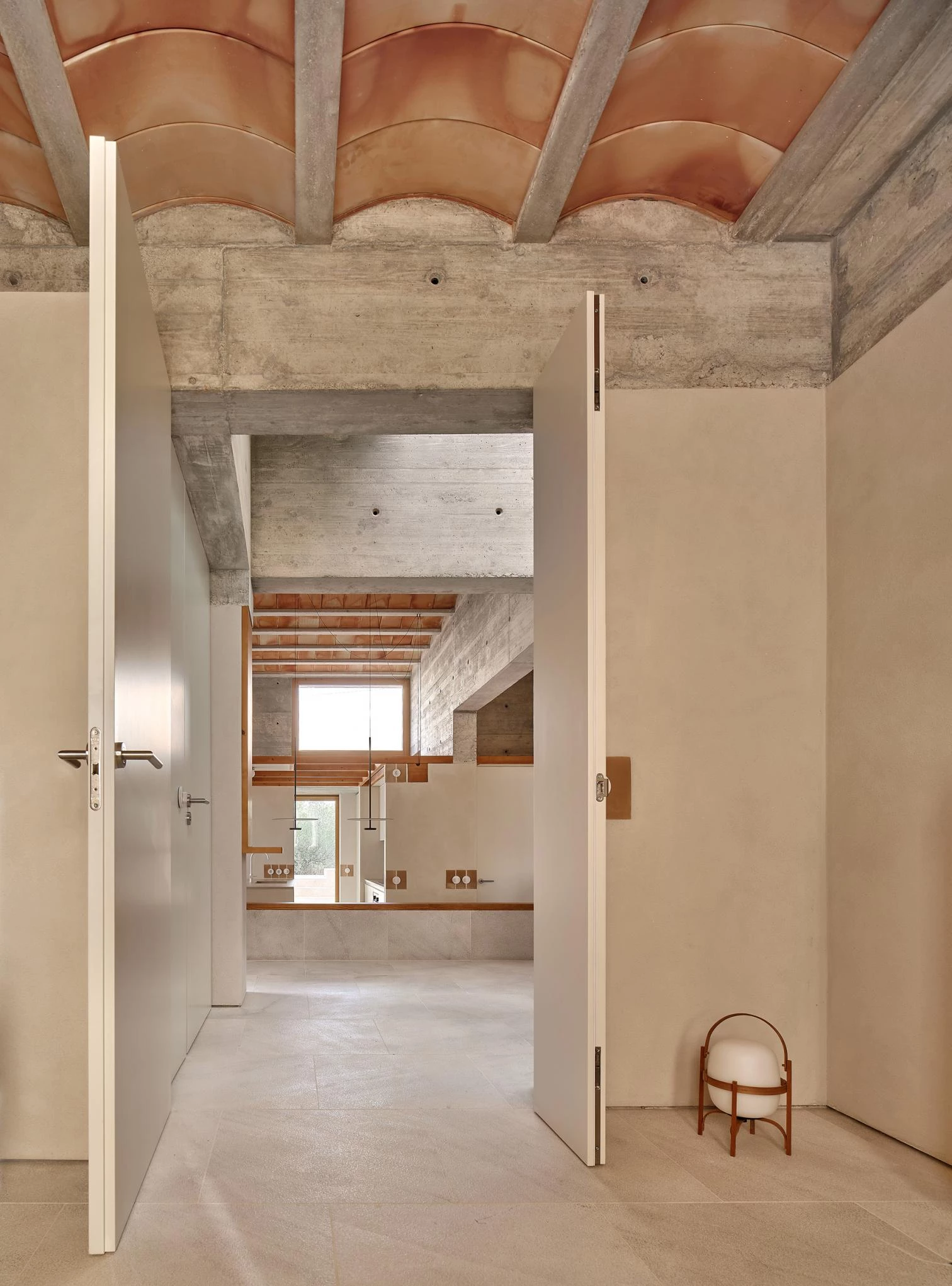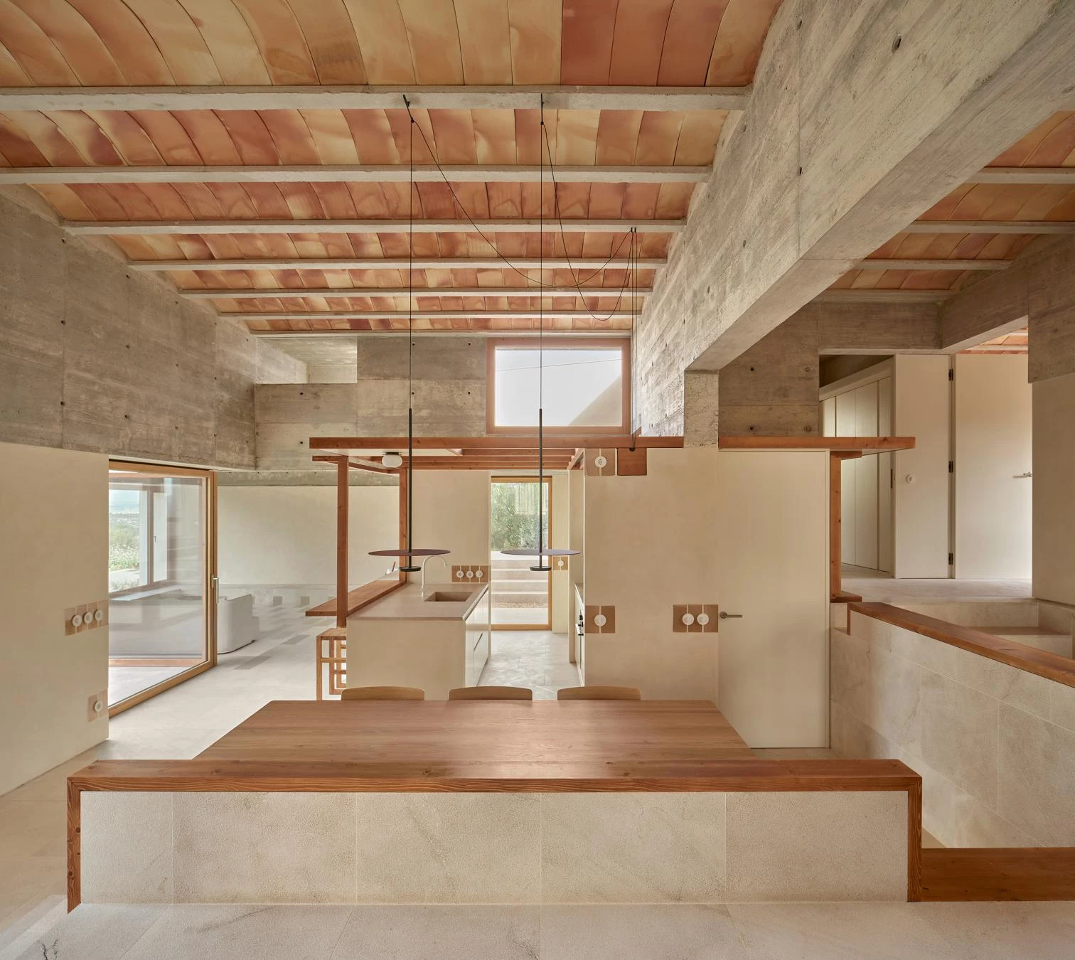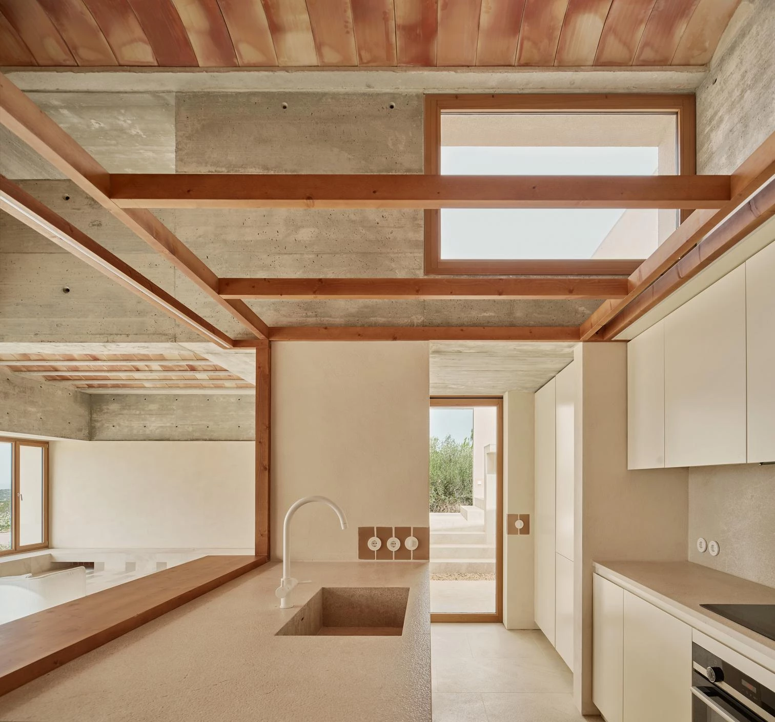 Con impresionantes vistas hacia la bahía de Palma, esta vivienda escalonada se sitúa en la parte alta de la parcela, adaptándose con diferentes niveles a la topografía inclinada del terreno. Tres patios se introducen en fachada como espacios de transición entre el interior y el exterior.