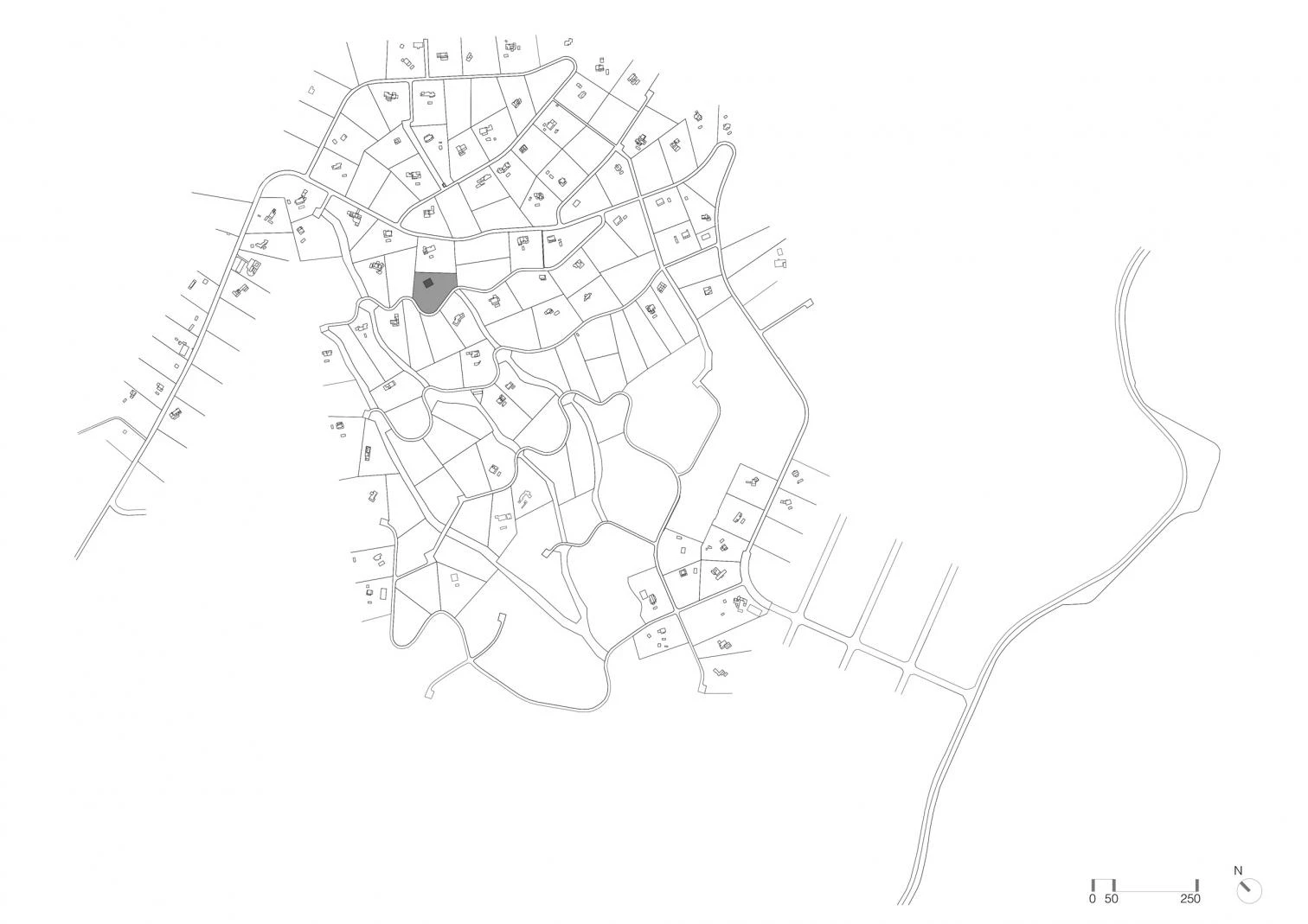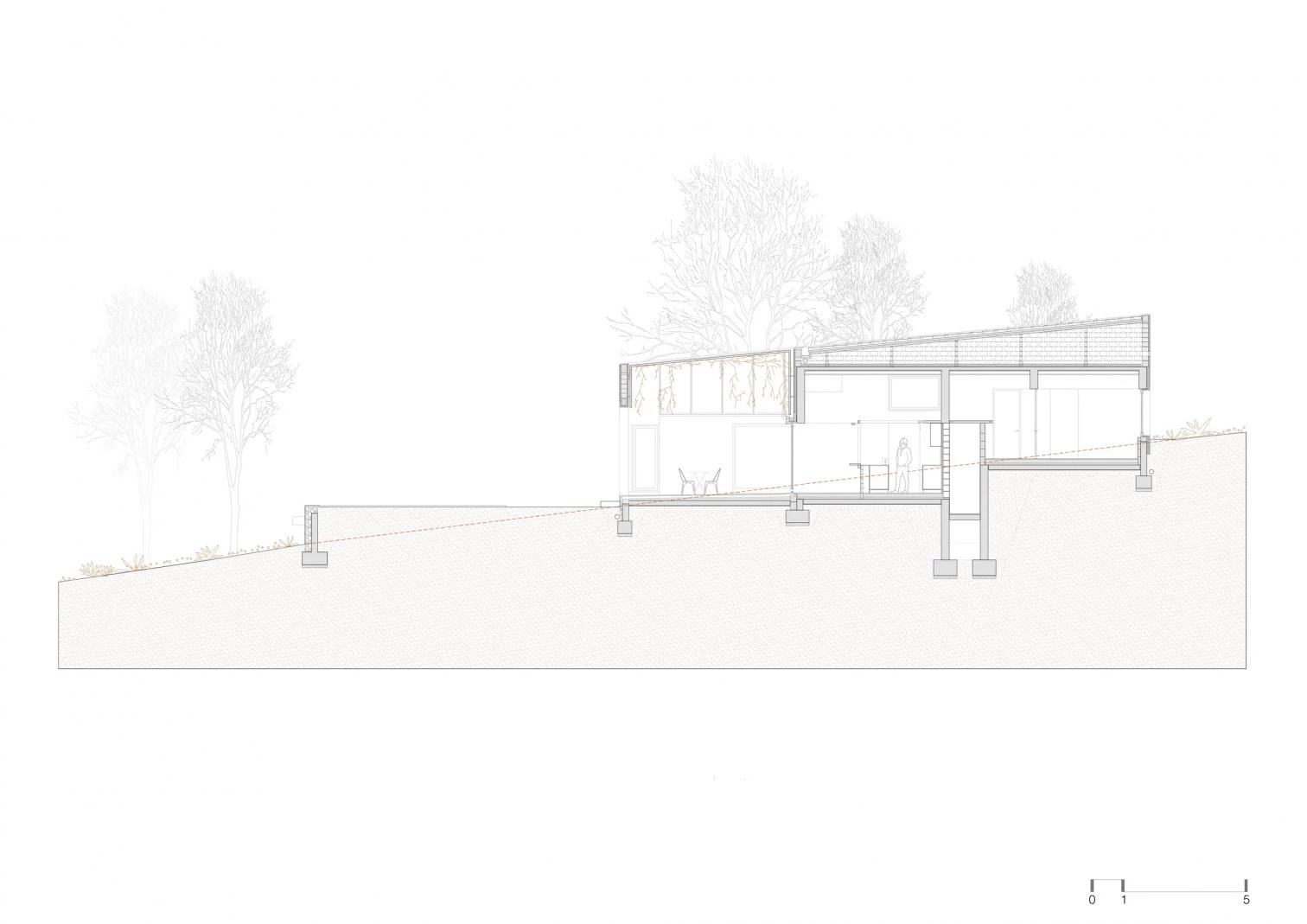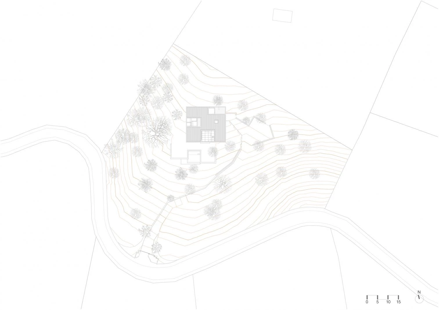 Con 298,68 metros cuadrados de superficie, la casa de volumetría sencilla consta de dos zonas privadas independientes, dado que las estancias de invitados son frecuentes. La planta de la edificación es casi cuadrada. Los espacios de uso privado, de anfitriones e invitados, idénticos en distribución y tamaño, se disponen en lados contiguos de la planta para garantizar la independencia que necesitan, separados por las zonas comunes, que se organizan a lo largo de un eje diagonal orientado hacia las vistas. La neutralidad exterior del volumen contrasta con el interior dinámico de la vivienda.