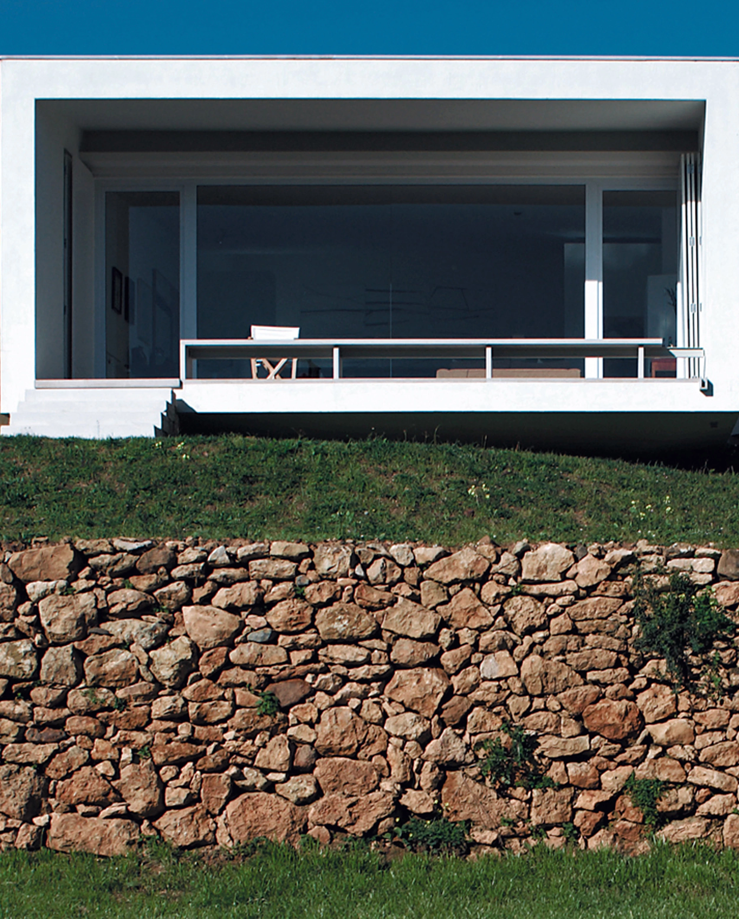 ARX PortugalLa vivienda se sitúa en Romeirão cerca de la pintoresca población costera de Ericeira, en un entorno rural salpicado de casas dispersas rodeadas por huertas y caminos cercados con muros de piedra. La parcela se ubica sobre una ladera abrupta, orientada al sur, en dirección a un valle surcado por un arroyo y cerrado por montañas. La acentuada pendiente cae en rampa en su parte superior y escalonadamente en la inferior, hallándose en la zona intermedia dos elementos que sirvieron como punto de partida del proyecto: un pequeña alberca para riego y un frondoso nogal.