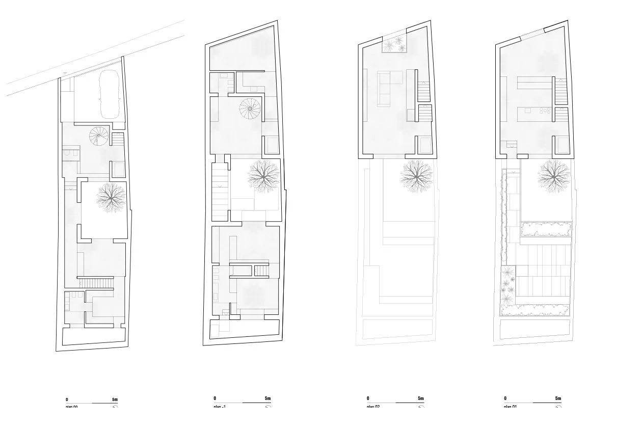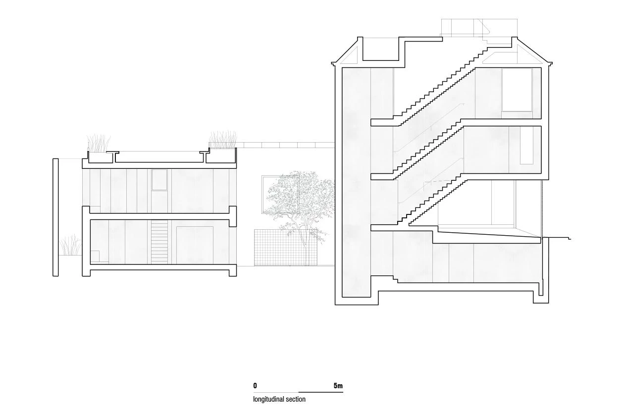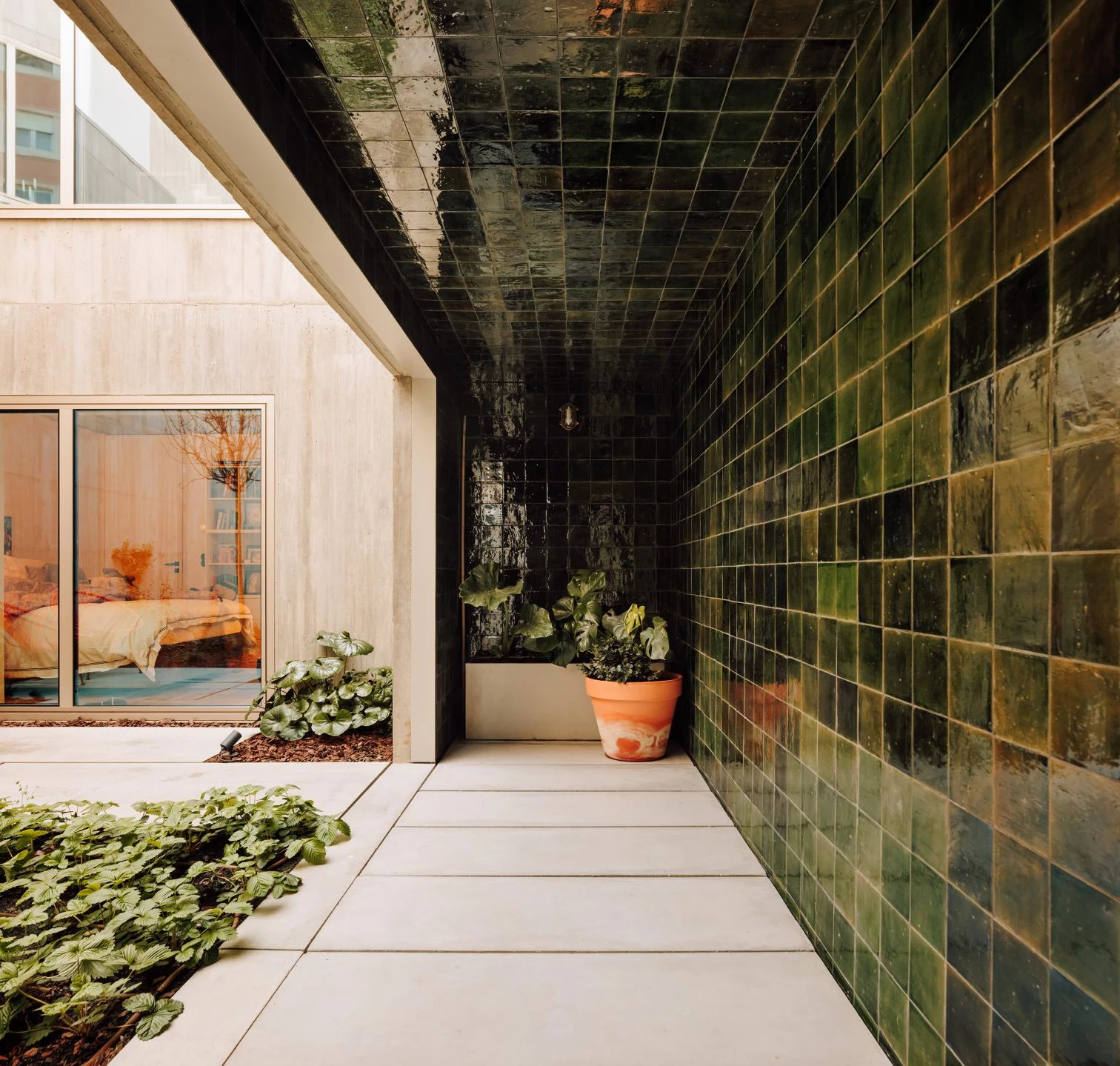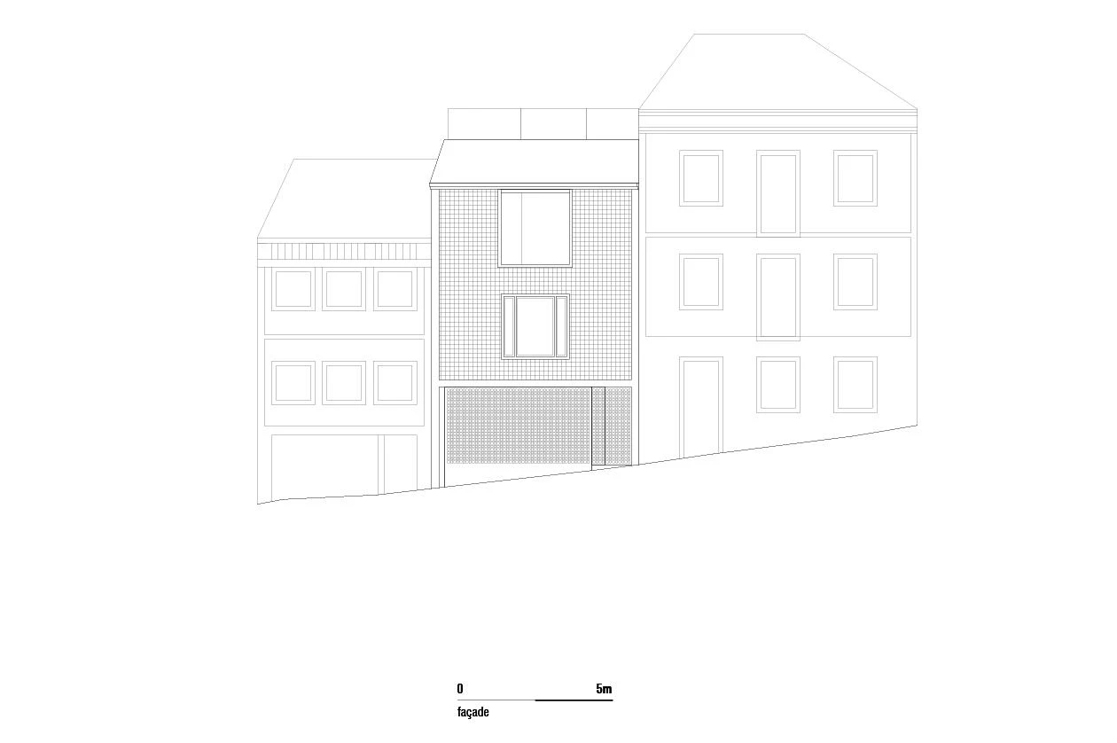 Con un lenguaje contemporáneo y respetando el entorno, esta casa se sitúa en el barrio lisboeta de Lapa, junto al Museu Nacional de Arte Antiga. En una parcela estrecha y alargada, la vivienda presenta una fachada con celosías de madera en las puertas de acceso y del garaje, mientras la parte superior revestida con piezas cerámicas queda recortada por la ventana del comedor y un hueco que alberga vegetación. La casa está compuesta por dos volúmenes que comparten un patio común. La construcción se desarrolla en diferentes direcciones, horizontalmente entre los espacios más privados, como los dormitorios, o verticalmente a través de los espacios comunes, hasta llegar a la cubierta y disfrutar de las magníficas vistas panorámicas sobre el río Tajo.