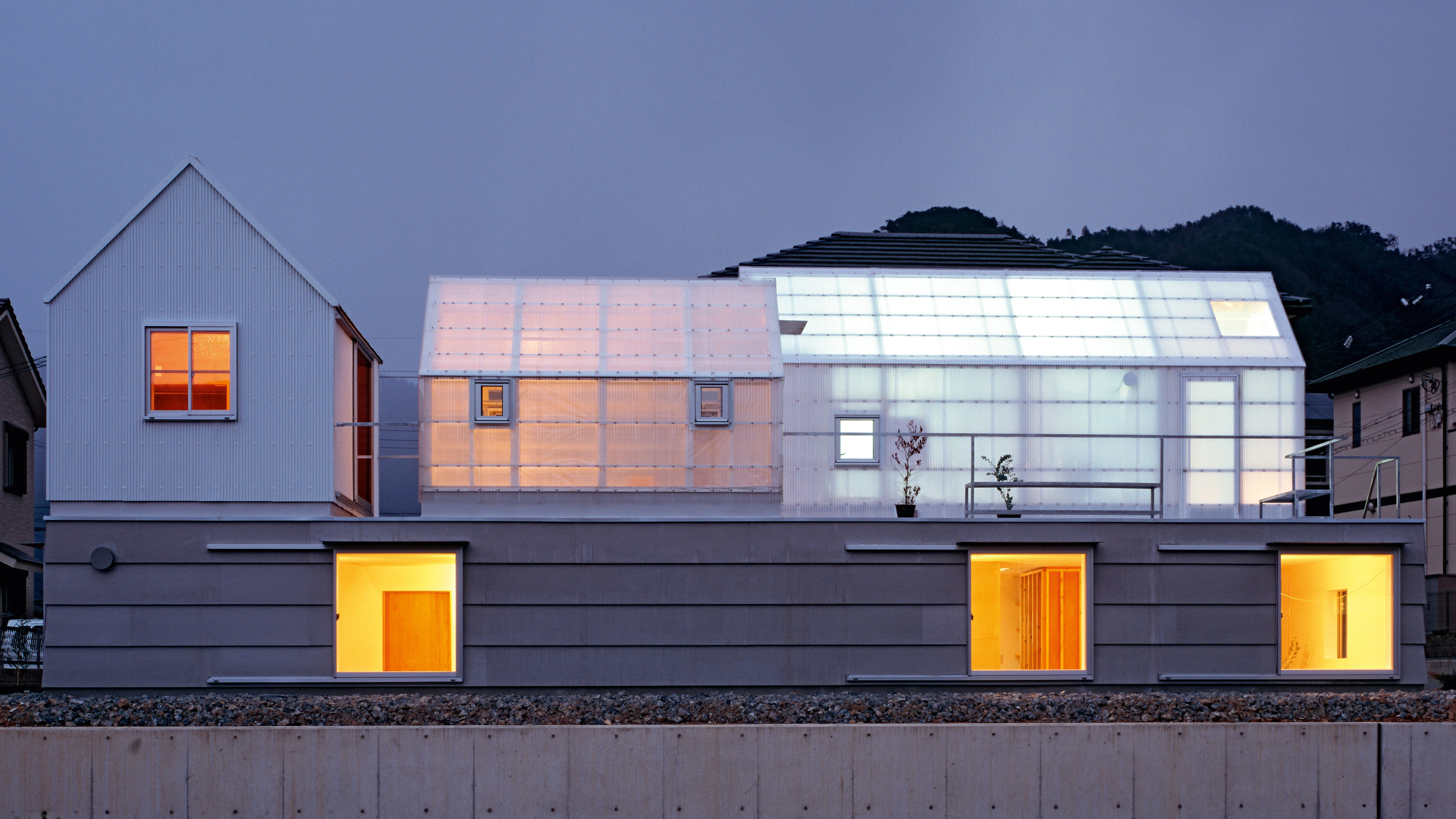 La organización en estratos también afecta al programa y a los materiales empleados. Así, mientras que el zócalo alberga la partes comunes de la casa y se construye con muros de hormigón armado, la parte superior contiene un baño, un solárium y una habitación de invitados, y está resuelta con una envolvente ligera y translúcida de paneles de policarbonato de sección corrugada dispuestos en una doble hoja.