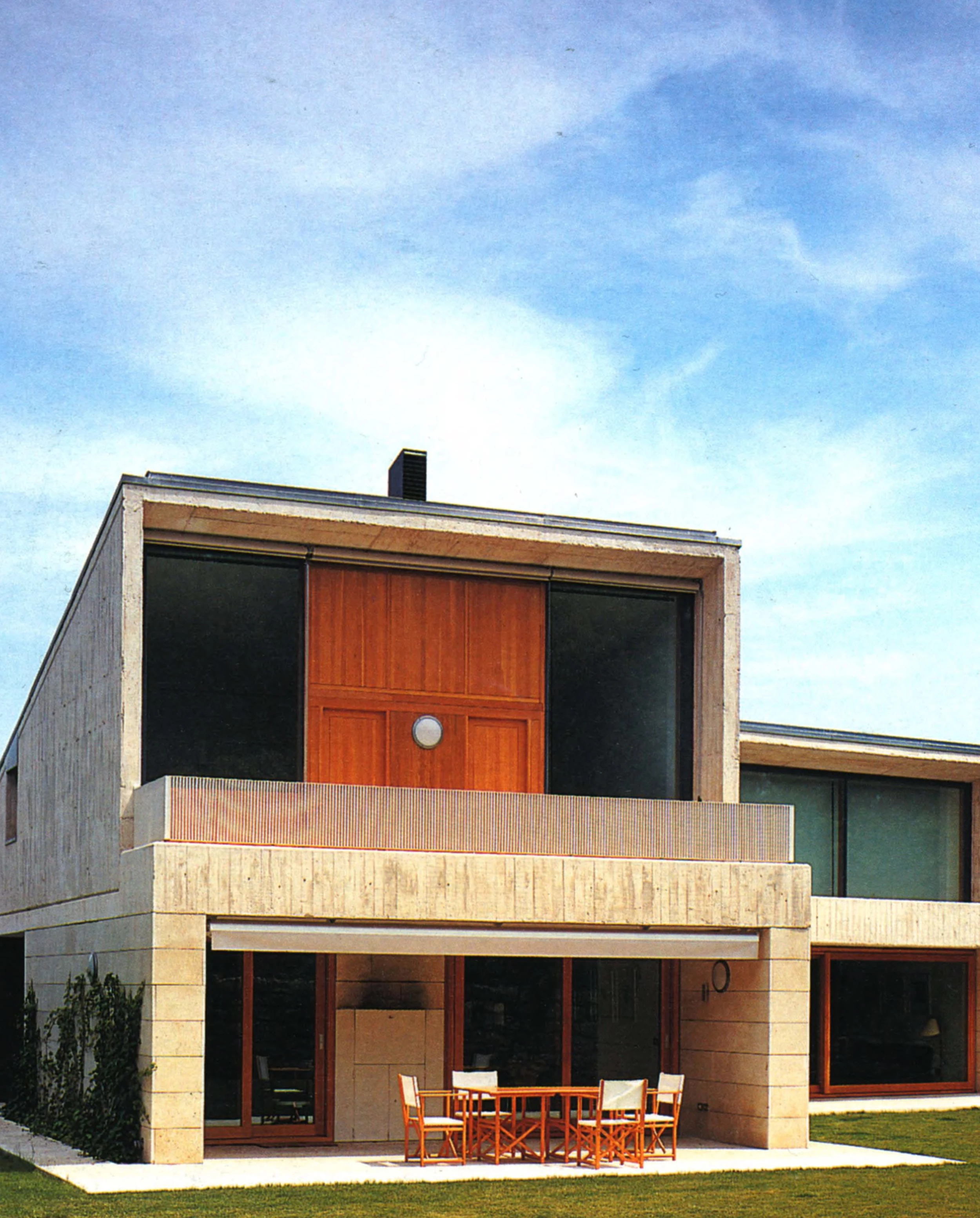 Sobre este basamento semienterrado se ha organizado el programa en tres volúmenes de hormigón orientados hacia el sur. Los dos más pequeños son sendas piezas paralelas de una planta y unidas por un porche común, y corresponden respectivamente al dormitorio principal y al salón; las cubiertas, de un solo faldón, ascienden hacia las fachadas sur acristaladas. El cuerpo mayor, de dos plantas, forma un pequeño ángulo con los otros. Dividido interiormente en dos mitades en sentido longitudinal, alberga en planta baja el comedor y la cocina, mientras que en la planta alta, bajo la cubierta inclinada y con salida a una terraza a sur, se organizan los restantes dormitorios.