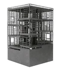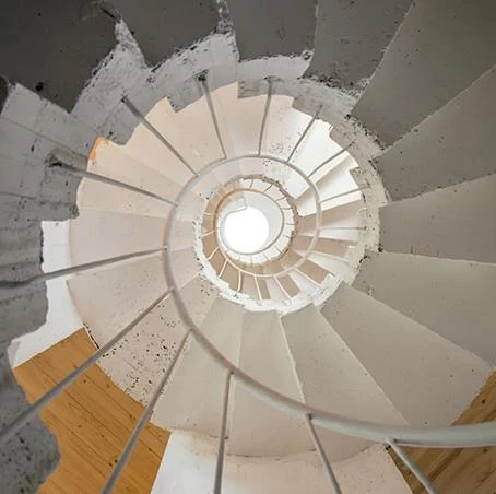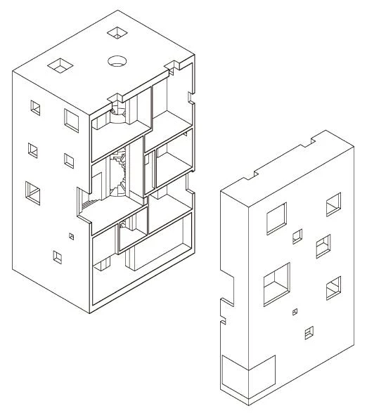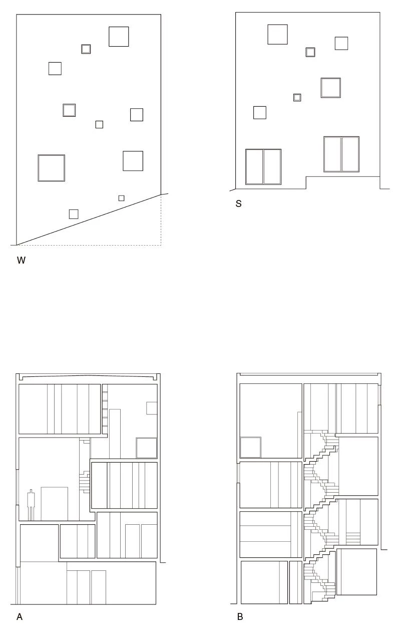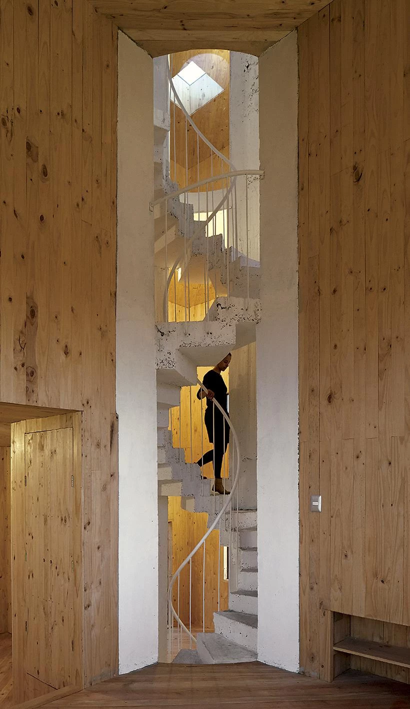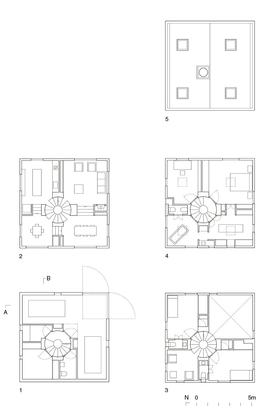 En un área suburbana recién poblada, esta casa para una pareja de matemáticos y sus dos hijos tiene una planta cuadrada dividida en cuadrantes asimétricos que se elevan en espiral hasta alcanzar cuatro plantas. Cuatro escalones (70 cm de altura) separan un cuadrante del siguiente. En el cruce de los muros habitables que dividen el interior se instala una escalera de caracol con un ojo central, escalones regulares y sin descansillos. Entre un recinto y el siguiente hay dos caminos: el de la escalera, que funciona como atajo diagonal que interrumpe las esquinas, y otro más suave que conecta los centros de cada recinto. En total son doce plataformas a diferente nivel, donde un giro de 360º equivale a una planta completa. La secuencia ascendente establece diferentes grados de intimidad y proximidad entre las funciones, que pasan de la cocina o un par de comedores a la altura del terreno a los dormitorios o el estudio en la parte más alta. Esta estratificación promueve la activación de ciertas estancias según las horas del día y una suerte de fricción familiar a lo largo del vacío central. Excepto la base, que contiene la tierra del jardín, esta casa de madera se apoya en la escalera, una pieza robusta de losas plegadas y cuatro pilares de hormigón armado que salvan toda la altura del volumen. En su base, el centro de la escalera coincide con el acceso diagonal a la casa.