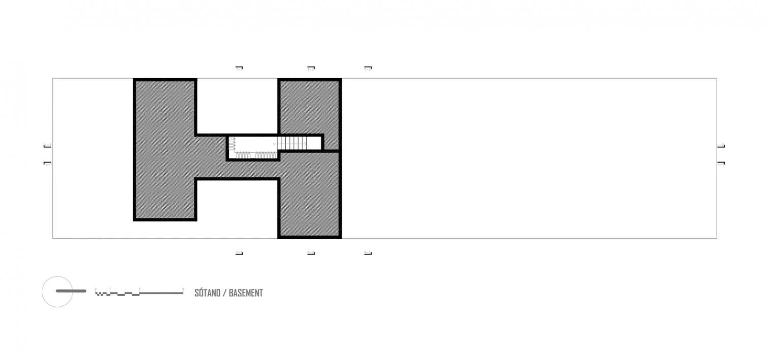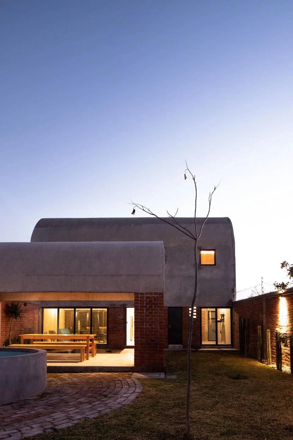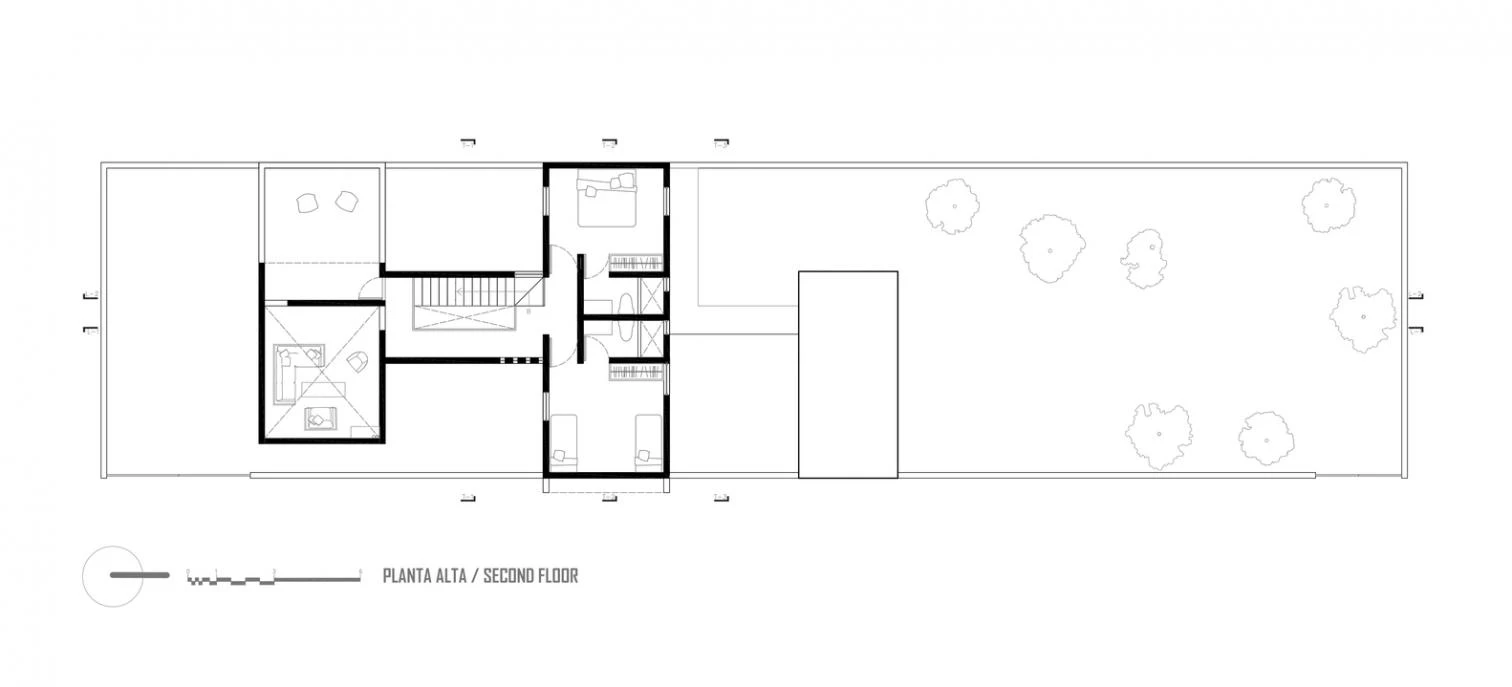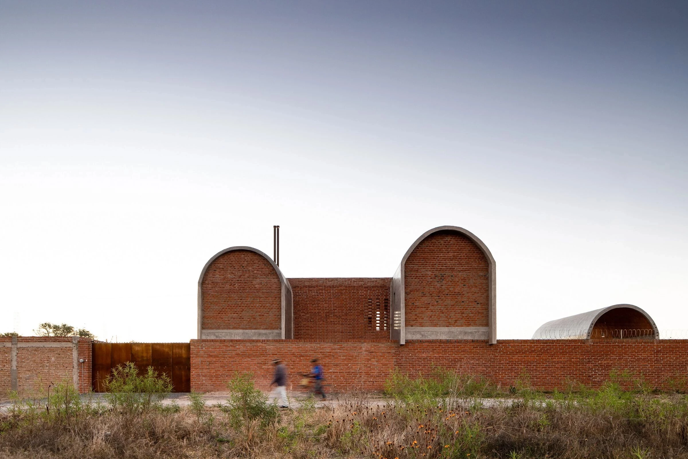 En una parcela larga y estrecha se dispone la pieza compuesta por tres cuerpos delimitados por bóvedas de barro, donde cada una de ellas funciona como una cabaña independiente para albergar diferentes usos. La forma alargada del terreno se aprovecha para yuxtaponer las zonas techadas y crear entre ellas espacios abiertos complementarios, a semejanza de una hacienda donde se entrelazan los patios y los jardines.