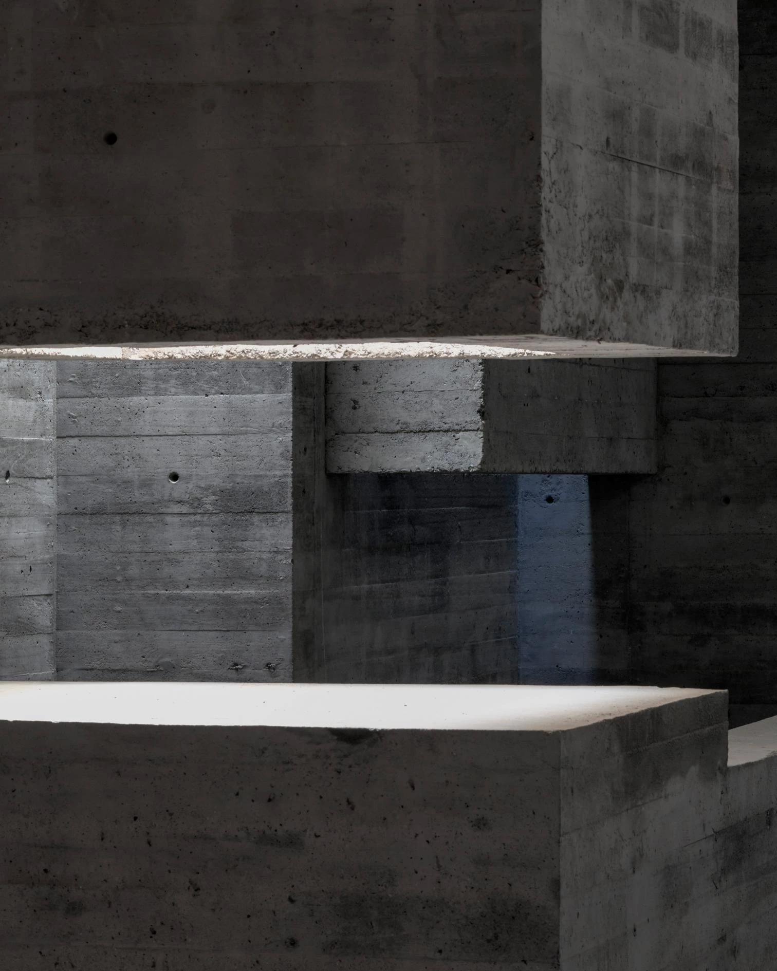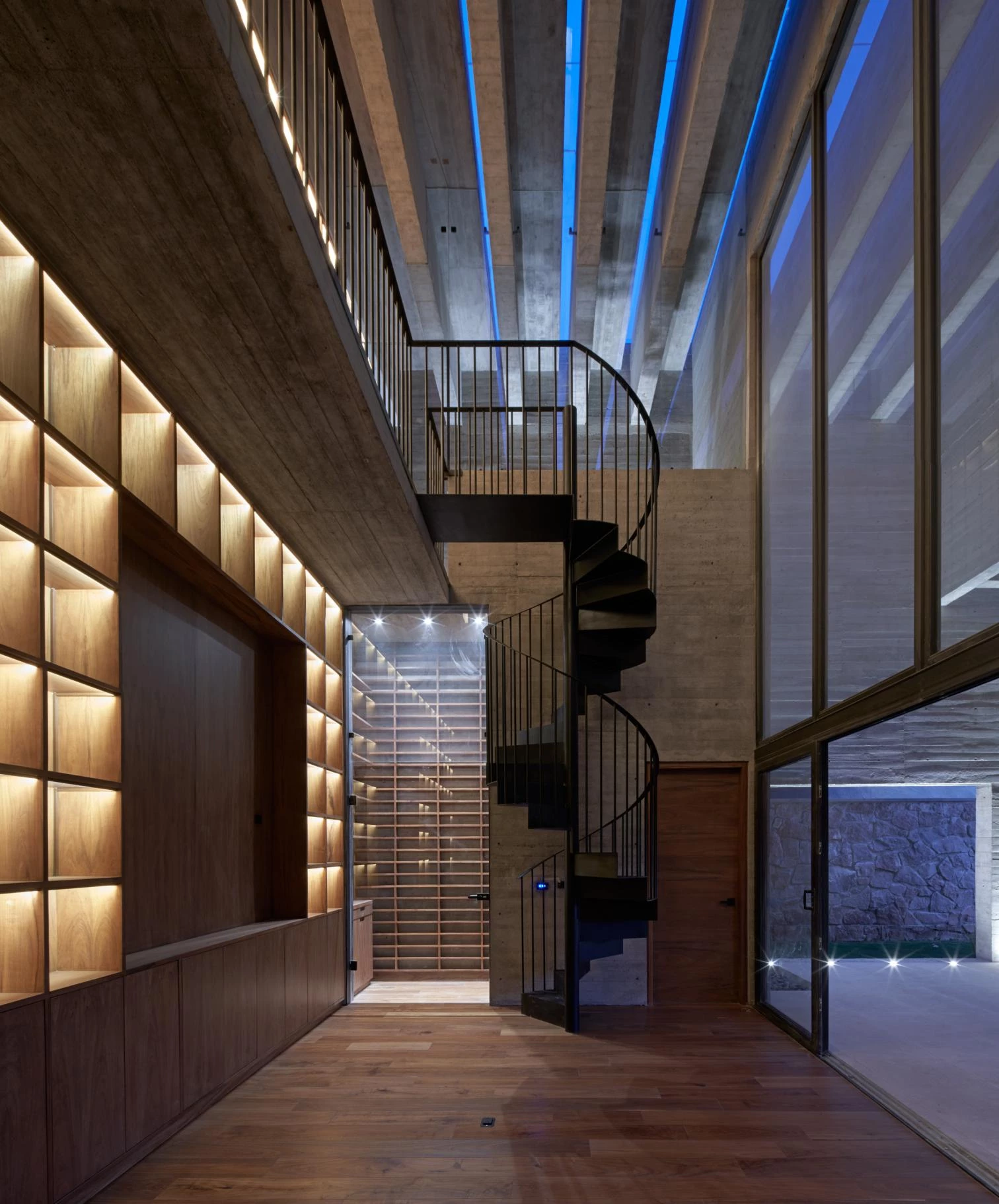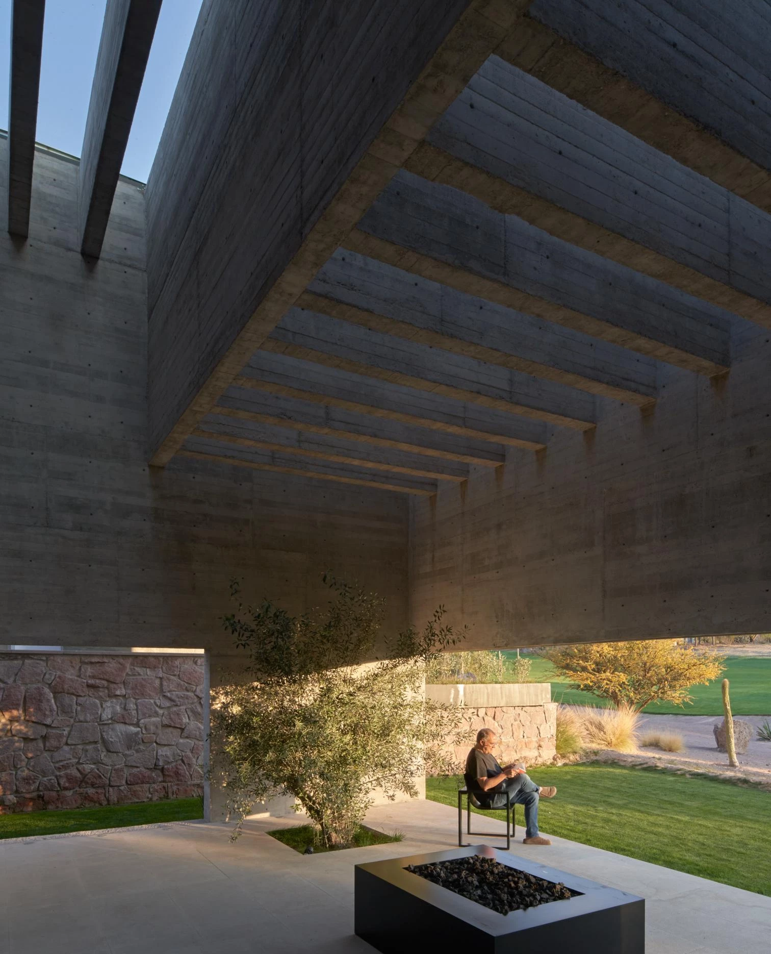 Las texturas de madera impresas en el hormigón trasladan formas orgánicas del entorno natural al interior doméstico. A ello se suma una paleta de materiales sobria que incluye travertino, acero, vidrio y madera.