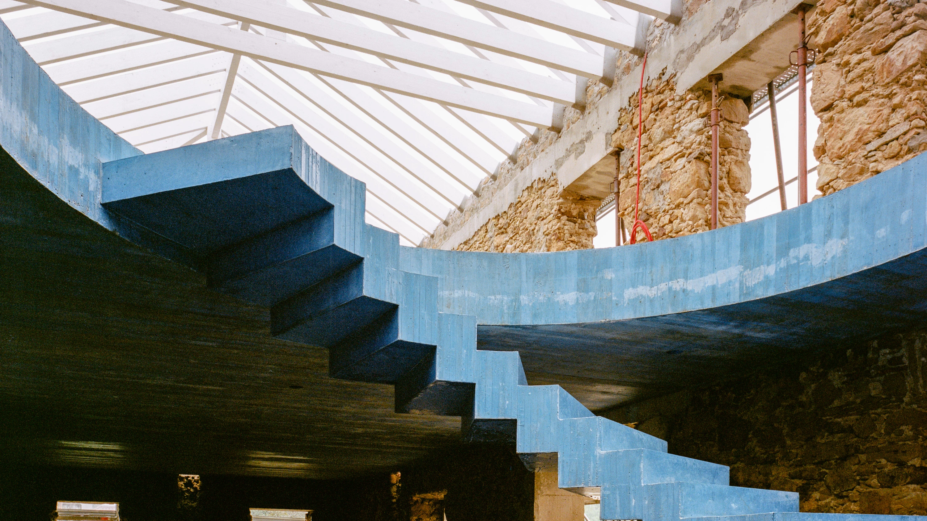 Originalmente, este edificio —actualmente en proceso de rehabilitación— contenía la bodega y la residencia de trabajadores y sirvientes de la Quinta de Recreio. El volumen existente constaba de diferentes segmentos divididos conectados con diversas escaleras. A pesar del complejo y profundo proceso de transformación, el programa mixto de bodega y residencial se mantiene, convirtiéndose en este caso en una única vivienda. La normativa vigente no permitía la alteración del volumen ni tampoco de las fachadas, que se han conservado. Tras vaciar completamente la preexistencia, manteniéndose en pie tan sólo los muros exteriores, se insertó una estructura de hormigón pigmentado azul dentro del volumen original. Esta estructura parte desde el sótano, donde se ubica la bodega, y asciende en forma de escalera helicoidal, formando también los forjados, hasta llegar a la primera planta bajo un lucernario que baña el hueco de la escalera. Este gesto reconfigura el espacio interior y articula el funcionamiento del conjunto. La planta baja es un espacio abierto donde se ubican la cocina, comedor y estar principal, organizados alrededor de la escalera. La planta primera aloja dormitorios en ambos extremos, mientras que dispone de una zona de salón auxiliar en el ámbito de influencia del lucernario...[+]