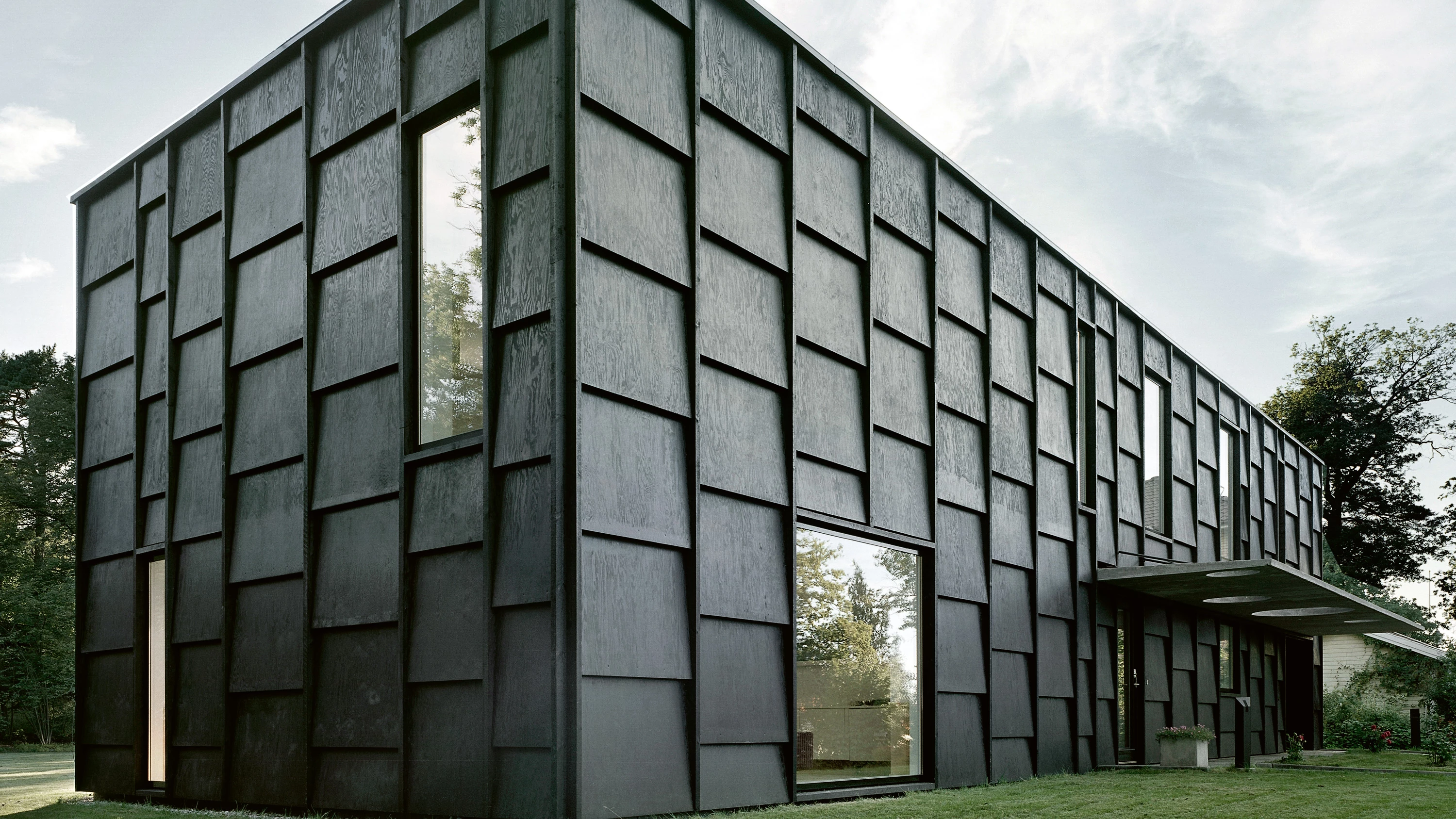 A las afueras de Estocolmo se ha construido este estrecho y alargado paralelepípedo de dos niveles que aloja una vivienda unifamiliar. Debido su disposición en el sitio, colocada de forma perpendicular a la entrada de la parcela, la casa se experimenta casi exclusivamente en un ángulo frontal, dotándola de una apariencia abstracta como si se tratara de un muro o de una línea habitada. La escasa profundidad del volumen permite la entrada de luz desde diferentes orientaciones, un efecto reforzado gracias a las dobles alturas que, además, proporcionan visiones diagonales del interior. El movimiento a través de la casa se caracteriza por atajos visuales, espacios y actividades que se superponen. La entrada, aseos, cocina, y escaleras conforman una banda de servicios que permite liberar el resto de la planta baja para acoger las funciones más públicas. Mientras, las zonas más privadas se organizan en la planta superior. A nivel constructivo, la estructura se realizó en hormigón in situ, que sólo permanece expuesto en la marquesina de entrada, un voladizo de apenas siete centímetros de espesor. Por su parte, la envolvente exterior está formada por paneles de madera contrachapada de 18mm teñidos de negro (600/900/1200x900 mm), montados sobre una subestructura de listones de madera pino (50x150 mm)...[+]