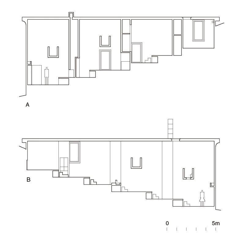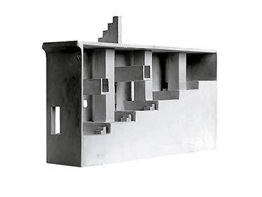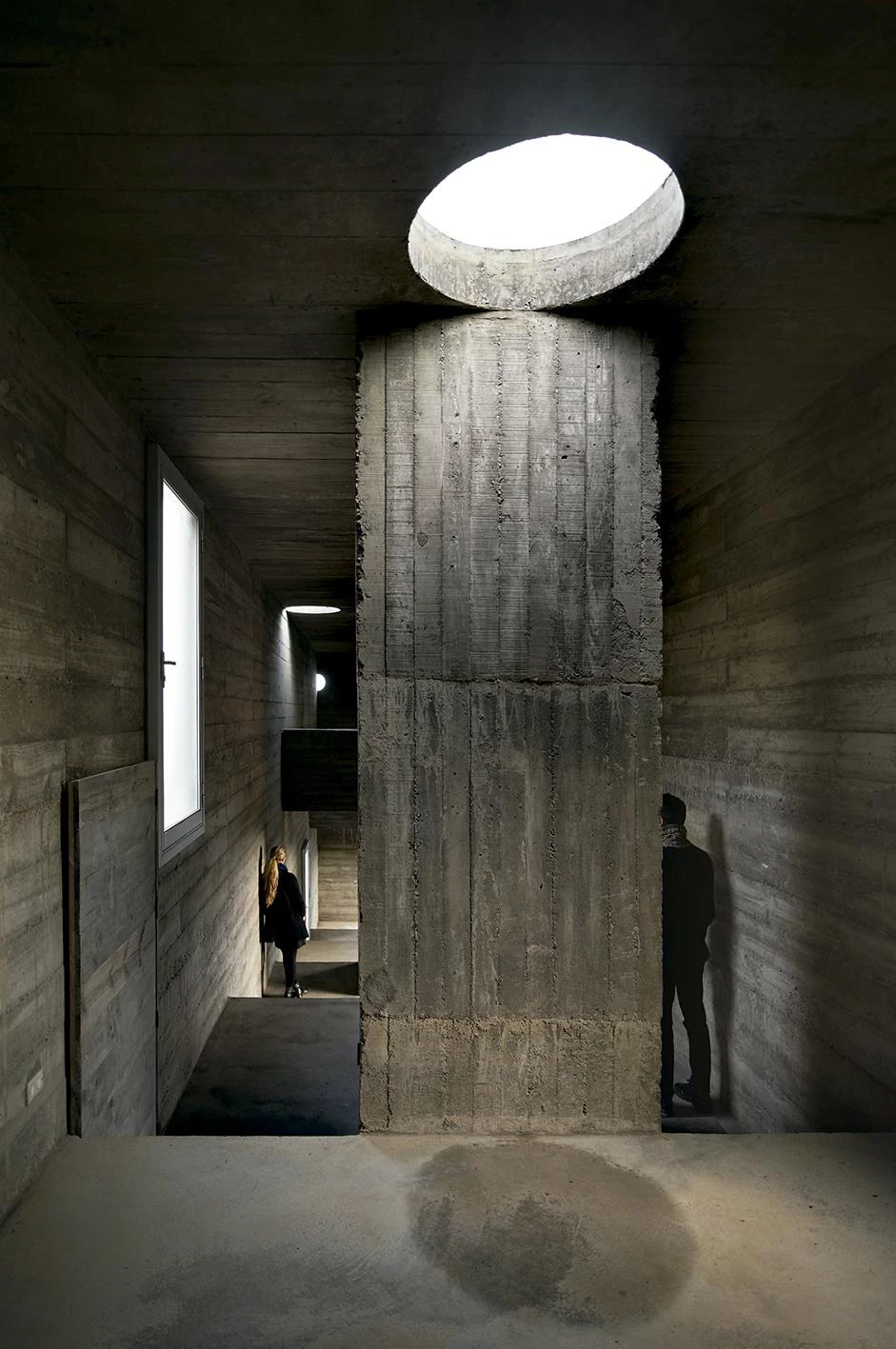 El largo volumen tiene un modesto régimen de huecos a los lados, con lucernarios puntuales, unas perforaciones de media luna que se podrían usar como relojes de sol y sólo una ventana de esquina partida por un pilar redondo. Esta es la única ventana con vidrios sin marco enrasados a la cara exterior del hormigón. Espejando el ocaso, una roca descansa flotando, casi imposible y ficticia, sobre aquellos reflejos.