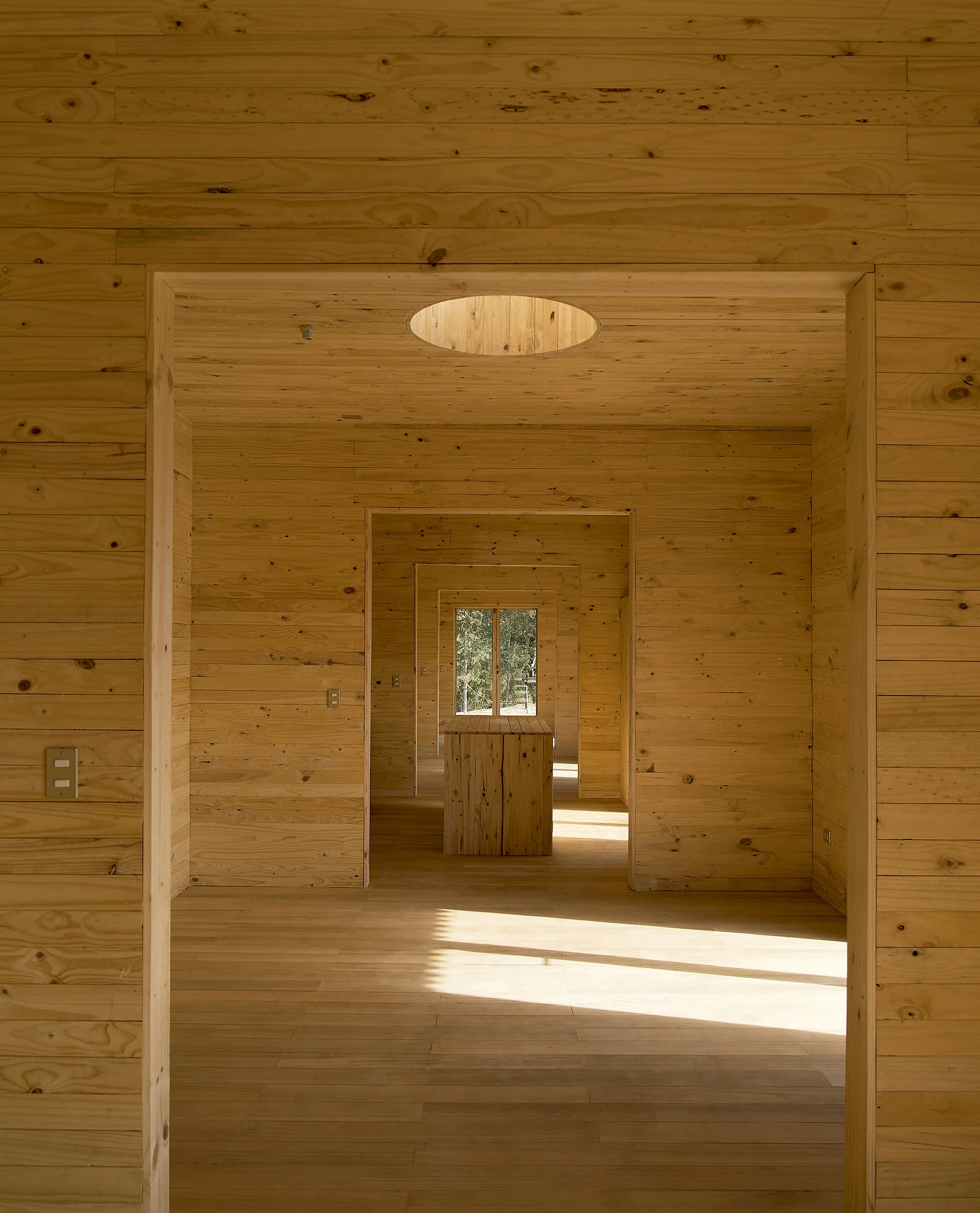 Proyectada originalmente para uso permanente, la casa se transformó en otra, ya no de hormigón, un tercio más pequeña y de uso eventual. Aun así se buscó que mantuviera la presencia luminosa y distendida y que su trazado siguiera una suerte de huella ficticia de la anterior. Sobre el mismo podio artificial existente, la nueva casa se extiende horizontalmente siguiendo el paso de un sinuoso río a los pies del cerro. La posición dominante de esta pieza establece una doble frontalidad que su interior articula mediante una secuencia regular de habitaciones iguales. Hacia el paisaje abierto se despliega una serie continua de funciones comunes y hacia el cerro inmediato otra discontinua de funciones individuales. Cada frente tiene cinco habitaciones con un régimen de aperturas en los muros exteriores indiferente a su orientación o a su programa y otro régimen irregular de aperturas interiores relativa a los grados de privacidad entre cada recinto. Ambas secuencias se estructuran mediante otro sistema de aperturas en los techos que tensionan diagonalmente la percepción de la profundidad de la planta. El centro de la casa se desdibuja mediante dos perforaciones tangenciales que apenas unifican las habitaciones de cada lado. La cubierta perforada se extiende más allá del interior y separa los cuatro frentes con una sombra pesada.