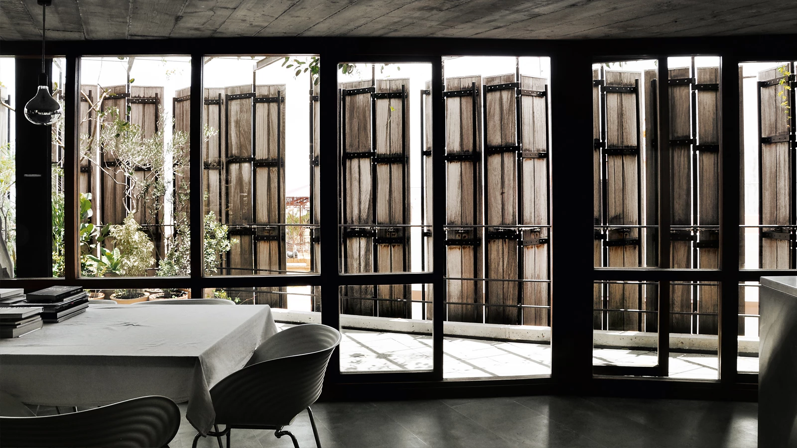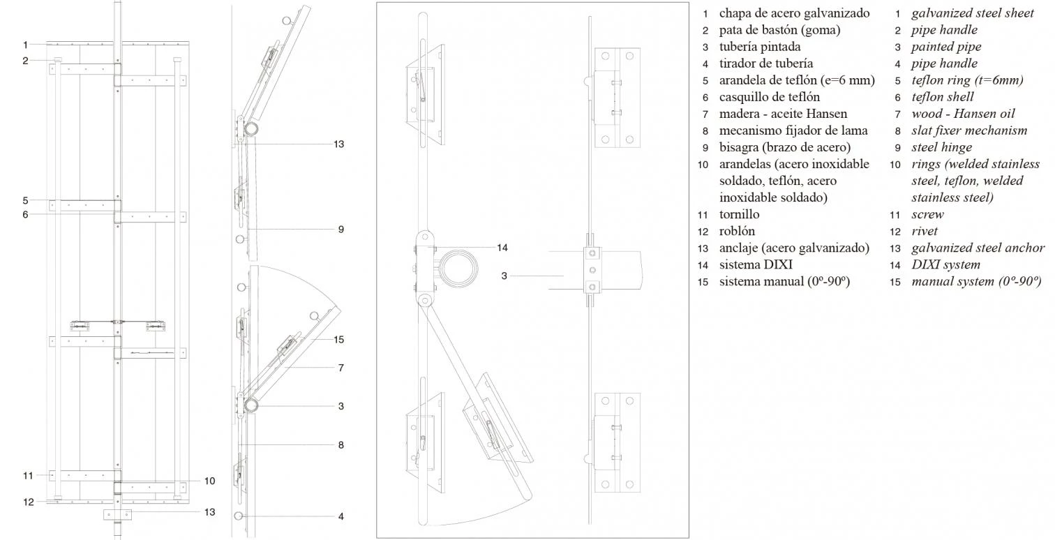 El gesto único del que surge la envolvente del edificio apoya su expresión en la presentación del material sin apenas ser manipulado; el hormigón, la piedra y el acero se recrean en su propia textura del mismo modo que lo hace la madera, verdadera protagonista del proyecto. Un mecanismo metálico permite plegar las lamas por pares perpendiculares a la fachada, de manera que puede quedar completamente cerrada o permitir el paso de la luz y las vistas convirtiéndose en un filtro superpuesto por el exterior. La impronta de la madera está presente también en el hormigón de fachada, para el que se ha usado un encofrado de tablilla de despiece horizontal. La mampostería irregular de las medianeras, incorporada puntualmente a algunos interiores, remata esta propuesta en la que material y forma definen una arquitectura de texturas, que retiene en sus superficies la luz y reclama ser percibida al tacto.