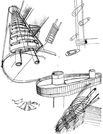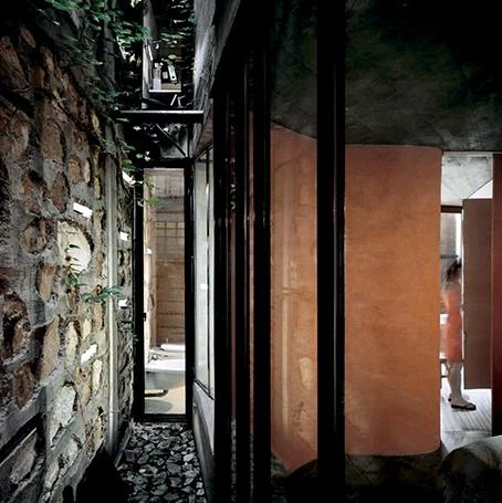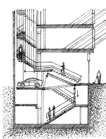 El eje de la escalera, de hormigón y acero reciclado, se cuelga del último piso. Su directriz curva se desarrolla sin tomar contacto con las paredes medianeras, dando lugar al patio, de sección variable.