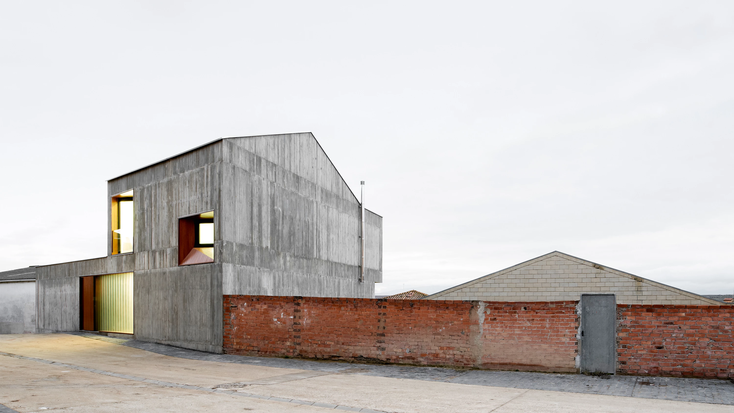 El programa de esta casa —cuyo proyecto fue seleccionado por los propietarios tras una especie de concurso— corresponde a las necesidades de un matrimonio con dos hijos pequeños, que han decidido vivir en un pueblo pequeño. La respuesta a sus demandas ha sido un volumen sencillo, de carácter monolítico y condición pétrea, cuya geometría arquetípica descansa en el uso de dos familias de materiales: el hormigón cuya textura evidencia las marcas del encofrado de tablillas, y el pino tintado que reviste las jambas de los huecos.