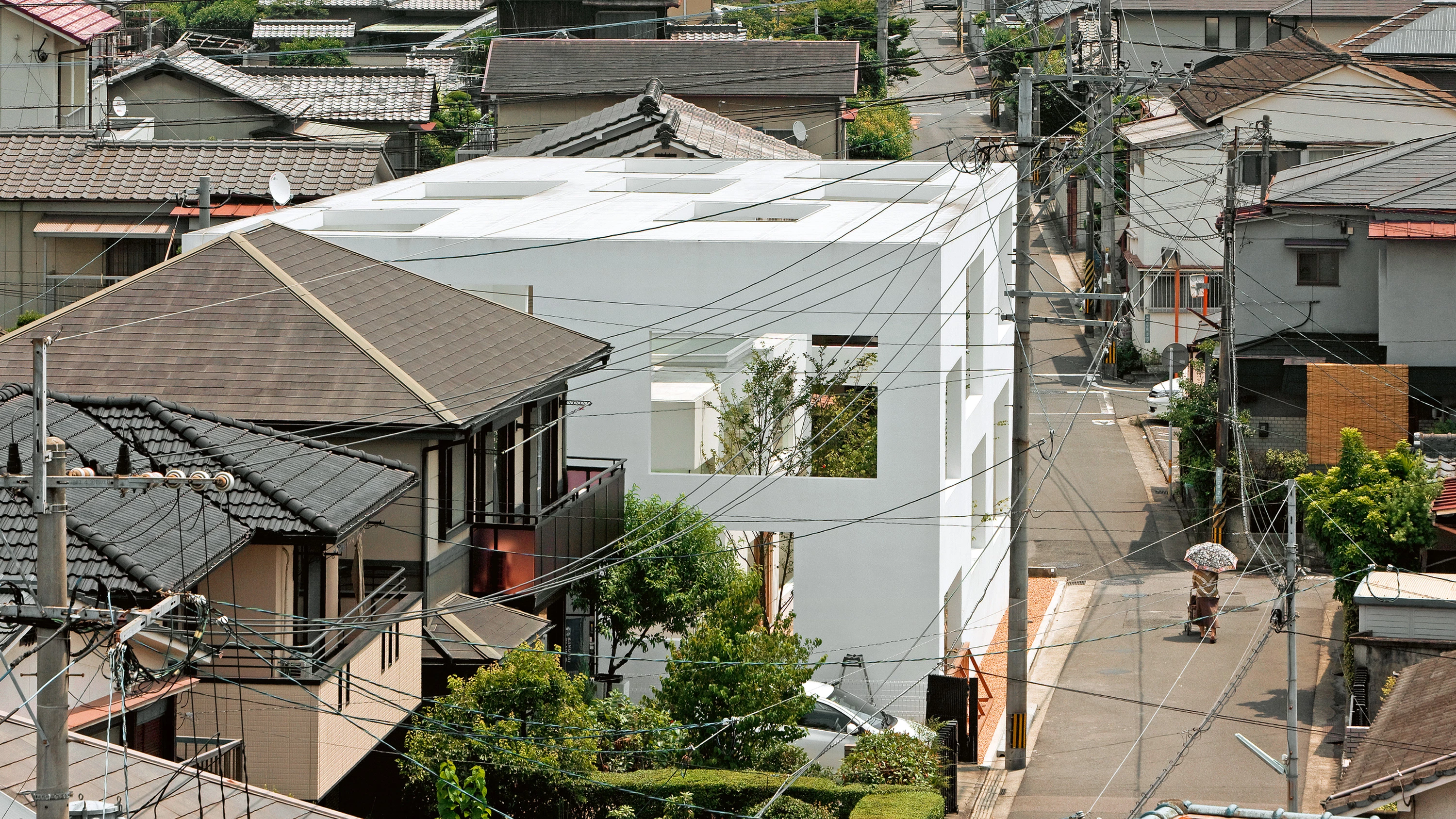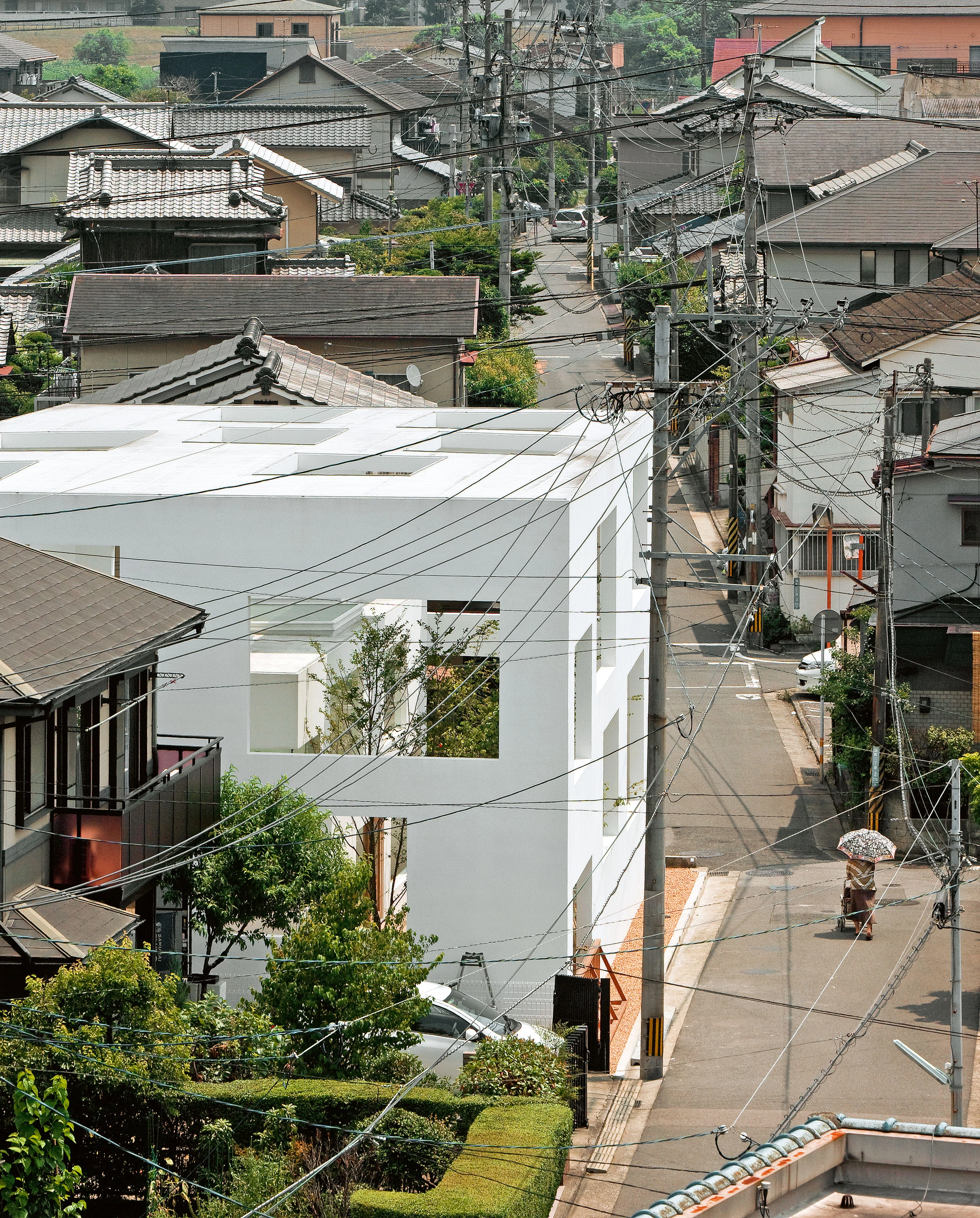 Esta casa para una pareja y un perro está formada por tres cáscaras de tamaño progresivo anidadas una dentro de otra. La envolvente externa abarca toda la superficie, creando un jardín cubierto. El segundo caparazón limita un espacio dentro del anterior. Y, a su vez, el tercero encierra un recinto todavía más pequeño e íntimo. Los residentes construyen su vida dentro de esta gradación que genera rincones con diferentes niveles de privacidad. El proyecto cuestiona la idea de que el ámbito público y el privado estén separados por un solo muro, y plantea la posibilidad de que el espacio de transición se amplíe, multiplicando las sensaciones de distancia entre el interior y el exterior. Vivir en esta casa recuerda, por tanto, a vivir entre las nubes. No hay barreras definidas, tan solo un cambio progresivo de un recinto a otro.