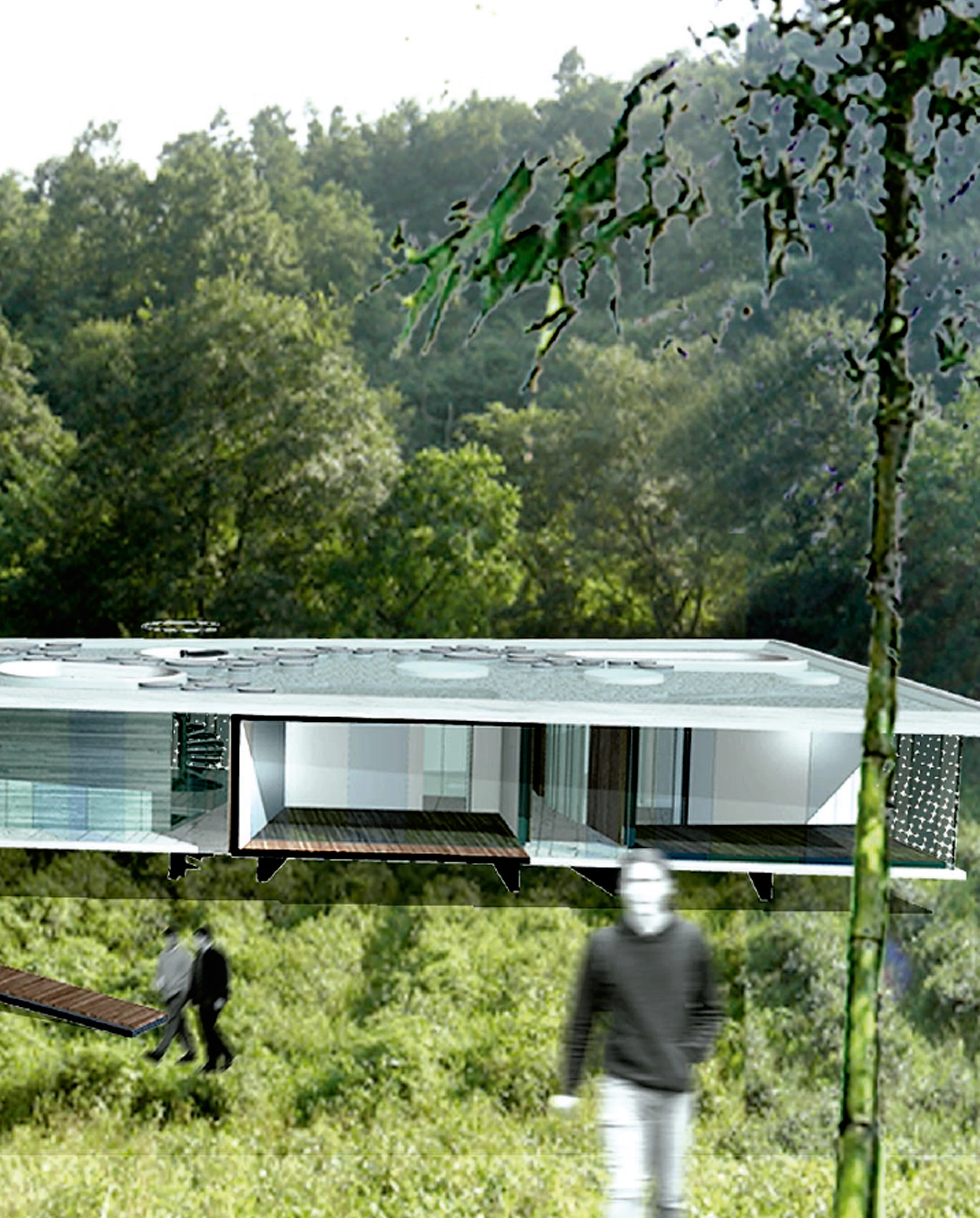 Tres niveles ponen en conexión la casa con el exterior, caracterizado en esta particular parcela por un arroyo y un bosque en el lado sur, por un camino de circunvalación en los lados norte y oeste, y por otra parcela en el lado este. Haciendo frente a la suave inclinación del terreno, los soportes verticales definen el nivel inferior, en el que se ubican los automóviles y la sala de instalaciones. En el nivel superior, que comparte altura con las copas de los árboles, se encuentran las habitaciones, contenidas en cinco cajas independientes de madera —con los baños asociados a ellas en cubículos de vidrio translúcido— de manera que el resto del programa queda alojado en una planta liberada de particiones y pasillos, que se abre en distintos ángulos al paisaje. El tercer nivel es el de la terraza, constituido por un estanque de treinta centímetros de profundidad y numerosas plantas acuáticas, entre las que discurre, sorteándolas, un paseo con puntos de parada para sentarse, descansar o contemplar.