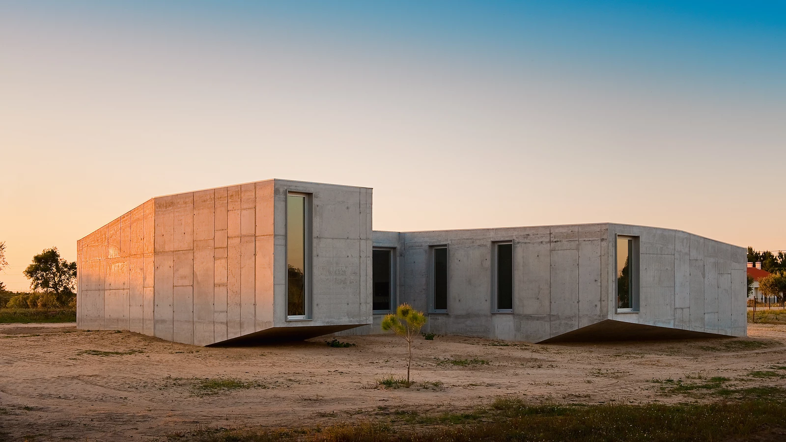 Estas condiciones preexistentes son las que determinan la forma en molinillo de viento de la vivienda, que busca así maximizar las vistas, separar las zonas de día y de noche, y protegerse del sol generando un patio en sombra entre dos de sus brazos. Igualmente, la inclinación del sol tiene consecuencias directas en la expresión volumétrica del edificio, cuyos brazos vuelan ligeramente sobre el terreno. Estas inclinaciones en la línea de contacto con el suelo tienen un eco en el perfil de la cubierta, que también se quiebra para unir las cumbreras de cada pieza, de diferentes alturas. Así, la topografía natural reverbera en la forma de la casa, cuya expresión plástica se hace más intensa. Constructivamente, el proyecto bebe de las enseñanzas del Movimiento Moderno y, muy especialmente, de Le Corbusier, optando por la materialidad rotunda y sobria del hormigón armado visto.