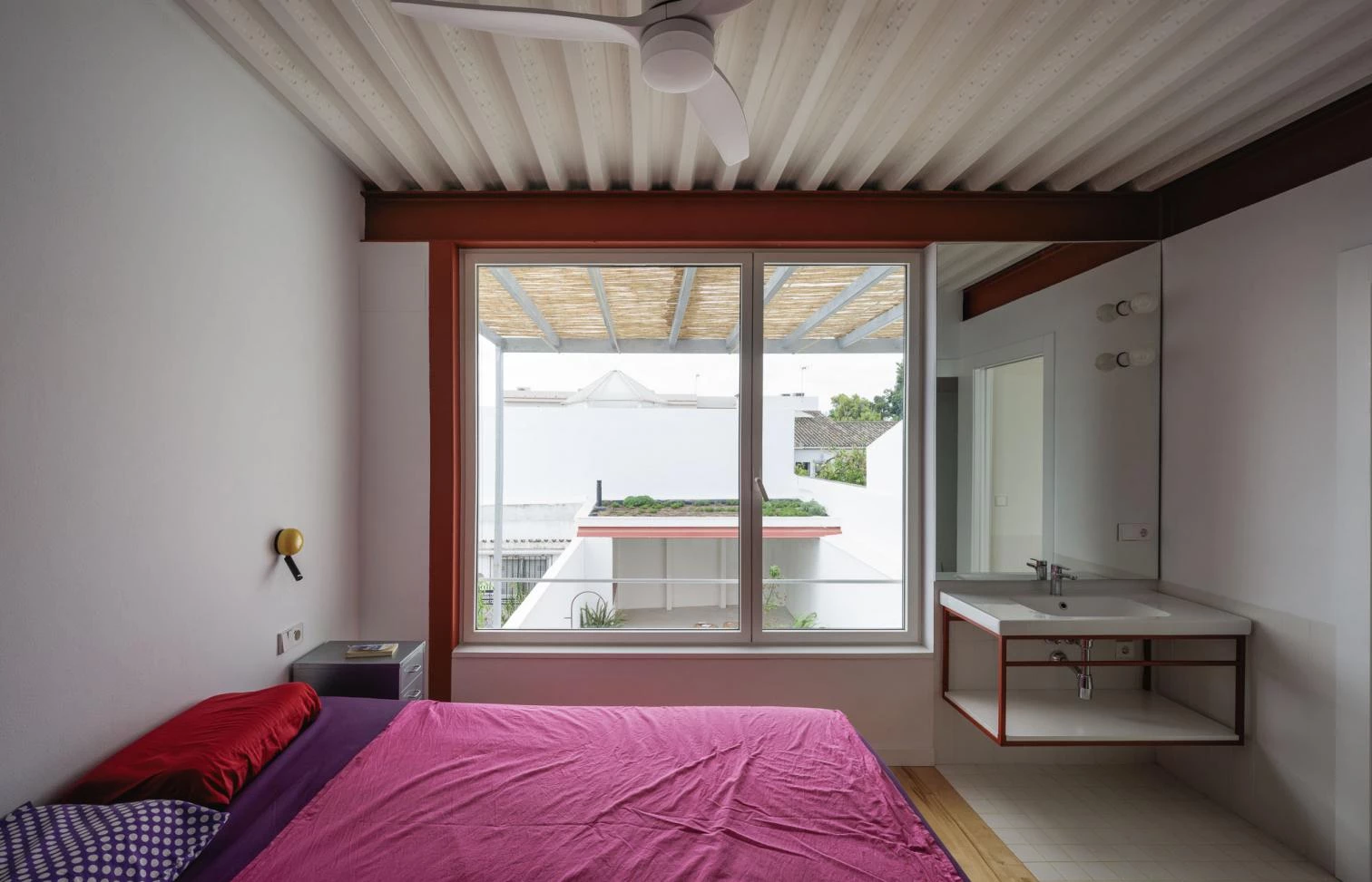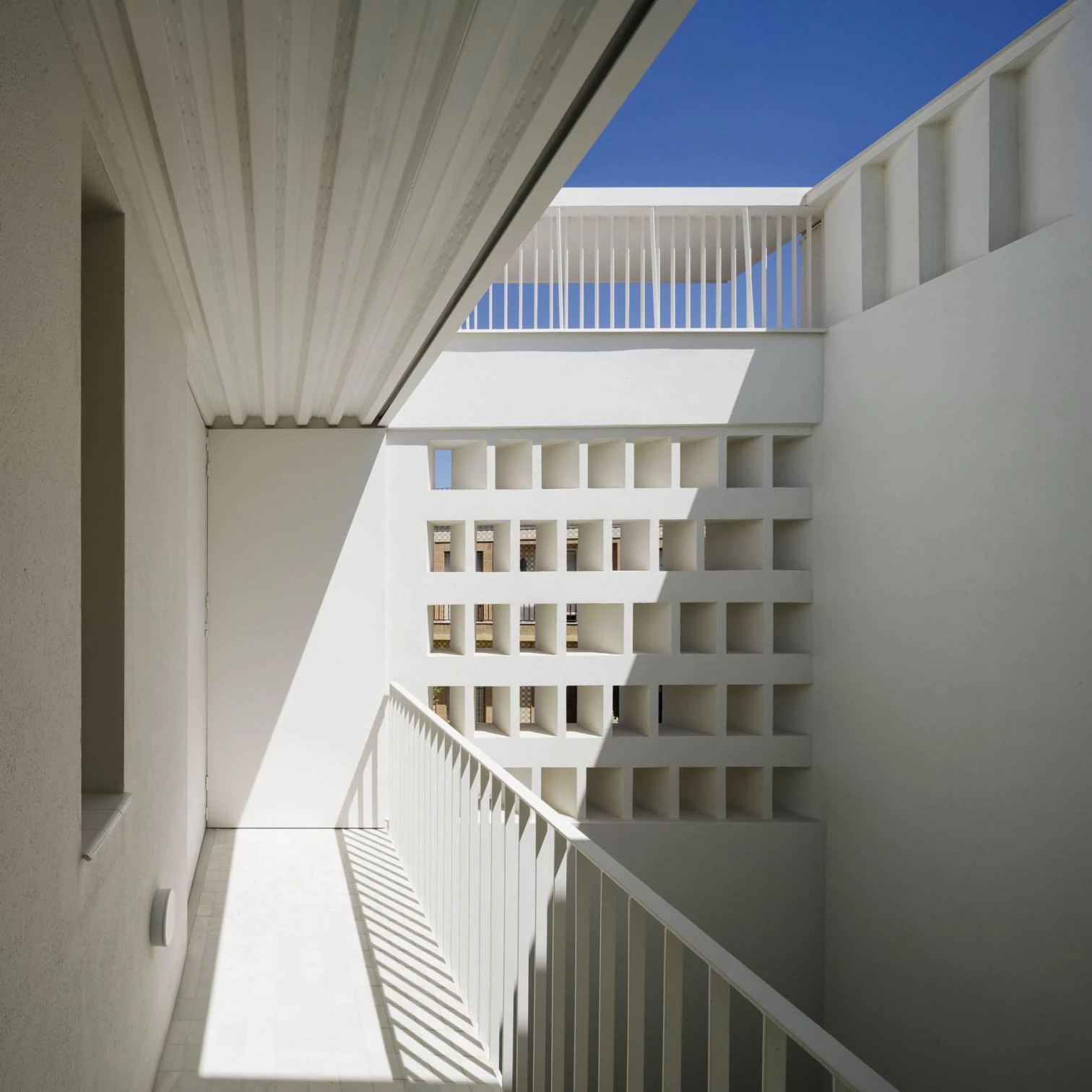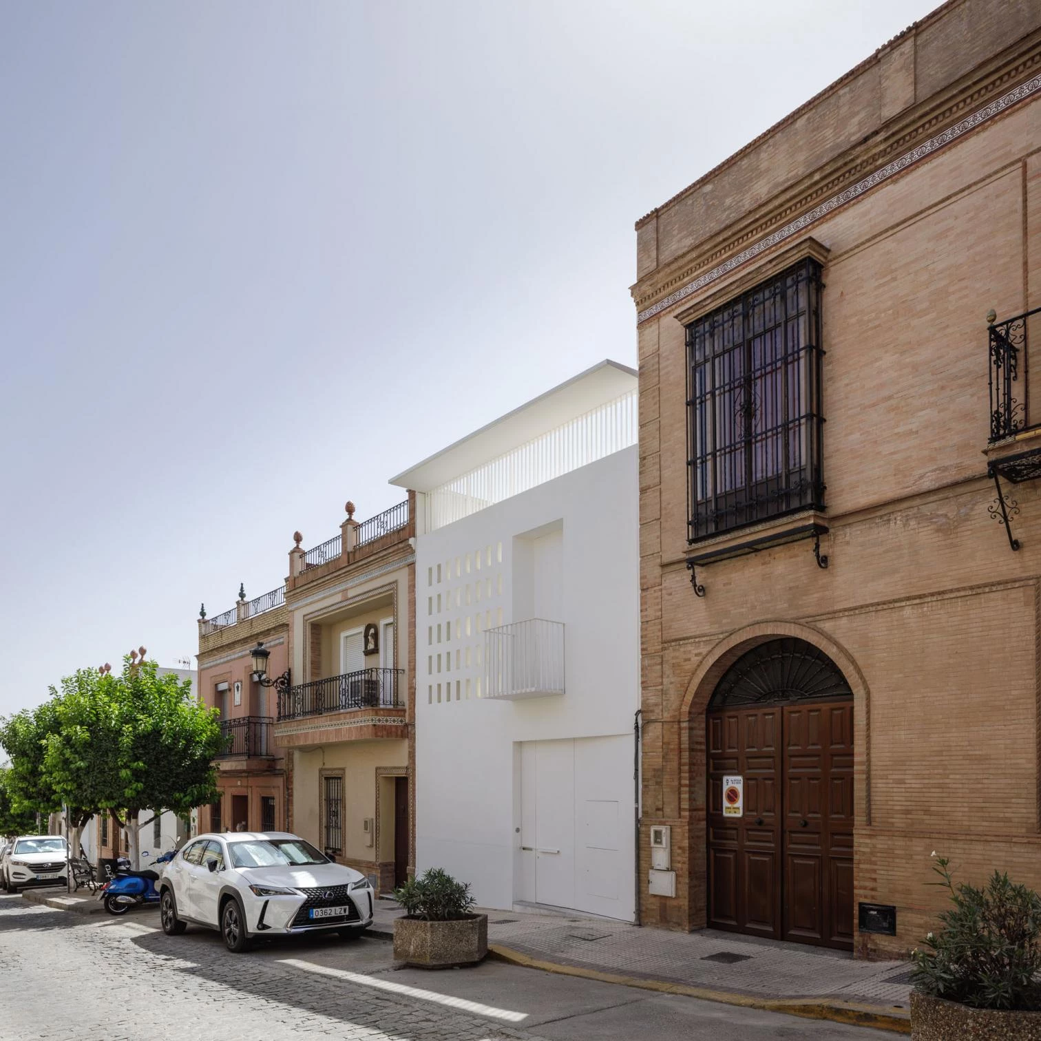 El pórtico tipo retranquea los apoyos respecto a las medianeras para evitar conflictos con los muros de carga de las casas vecinas, y el espacio resultante entre esta línea estructural y las lindes longitudinales se ocupa con el equipamiento, y los espacios técnicos y de almacenaje, generando dos bandas laterales desiguales en los límites de la vivienda. Al exterior, la casa se muestra a la calle como una construcción masiva y blanca que reinterpreta la tradición constructiva local a través de diferentes elementos: una cornisa-visera, un friso, un balcón que avanza sobre la calle, el muro calado y el postigo de la puerta desde el que atisbar el patio-zaguán.