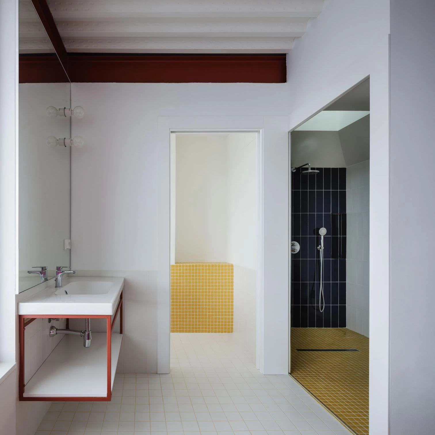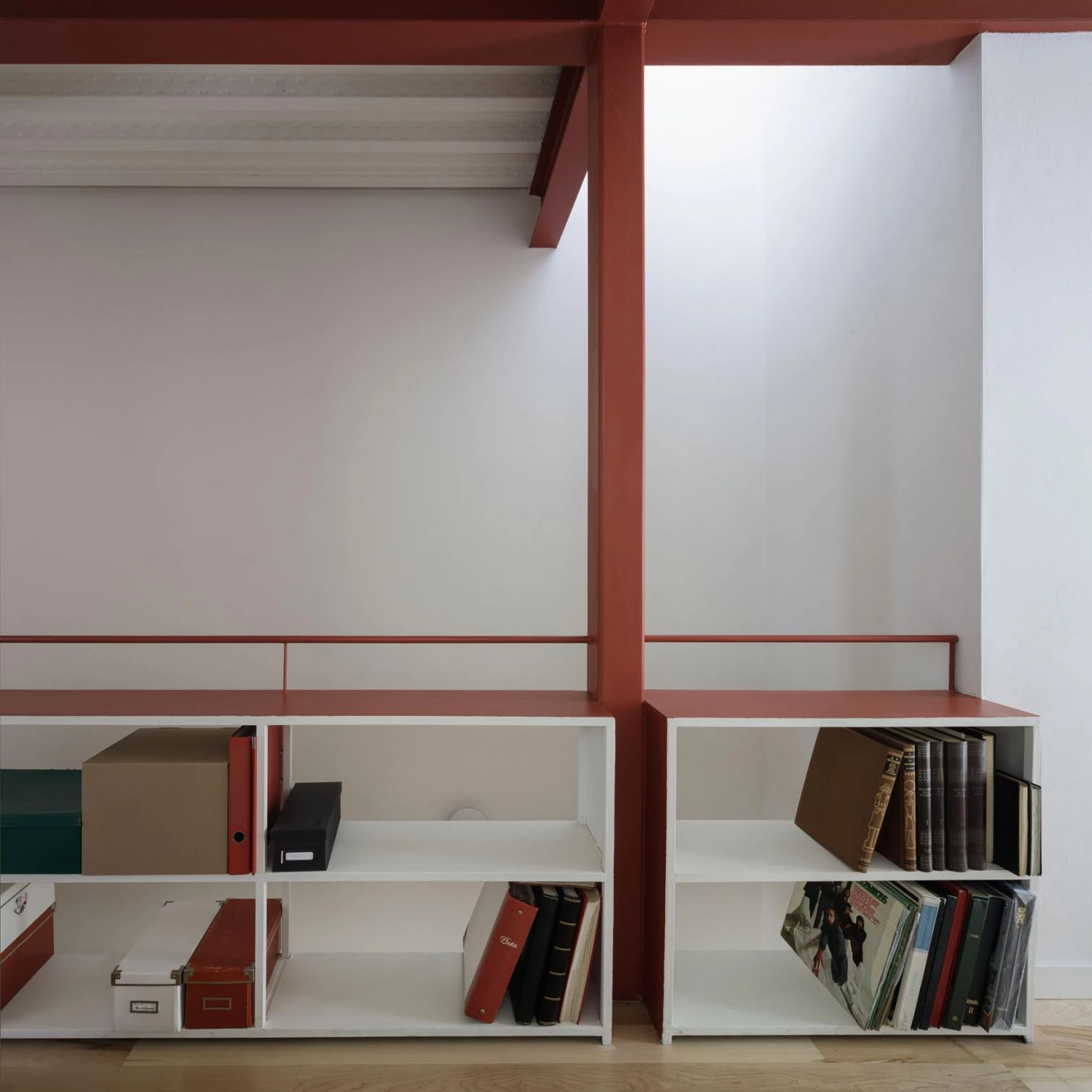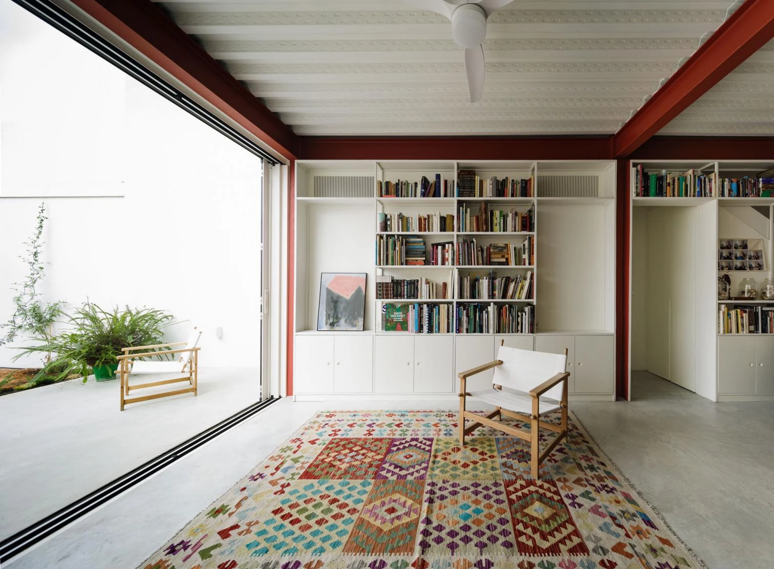 El pórtico tipo retranquea los apoyos respecto a las medianeras para evitar conflictos con los muros de carga de las casas vecinas, y el espacio resultante entre esta línea estructural y las lindes longitudinales se ocupa con el equipamiento, y los espacios técnicos y de almacenaje, generando dos bandas laterales desiguales en los límites de la vivienda. Al exterior, la casa se muestra a la calle como una construcción masiva y blanca que reinterpreta la tradición constructiva local a través de diferentes elementos: una cornisa-visera, un friso, un balcón que avanza sobre la calle, el muro calado y el postigo de la puerta desde el que atisbar el patio-zaguán.