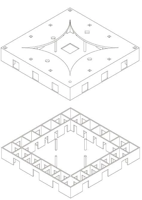 Como diría Nietzsche, "la naturaleza creativa es una naturaleza cruel" . Después de algunos años. las dudosas circustancias originales para el proyecto han sido excedidas por un nuevo programa. Acaso la propia formalidad de la cruda propuesta inicial, en el epicentro de un mezquino campo de batalla, anticipaba los principios de los que partiría el proyecto: una presencia modesta, tan opaca y discreta como fuera posible, casi oculta bajo las dunas, conteniendo el mayor volumen de aireposible en los lindes dados, de algún modo indifirente a los expansivos malabaristas aledaños. La regulardad de un angosto anillo de habitaciones promueve una vida informal, introvertida y hedonista. La transformación caprichosa de cuatro columnas solitarias, como ppuntales de una pesada carpa , sugiere aquella disposición sosegada y serena para un lugar de destino pasajero.