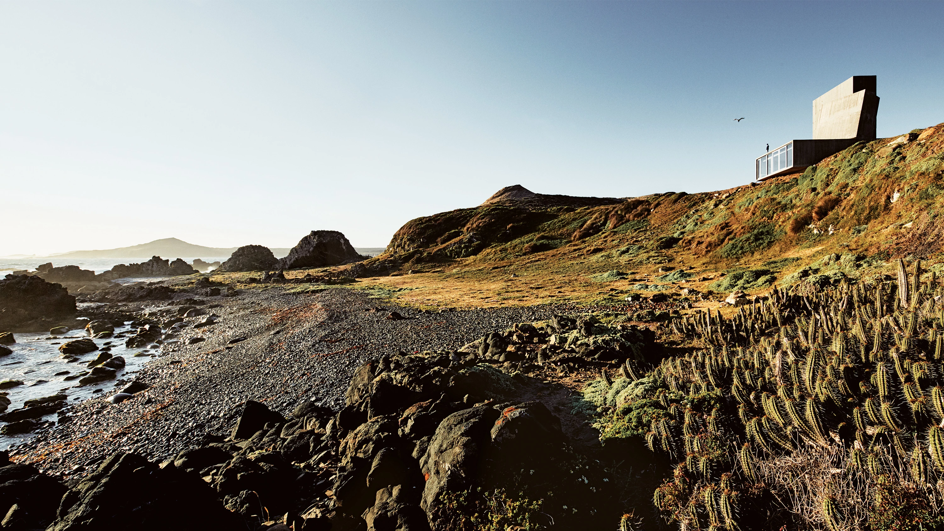 Como si fueran rocas intemporales varadas en la playa, tres poderosos cuerpos de hormigón armado —un plinto de zonas comunes sobre el que se levantan una torre de habitaciones y un gran lucernario— organizan el programa de un modo ajeno a los lugares comunes que son típicos de la arquitectura doméstica, al tiempo que establecen un diálogo con el paisaje abrupto de la costa del violento Océano Pacífico...[+][+]