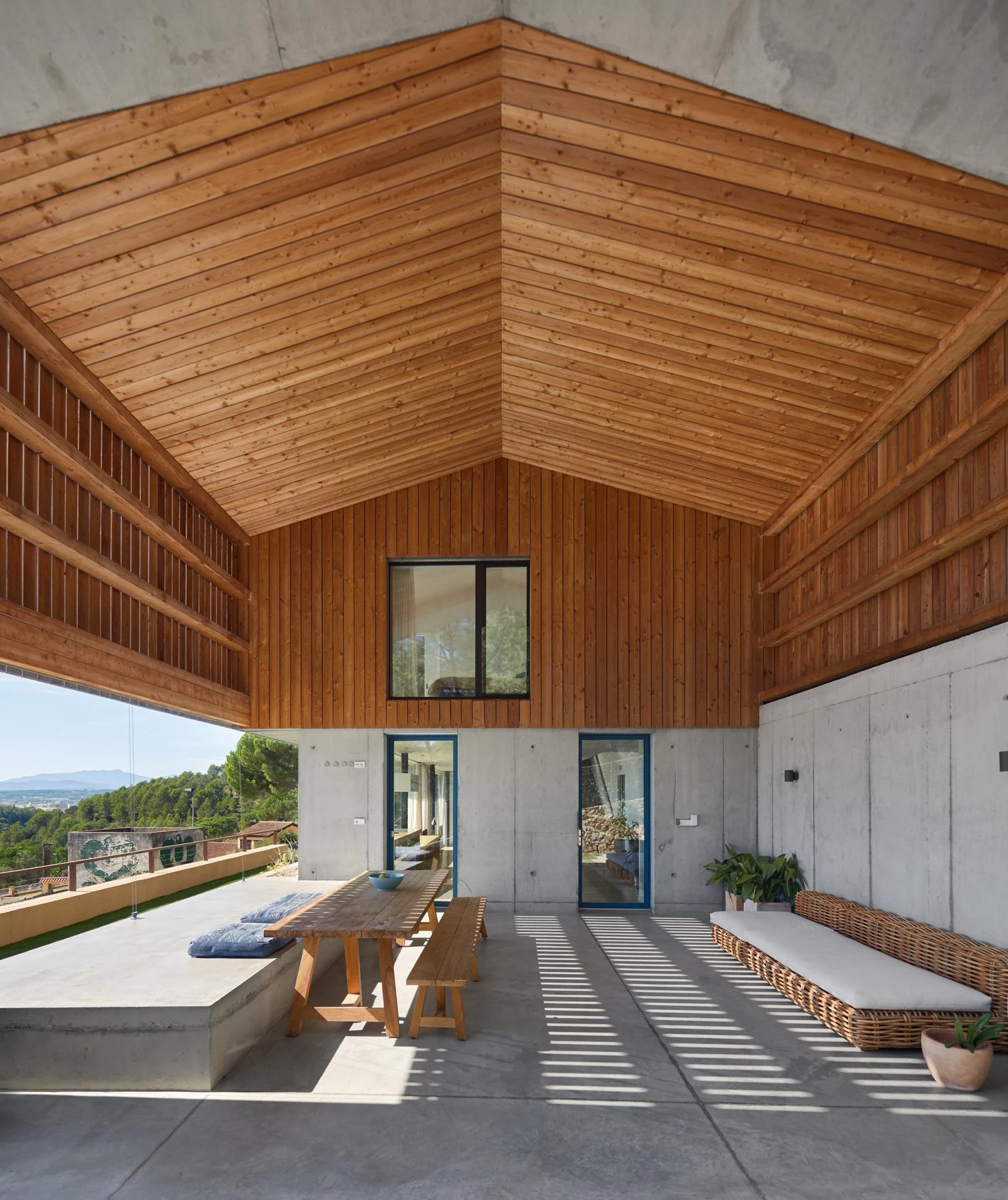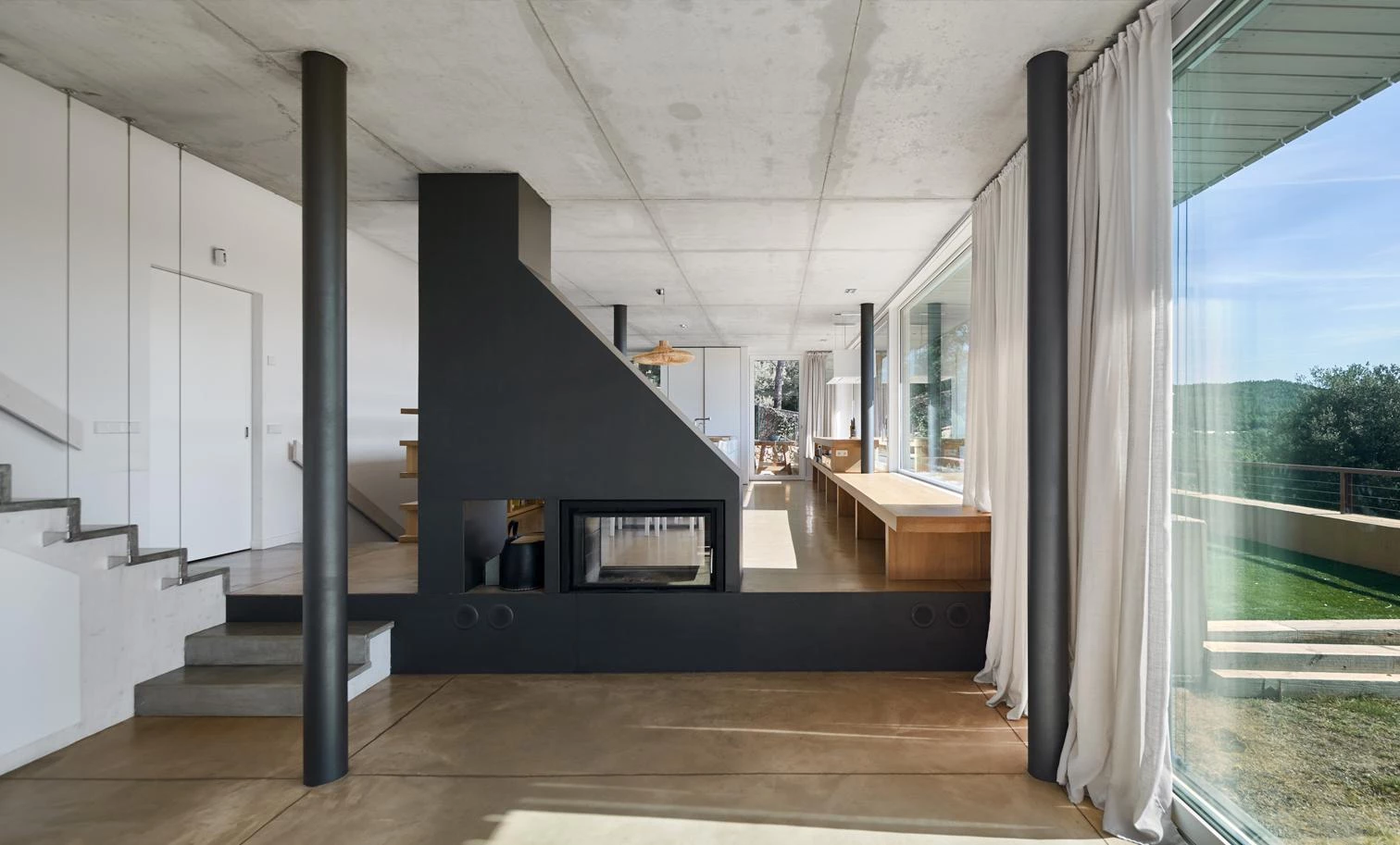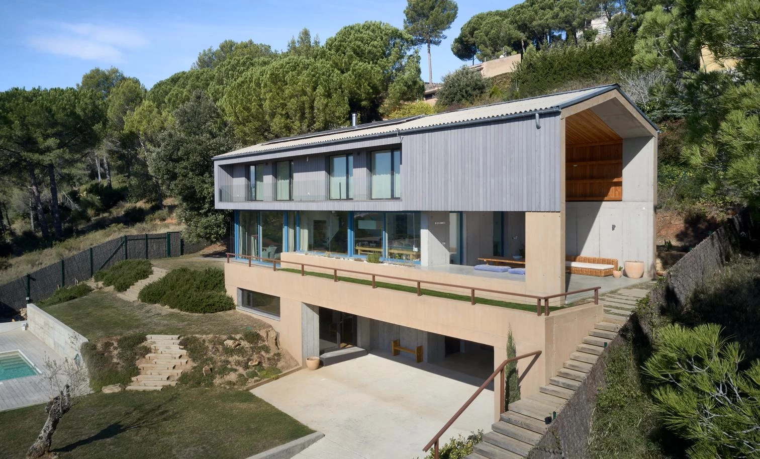 En el barrio de Montjuïc de la ciudad de Gerona se sitúa esta vivienda con vistas privilegiadas sobre el Valle Sant Daniel y el Montseny. Obra de la firma liderada por Daniel Tigges, la construcción comprende tres pisos: el sótano y la planta baja realizados con una estructura de hormigón pigmentada con tonos marrones, que sirven de base al nivel superior de madera. La planta baja contiene las zonas comunes en un espacio sin divisiones y con un juego de alturas, mientras el nivel superior alberga los dormitorios. La relación interior-exterior se potencia a través de la creación de espacios exteriores anexos a cada espacio interior como el porche, los balcones o las varias terrazas. Combinando criterios de bajo consumo energético y alta eficiencia, el diseño consiguió el certificado del estándar alemán Passivhaus. Se consideran elementos como la orientación, la compacidad, las aperturas controladas y el aislamiento. La climatización se hace a través de ventilación de doble flujo Zehnder ComfoAir 550 ERV Luxe, que además proporciona aire limpio al interior de la casa.