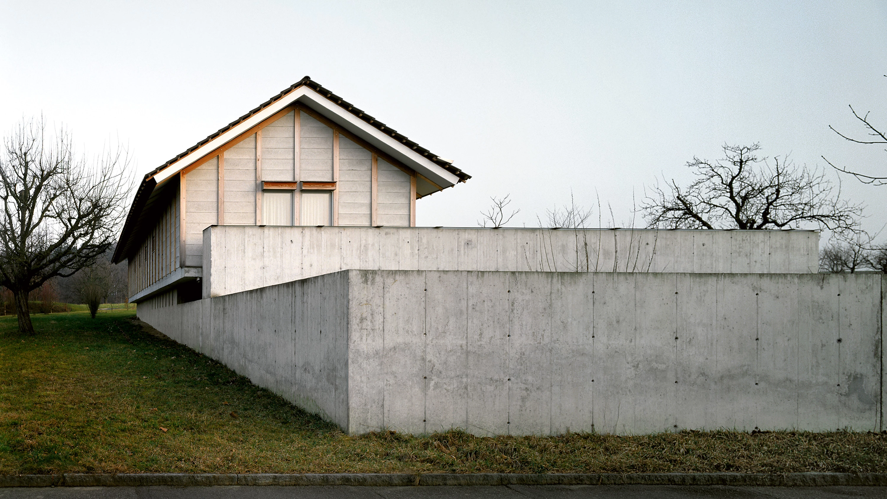 Esta casa está ubicada en un área residencial compuesta de pequeñas parcelas; su contorno básicamente rectangular se eleva desde la calle hacia un prado que todavía permanece sin urbanizar. Su parte más visible es un paralelepípedo alargado de una planta que está construido con paneles prefabricados de hormigón situados entre montantes de madera de pino. Este volumen está coronado con un tejado tradicional a dos aguas que utiliza tejas negras de hormigón como revestimiento, y todo ello se apoya sobre un potente muro perimetral de hormigón armado de acabado pulimentado, que funciona también conteniendo el terreno en la parte superior de la parcela. Con este muro se articula tanto el patio de entrada en el nivel inferior, junto a la calle, como el jardín superior cubierto de césped. En el interior de esta base se organizan el garaje y el espacio de exposición requerido por los clientes para exponer su colección.