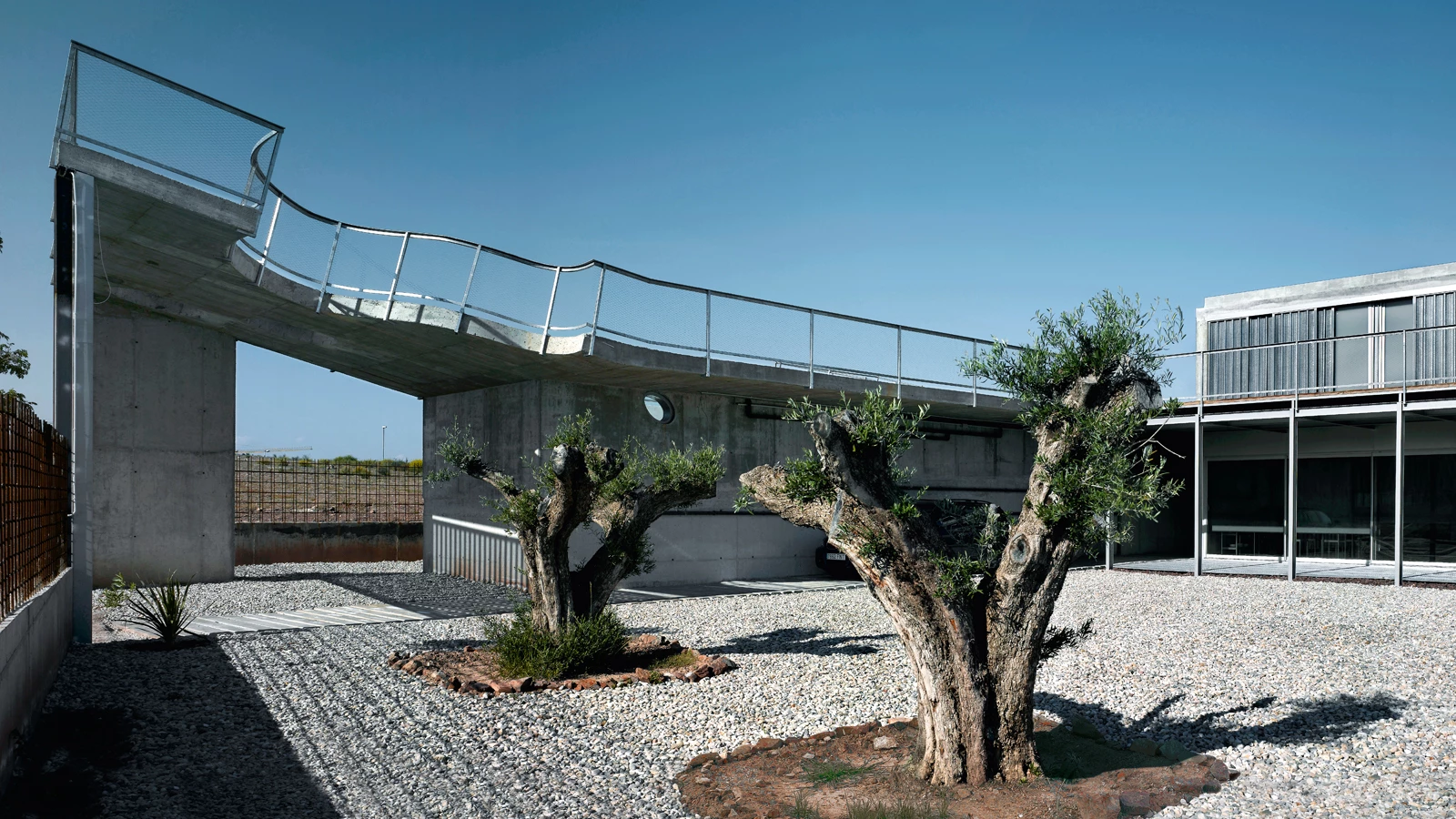 Por sus dimensiones, la posición de la piscina quedó fijada en el lado norte del emplazamiento, determinando la secuencia de espacios que conforma la propia vivienda en tanto que eje vertebrador de toda la actuación. Levantada sobre el terreno, lo que permite una relación directa con el paisaje distante, su volumen de hormigón visto delimita uno de los lados del jardín. En este muro se abrieron huecos de trazado ovoide, de diversos tamaños, cerrados con vidrios resistentes a la presión del agua de forma similar a las paredes de un acuario. El vaso presenta dos zonas diferenciadas, aprovechando la menor profundidad del área de entrada para construir debajo un espacio de almacén y maquinaria.