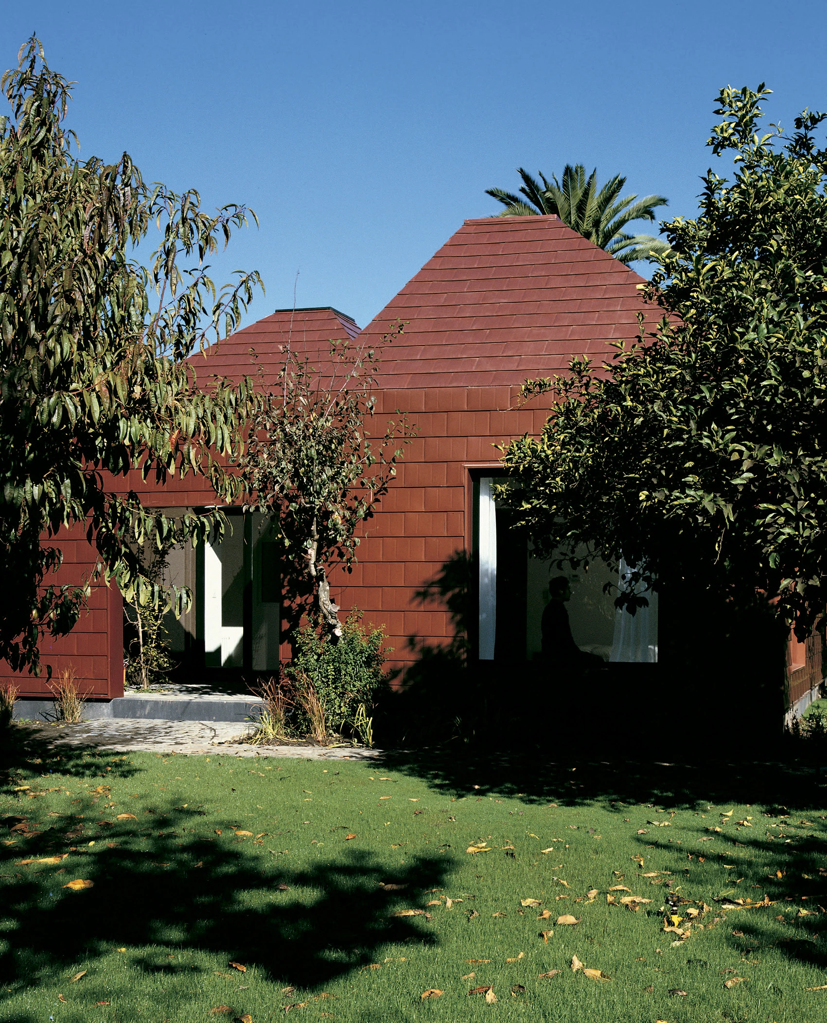 Esta es, a la vez, una casa enorme y pequeña. No tiene salones extensos pero sí un montón de piezas que se repiten y algunas funciones que se duplican de acuerdo a la tradición chilena de casa de campo. Ocupa una pequeña quinta donde, hasta hace poco, estaba la casona donde el actual propietario pasó su infancia. Es un lugar cargado de recuerdos. Como testigo de estos recuerdos ha quedado una abundante miscelánea de árboles frutales (desde cerezos a nogales) y árboles nativos (desde palmas a araucarias). Más allá del sitio no hay nada visualmente atractivo. Por lo tanto, el programa se extiende horizontalmente para, además de recorrer la profundidad de los jardines, conquistar cierta introspección interior e invisibilidad exterior. La estructura irregular, y algo laberíntica, contiene nueve patios abiertos, nueve claros que ayudan a controlar la densidad de la planta. Era posible aumentar la holgura de algunos recintos elevando sus techos, pero esto no debía arrojar sombra sobre los patios. Para ello se proponen dos inclinaciones: la de las cubiertas, que siempre desciende hacia los patios (dejando sólo la sombra del muro) y la de los techos, cuyo vértice recortado por la luz natural se centra según el mobiliario de cada recinto. El peso de un manto de tejas (que en algo evoca el de la antigua casona) cae desde estos catorce prismas truncados.[+][+]