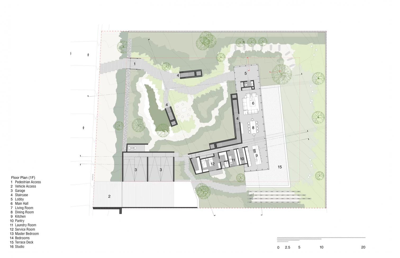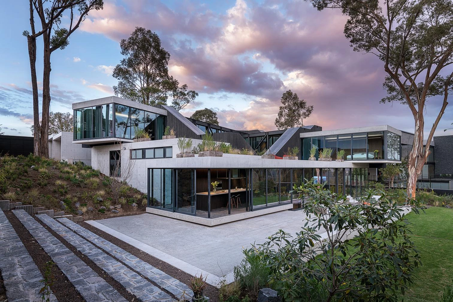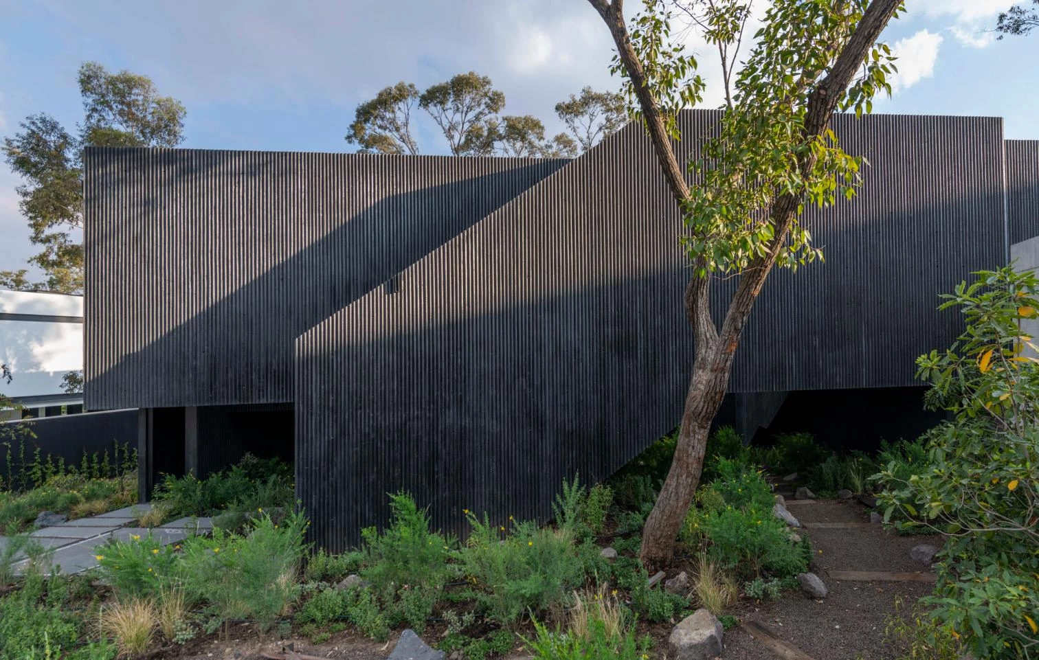 Situada en Hacienda Valle Escondido, una localidad del municipio mexicano Atizapán de Zaragoza, esta vivienda transforma el programa residencial tradicional en un proyecto de recorridos laberínticos a través de escaleras. La casa de hormigón estriado de color negro presenta diferentes accesos en penumbra iluminados cenitalmente. El volumen sólido se eleva liberando el jardín de vegetación abundante. Este elemento serpenteante abraza el patio sobre el que vuelan las estancias.
