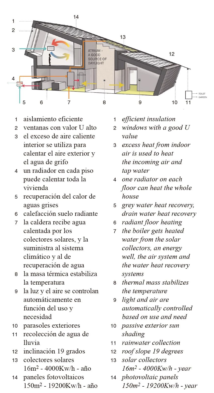 Este prototipo de vivienda unifamiliar —diseñado para el Centro de Investigación de Edificios de Emisión Cero como plataforma de aprendizaje para la construcción de viviendas sostenibles— es un catálogo de recursos y soluciones para compensar todo la emisión de C02 que una casa produce. Sistemas de diseño tradicional (la orientación, en este caso sur-este es la más favorable, o la recolección de agua con cubiertas inclinadas) combinados con elementos de aprovechamiento y producción energética (paneles y colectores solares o energía geotérmica del terreno) pueden no sólo igualar el consumo, sino producir un exceso de energía suficiente para alimentar la batería de un coche eléctrico durante un año. Colaboran también el preciso cálculo de la posición y dimensión de los vidrios y ventanas —que enmarcan las vistas del entorno sin provocar desgastes energéticos— y el volumen general, cuyo factor de forma está optimizado para cumplir estos objetivos. En el jardín la piscina colabora con el sistema global refrescando el aire en los meses más calurosos y se plantan árboles frutales y vegetales que ayudan a la producción doméstica de alimentos. Por su parte, el interior emplea materiales capaces de almacenar calor en función de las necesidades de cada estación.