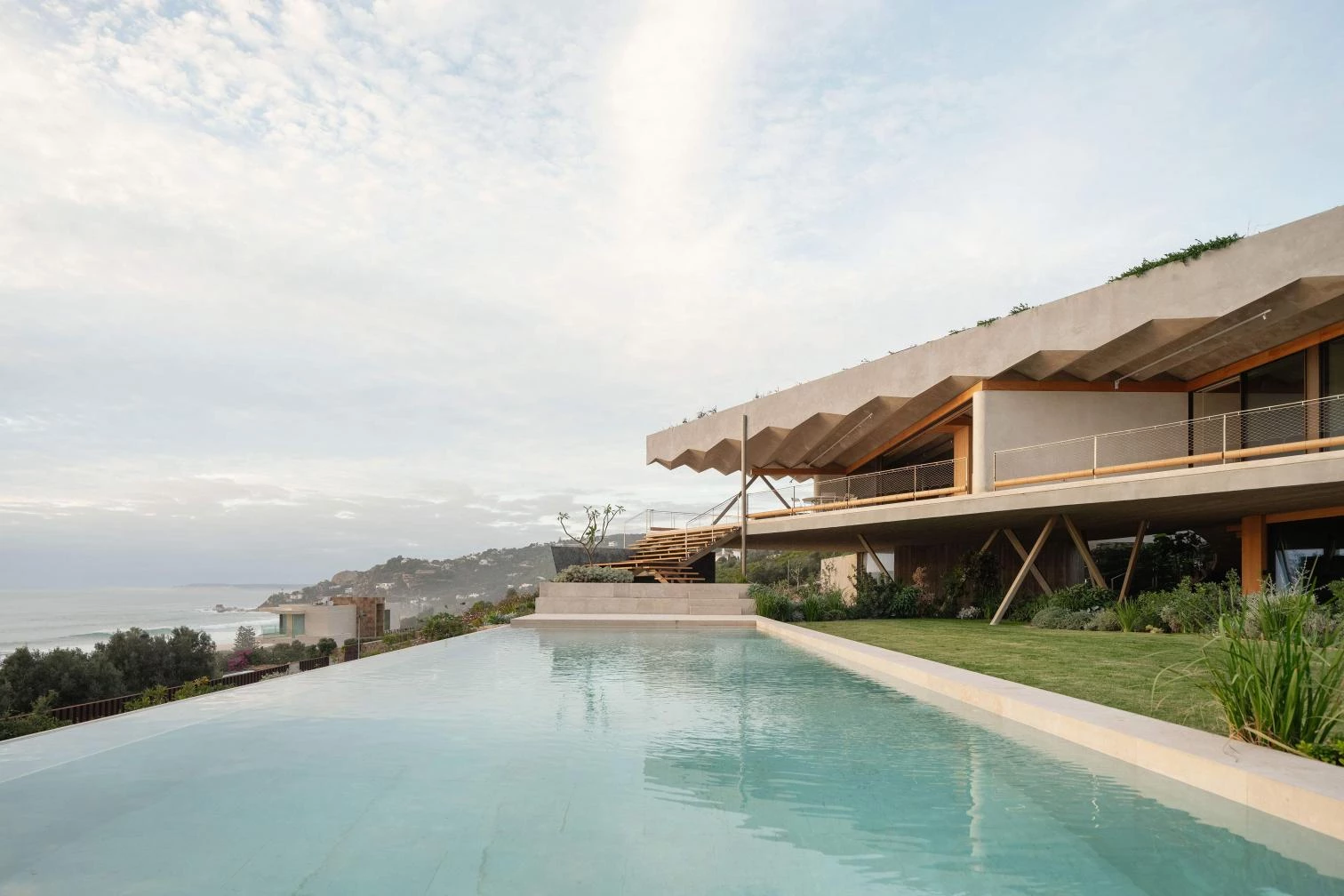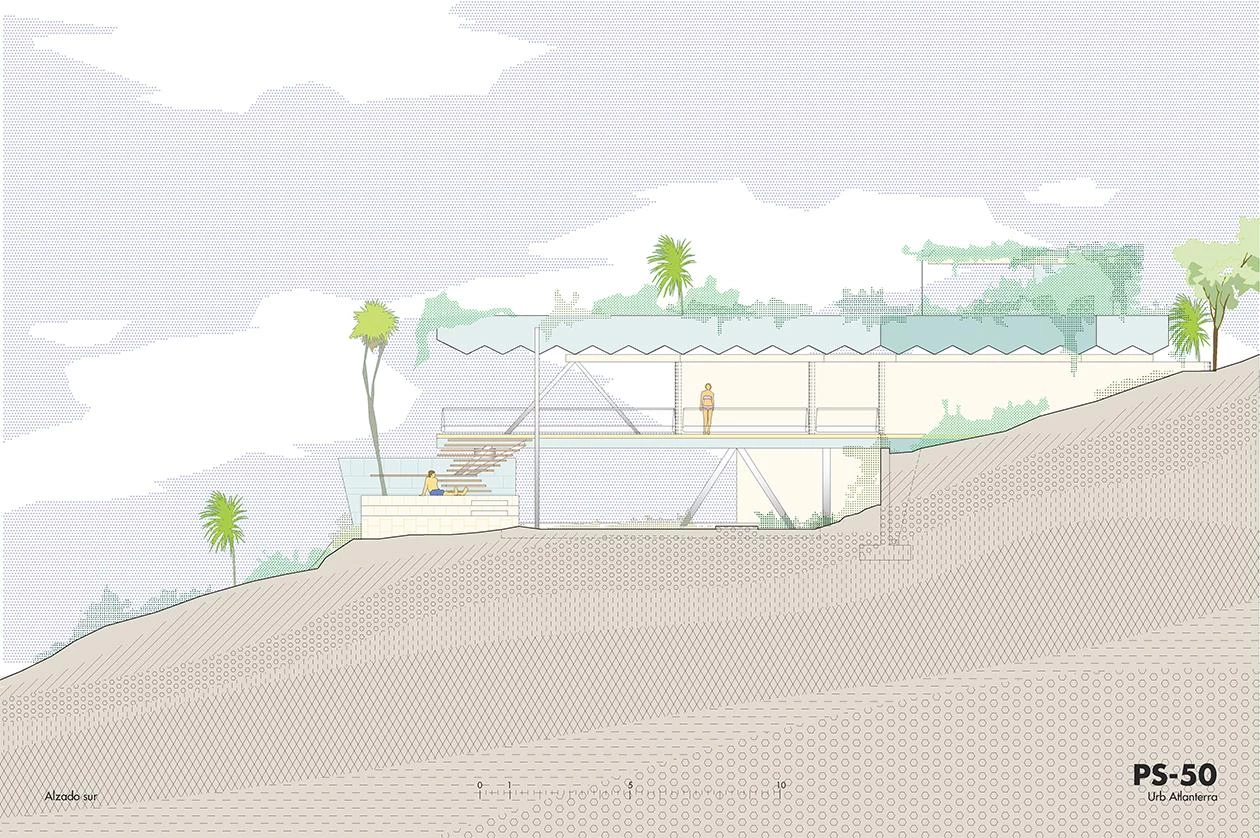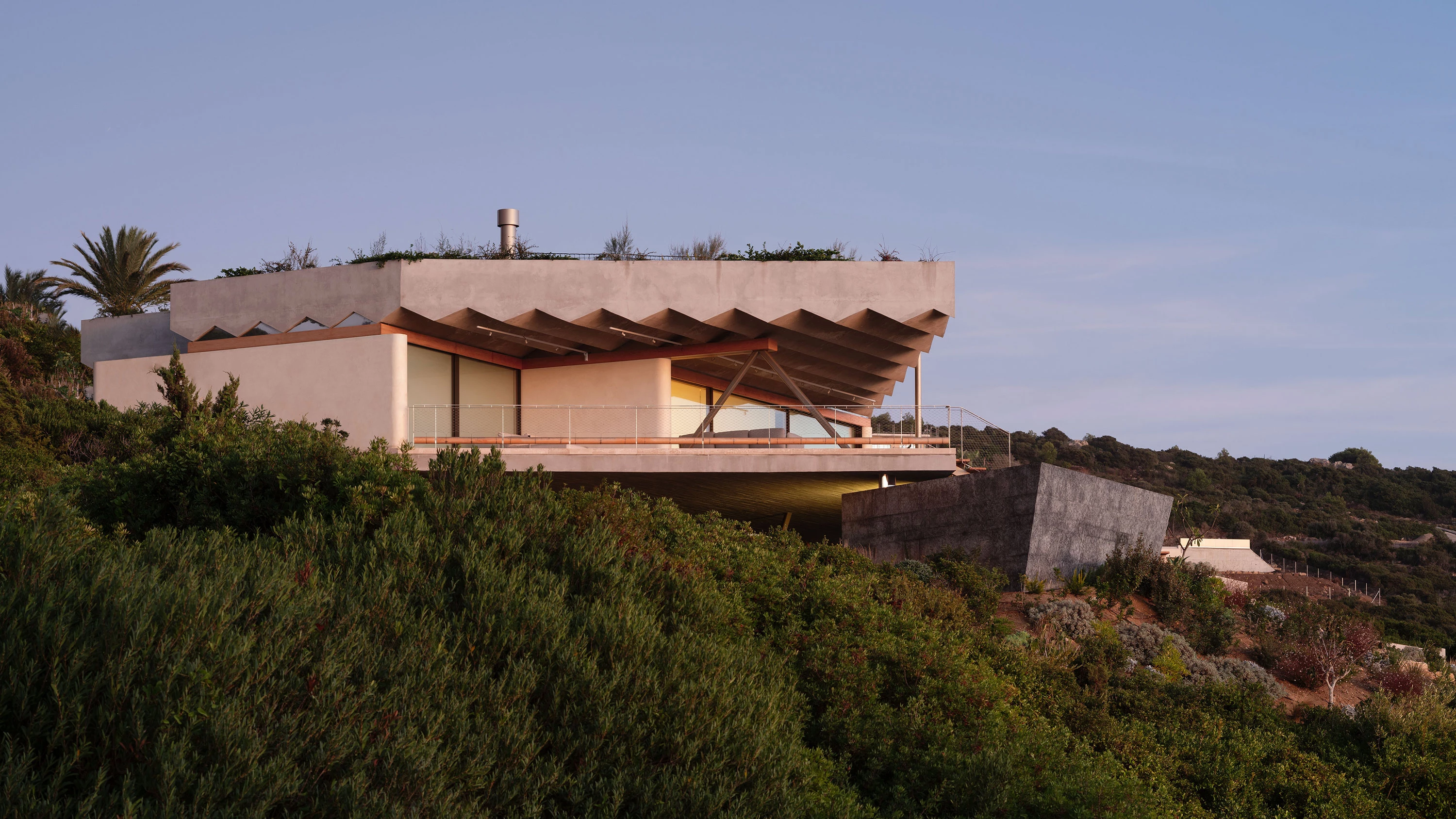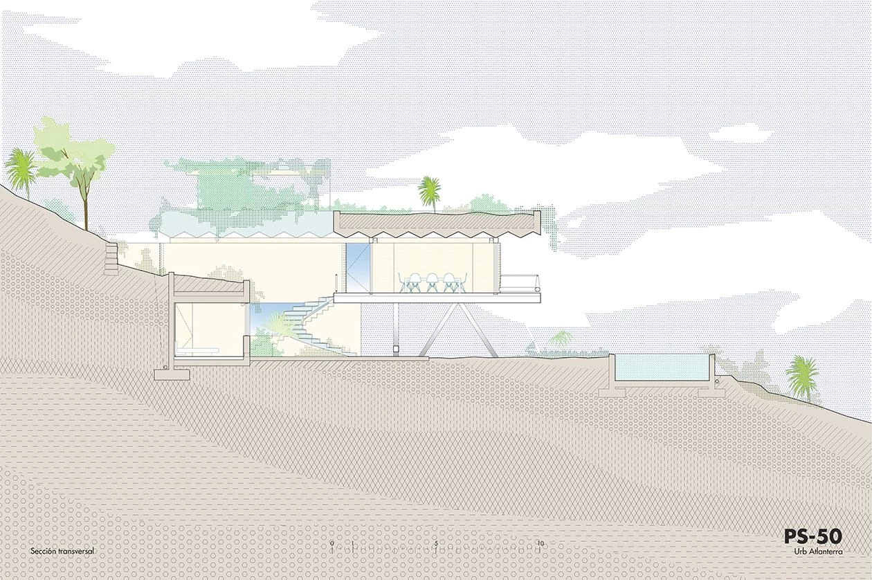 Ubicada en la zona más meridional de la península ibérica, en la división entre el mar Mediterráneo y el océano Atlántico, la casa deja todo el protagonismo al escarpado paisaje y se oculta bajo el perfil de una cubierta vegetal que restituye la flora preexistente. La ejecución en zigzag de la losa permite soportar las importantes cargas del terreno, a la vez que salva grandes luces, transmitiendo una aparente sensación de ligereza y evocando una tela sacudida por las brisas tarifeñas. La planta de la vivienda se organiza con una batería de muros paralelos, que adaptan su separación a los usos que contienen y, junto a los grandes paños de vidrio, controlan los cambiantes vientos de poniente y levante. El acceso a la vivienda se realiza por la parte inferior, a través de un patio abierto a las vistas del mar desde el que se despliegan gradas y escalinatas para conectar el volumen principal con la piscina y el jardín. Ya en el nivel superior, tras las amplias escaleras helicoidales, un frondoso jardín a resguardo hace de espacio de transición con el interior doméstico. Los materiales escogidos también participan de la integración de la construcción en el paisaje, con muros a base de cal, planos horizontales de hormigón, acero reflectante y carpinterías oscuras que se mimetizan en el entorno natural.