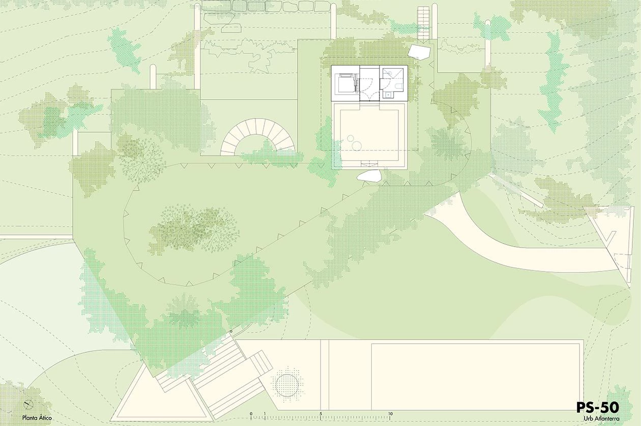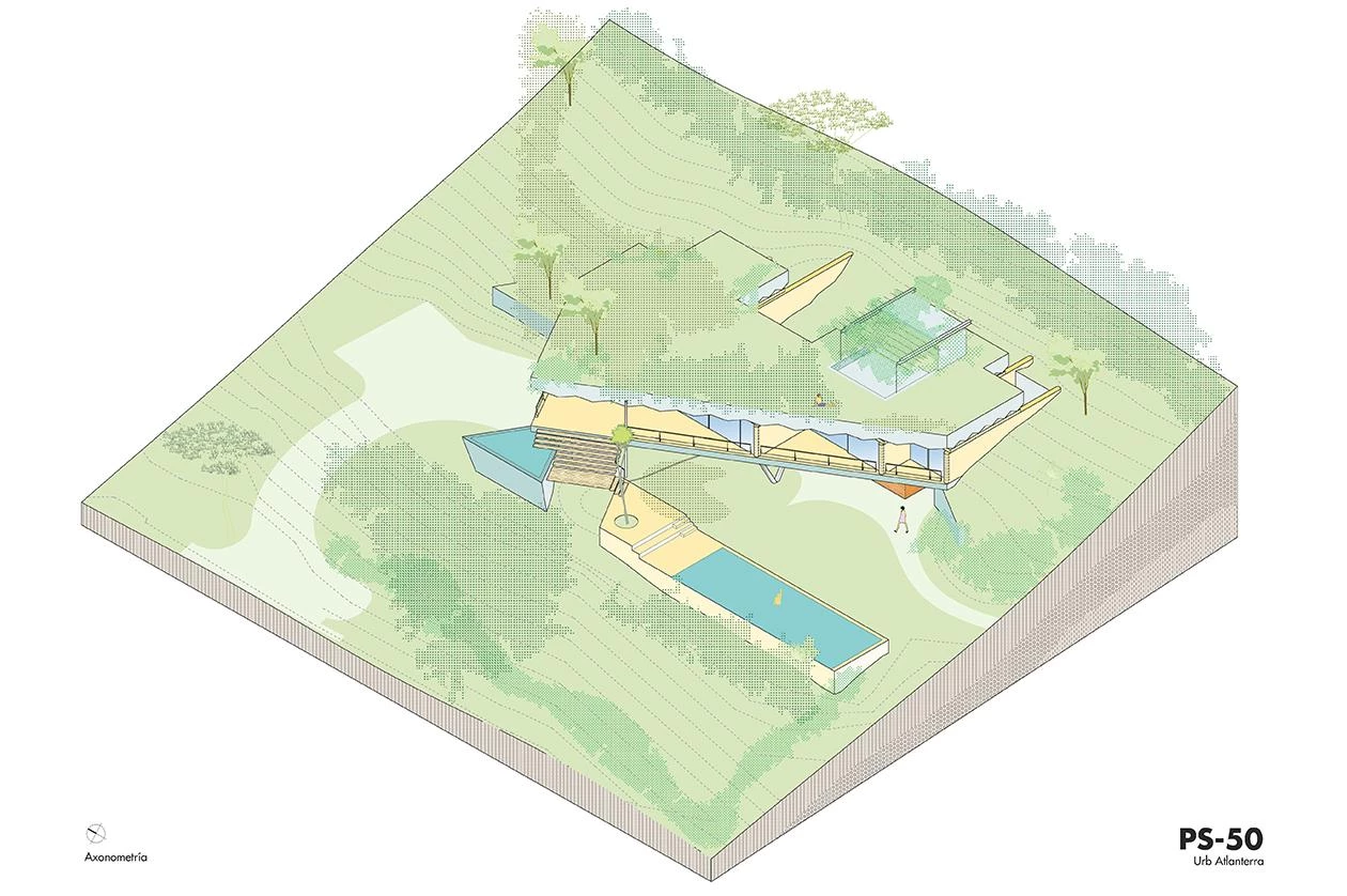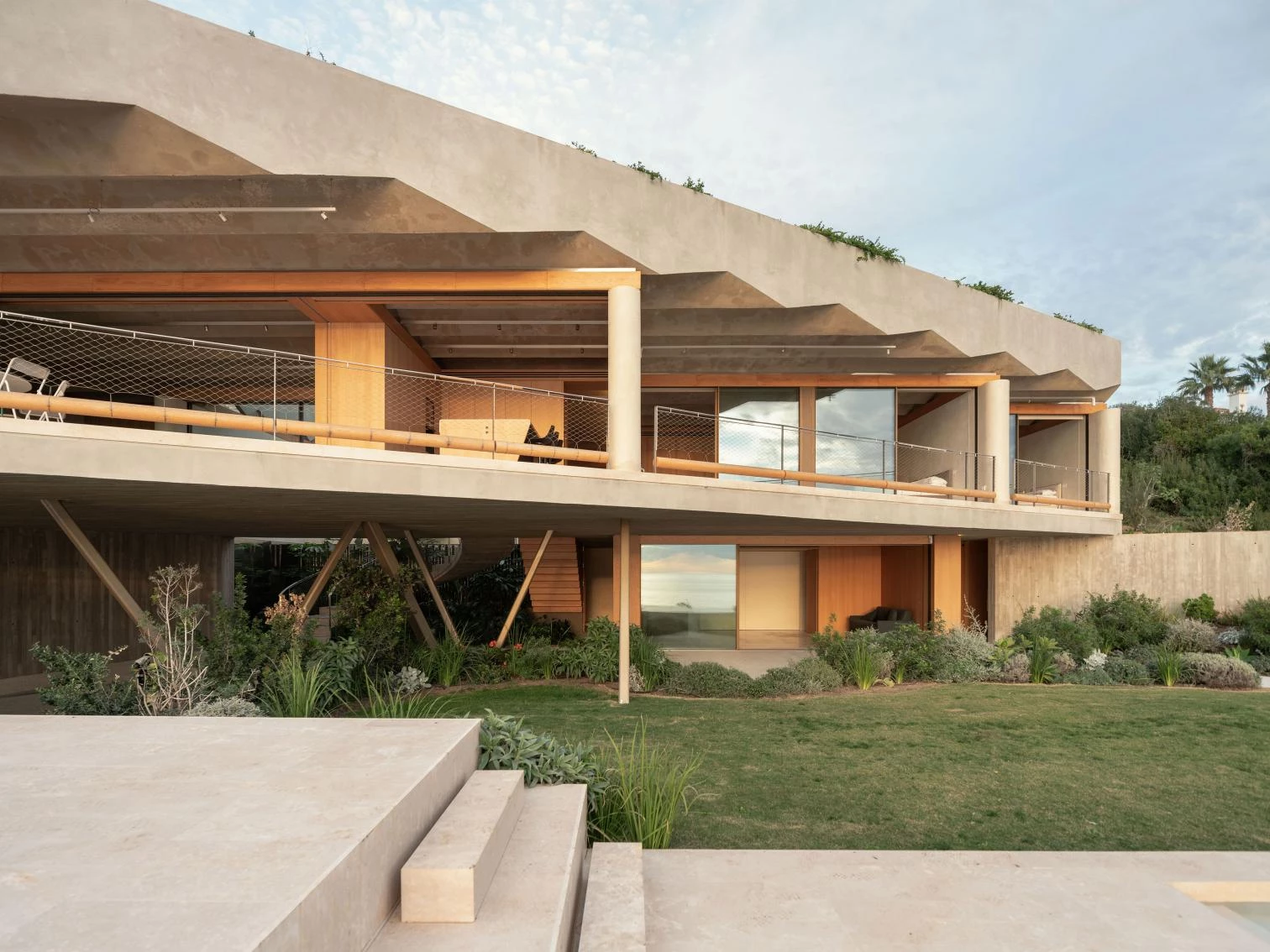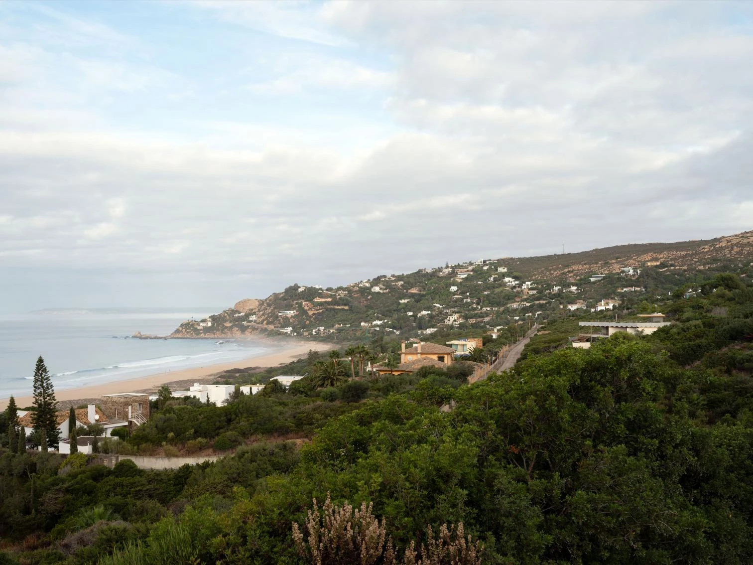 Ubicada en la zona más meridional de la península ibérica, en la división entre el mar Mediterráneo y el océano Atlántico, la casa deja todo el protagonismo al escarpado paisaje y se oculta bajo el perfil de una cubierta vegetal que restituye la flora preexistente. La ejecución en zigzag de la losa permite soportar las importantes cargas del terreno, a la vez que salva grandes luces, transmitiendo una aparente sensación de ligereza y evocando una tela sacudida por las brisas tarifeñas. La planta de la vivienda se organiza con una batería de muros paralelos, que adaptan su separación a los usos que contienen y, junto a los grandes paños de vidrio, controlan los cambiantes vientos de poniente y levante. El acceso a la vivienda se realiza por la parte inferior, a través de un patio abierto a las vistas del mar desde el que se despliegan gradas y escalinatas para conectar el volumen principal con la piscina y el jardín. Ya en el nivel superior, tras las amplias escaleras helicoidales, un frondoso jardín a resguardo hace de espacio de transición con el interior doméstico. Los materiales escogidos también participan de la integración de la construcción en el paisaje, con muros a base de cal, planos horizontales de hormigón, acero reflectante y carpinterías oscuras que se mimetizan en el entorno natural.