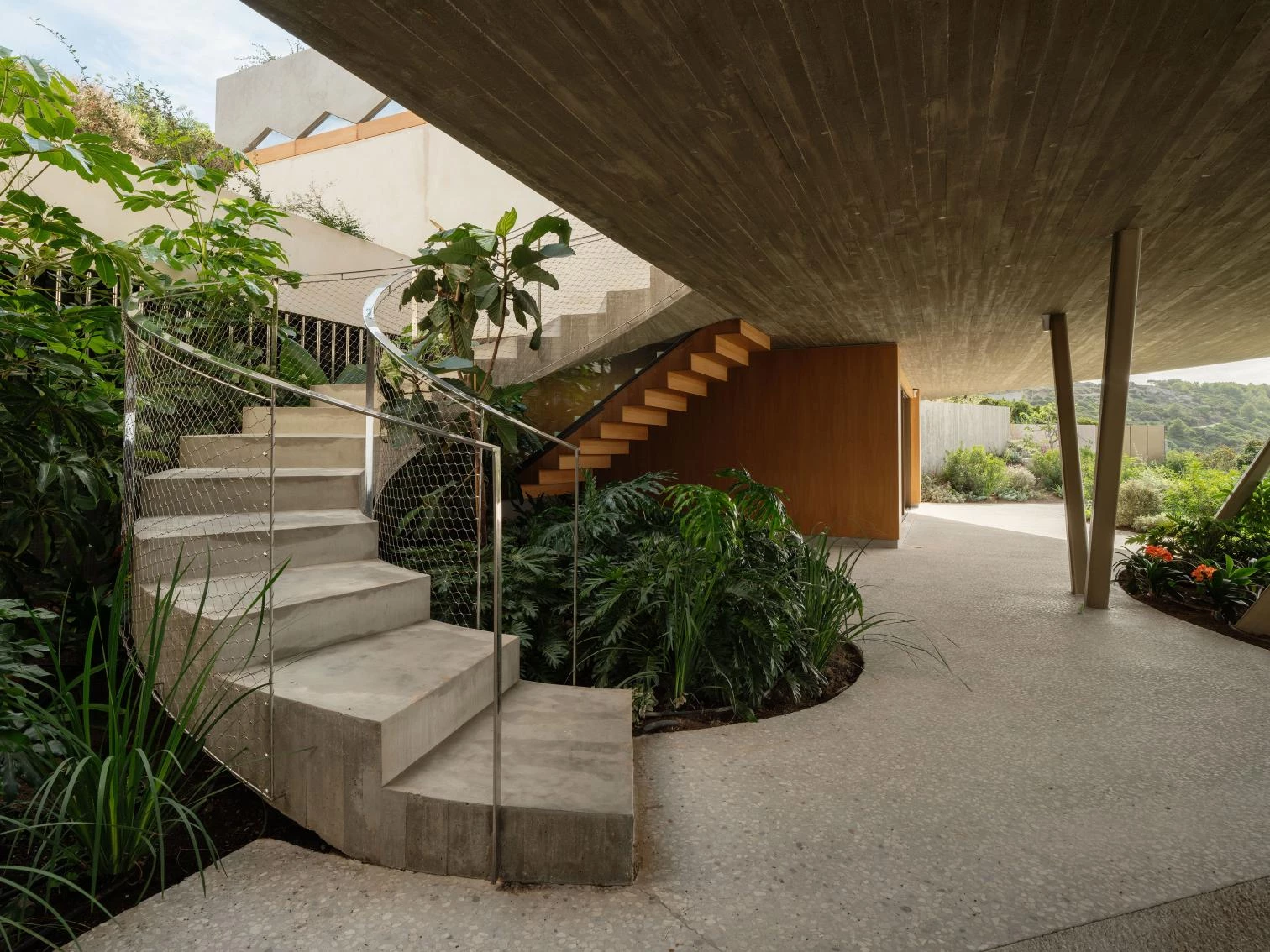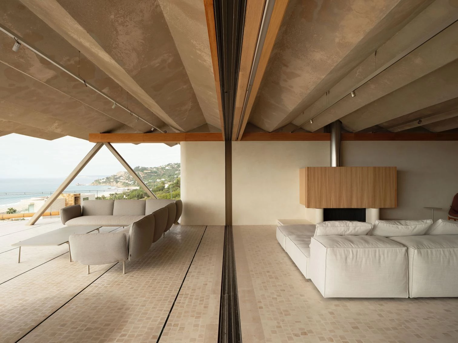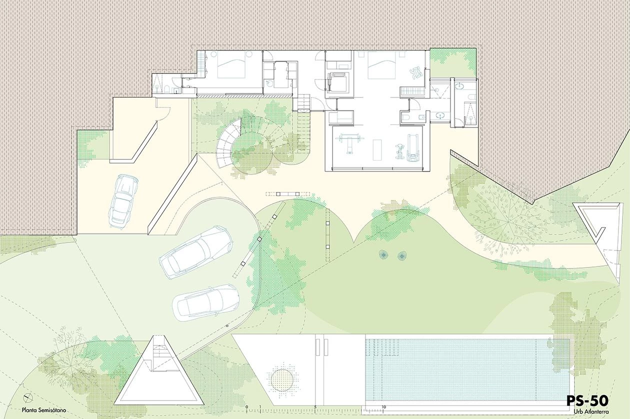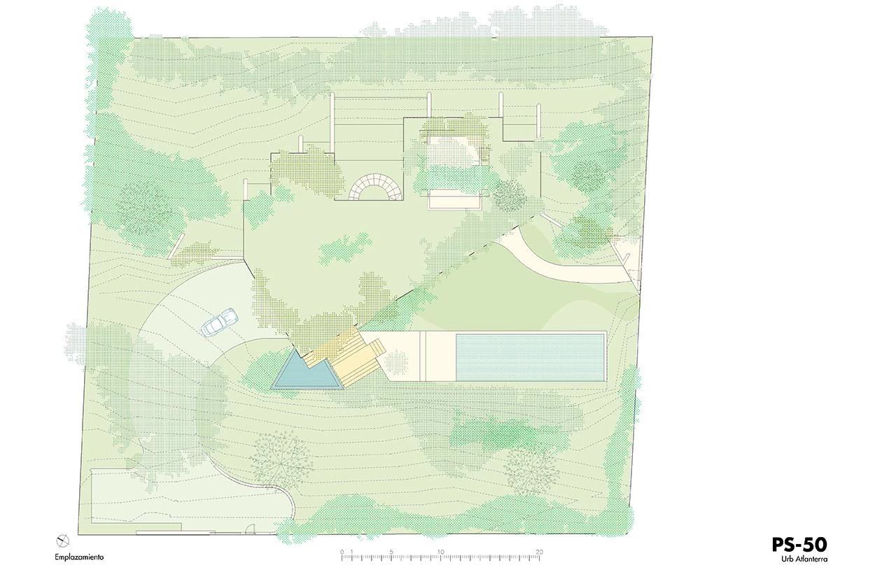 Ubicada en la zona más meridional de la península ibérica, en la división entre el mar Mediterráneo y el océano Atlántico, la casa deja todo el protagonismo al escarpado paisaje y se oculta bajo el perfil de una cubierta vegetal que restituye la flora preexistente. La ejecución en zigzag de la losa permite soportar las importantes cargas del terreno, a la vez que salva grandes luces, transmitiendo una aparente sensación de ligereza y evocando una tela sacudida por las brisas tarifeñas. La planta de la vivienda se organiza con una batería de muros paralelos, que adaptan su separación a los usos que contienen y, junto a los grandes paños de vidrio, controlan los cambiantes vientos de poniente y levante. El acceso a la vivienda se realiza por la parte inferior, a través de un patio abierto a las vistas del mar desde el que se despliegan gradas y escalinatas para conectar el volumen principal con la piscina y el jardín. Ya en el nivel superior, tras las amplias escaleras helicoidales, un frondoso jardín a resguardo hace de espacio de transición con el interior doméstico. Los materiales escogidos también participan de la integración de la construcción en el paisaje, con muros a base de cal, planos horizontales de hormigón, acero reflectante y carpinterías oscuras que se mimetizan en el entorno natural.