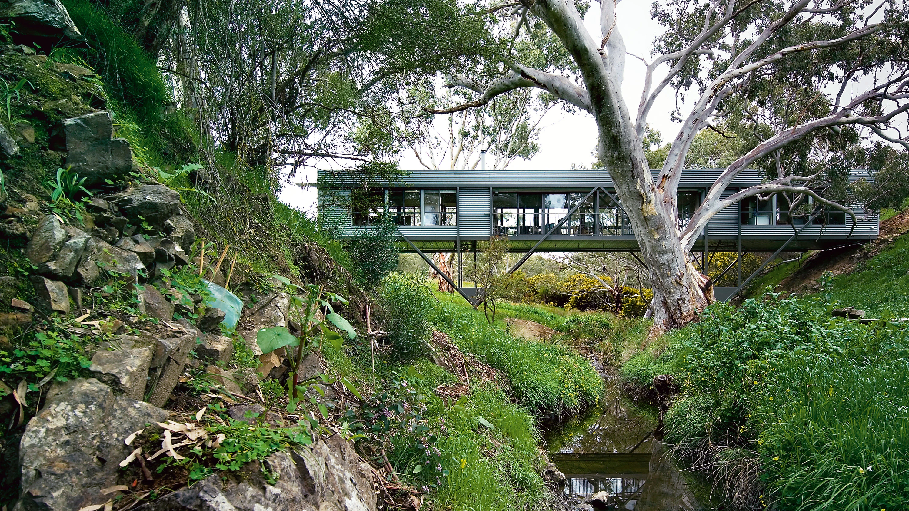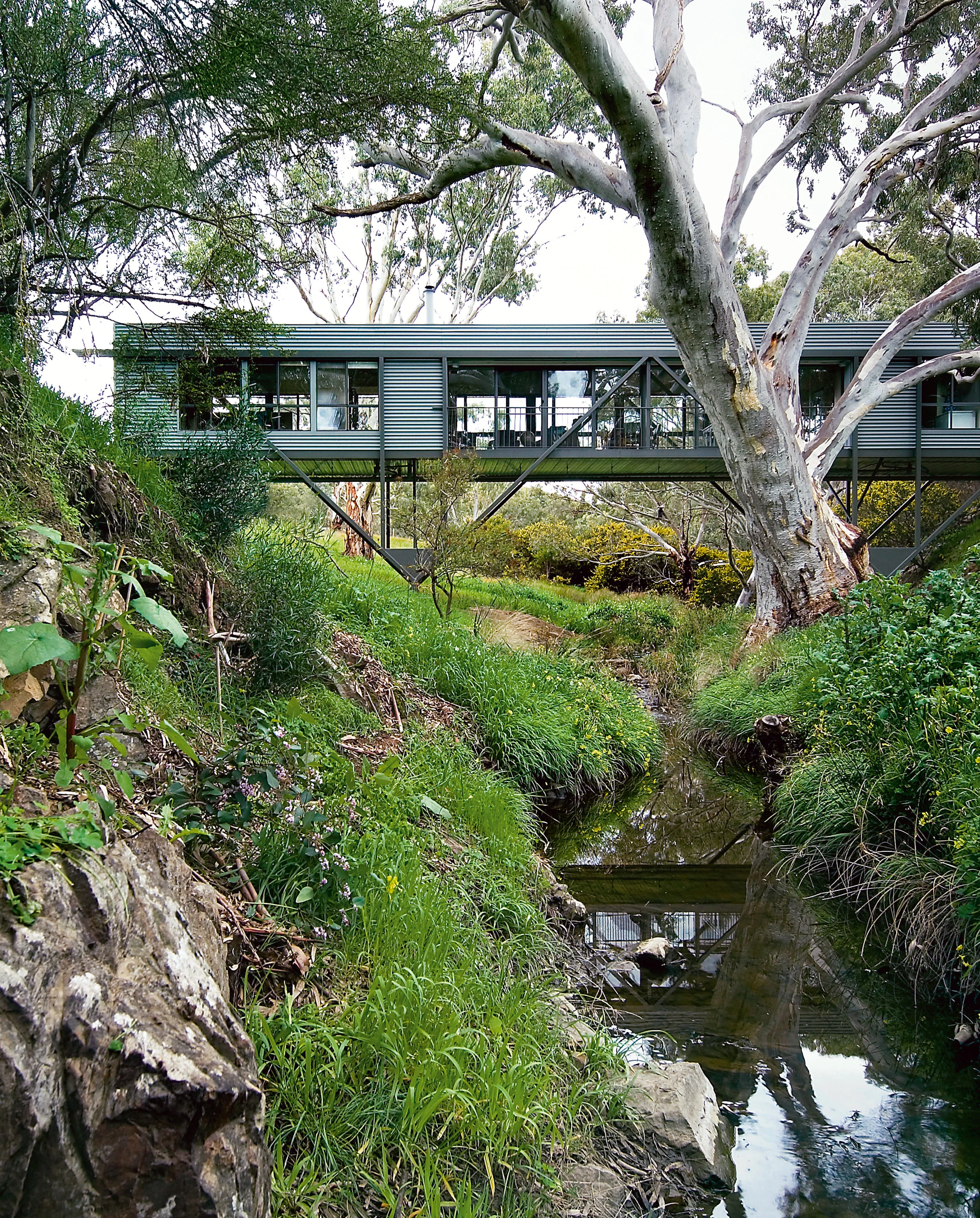 Max PritchardSituada en la región de la Australia Meridional, a menos de una hora en coche de su capital, Adelaida, la pequeña parcela donde se sitúa la casa tiene como principal singularidad la presencia de un pequeño riachuelo que durante el invierno divide la propiedad en dos partes y cuyos quiebros han dado lugar a una pintoresca hondonada flanqueada por vegetación endémica y árboles de gran porte. Respetar este carácter natural del enclave fue el principal requerimiento de los clientes que, por otra parte, necesitaban que el edificio diese cuenta de un programa permanente y mixto de casa-oficina, y que pudiera construirse con un presupuesto reducido, comparable al de otras soluciones de vivienda prefabricada o industrializada que resultan muy asequibles en un país como Australia, donde la construcción ligera tiene una larga tradición.