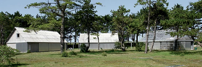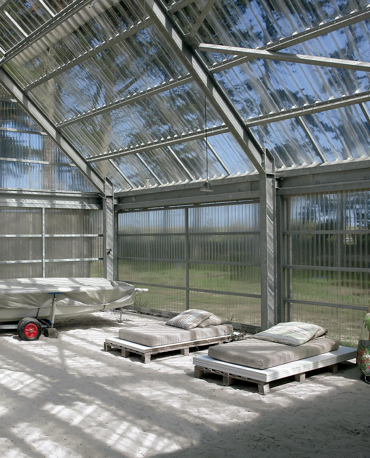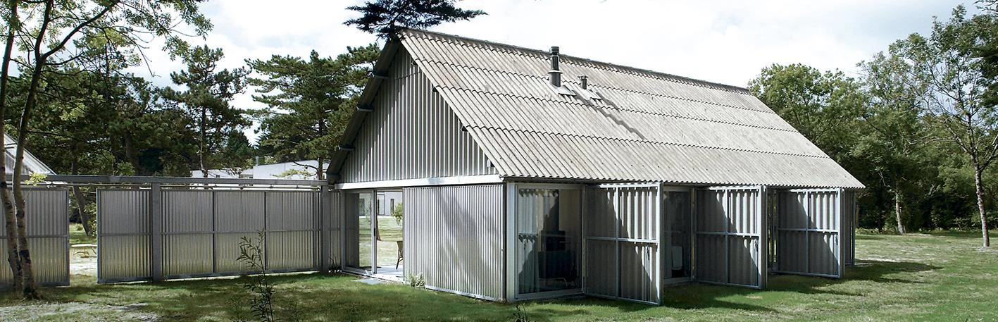 Detrás de las dunas, y a su cobijo, se sitúa el solar en el que se emplaza la vivienda. Un lugar desde el cual no es posible la visión directa del agua, pero donde es ineludible la presencia magnífica del océano, perceptible por el sonido, el viento y las nubes. Para la localización exacta de la residencia se ha escogido una banda en los límites norte y este de la parcela, cercana a las dunas y salpicada por árboles y claros. Se compone de tres cuerpos separados, dispuestos en forma de arco convexo hacia el norte, protegiéndolo del mal tiempo, y cóncavo al sur, creando un espacio exterior más intimo y menos expuesto.