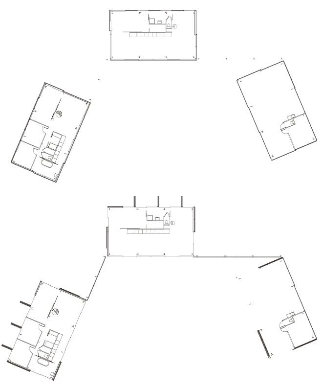 Este espacio queda perfectamente delimitado cuando las casas están habitadas, ya que las grandes contraventanas correderas de aluminio que cierran sus fachadas se desplazan en dirección a la casa vecina, y dibujan el contorno de un improvisado jardín. Cuando vuelven a quedar vacías, los volúmenes recuperan su apariencia cerrada e independiente. Aunque los tres cuerpos tengan el mismo tamaño, altura y superficie, se diferencian en el programa, en la organización interior, en la naturaleza de sus revestimientos y en el modo en que se cierran. La estructura de las piezas está realizada con perfiles de acero revestidos, en las partes opacas, con paneles de fibrocemento.