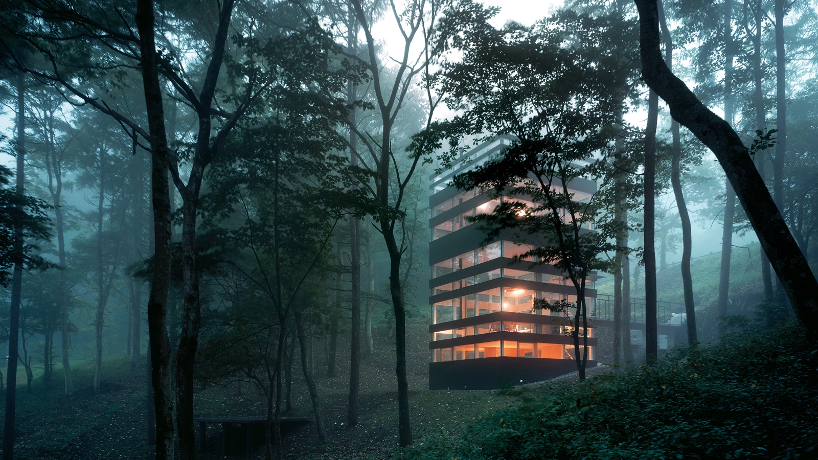 A menos de una hora del ajetreo y bullicio de una gran urbe como Tokio, la localidad de Karuizawa ofrece la tranquilidad natural de sus frondosos bosques. Como respuesta al escarpado terreno colonizado por altos árboles, la casa concentra la huella sobre el lugar para crecer hasta alcanzar las tres alturas, abandonando por tanto la idea de una construcción extensiva desarrollada en un solo piso para repartir la superficie total de 102 metros cuadrados en las diferentes plantas.