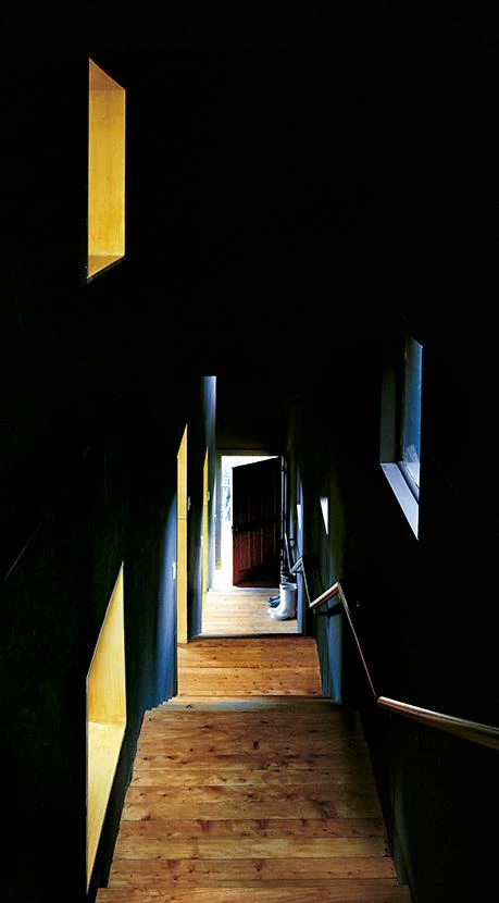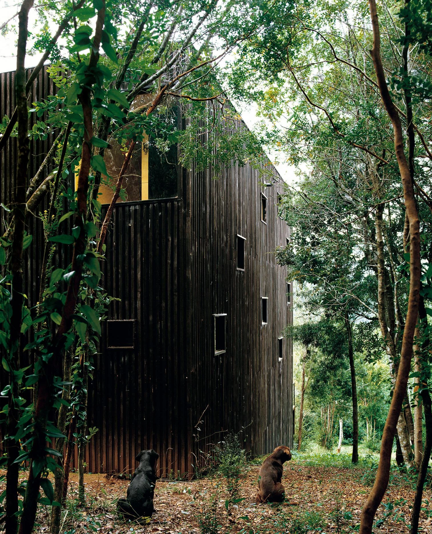 Una pareja madura decide dejar la capital y radicarse en la ladera de un cerro cubierto de una densa selva de especies nativas. Tras las primeras reuniones, la romántica decisión comenzó a traslucir una leve, aunque persistente, aprensión ante el posible hastío de estar juntos todo el tiempo. Finalmente este dato se convirtió en uno de los problemas centrales que intentaría resolver el proyecto. Sumado a las rotundas condiciones del lugar, ese problema condujo a las siguientes decisiones: primero, contener todo el programa en un volumen compacto y monolítico, que sirviera para conservar la temperatura y para reforzar la sensación de autonomía de la pareja; segundo, ganar altura para asomarse sobre los árboles y conseguir vistas y sol; tercero, alejar las tres habitaciones de uso privado (el dormitorio y los estudios de cada uno), para estimular la búsqueda y los desencuentros; y cuarto, unificar las actividades públicas en un espacio abierto, orientado al norte, que permitiera recorrer con lecturas transversales y diagonales la topografía del cerro. El espacio mayor y las habitaciones se revisten con un mismo entablado en suelos, paredes y techos. La superficie exterior está cubierta por una capa de entablado y cubrejuntas verticales de pino sin cepillar y acabado negro de aceite carbonileo (habitual en las construcciones rurales de la zona).