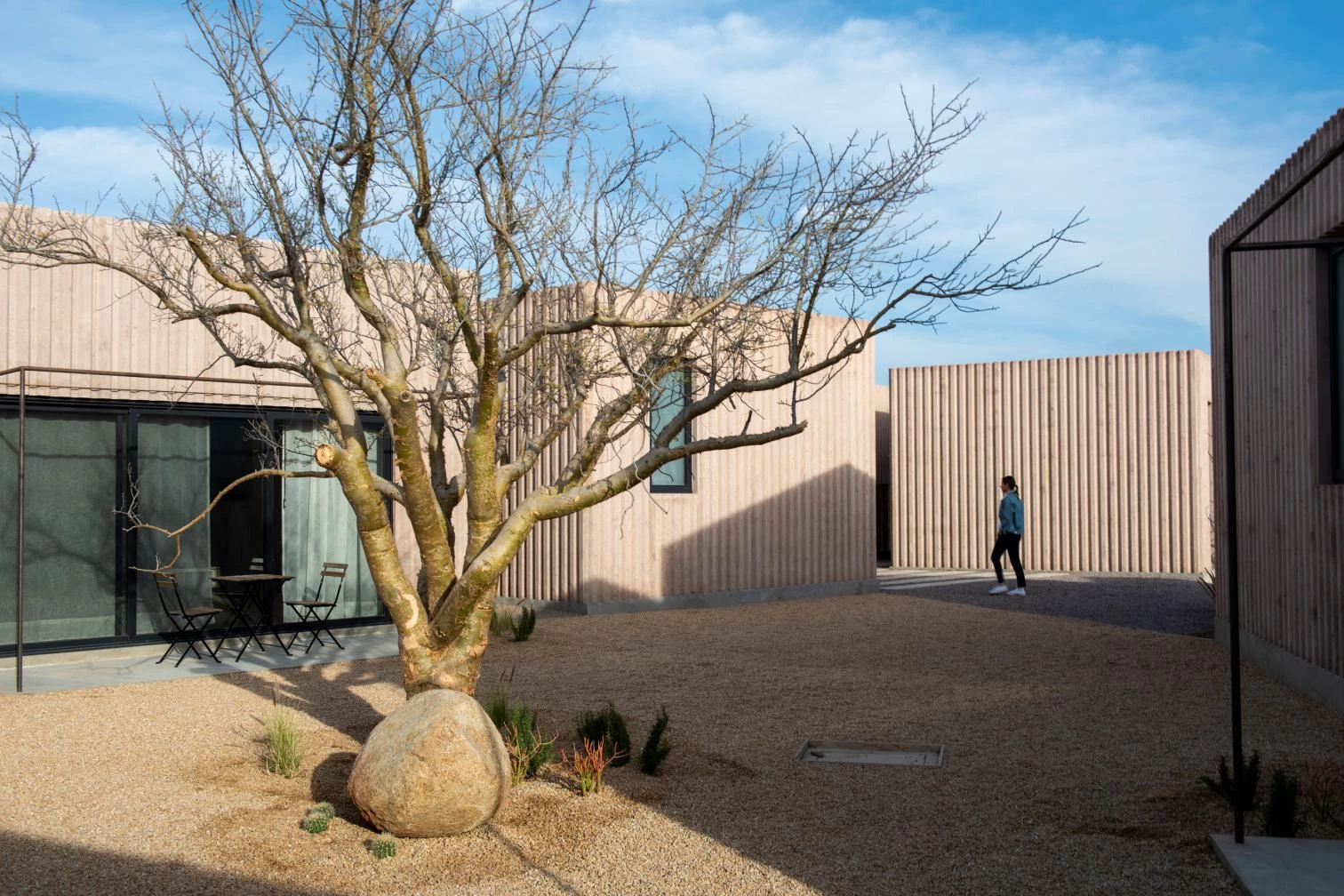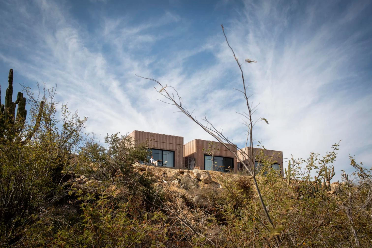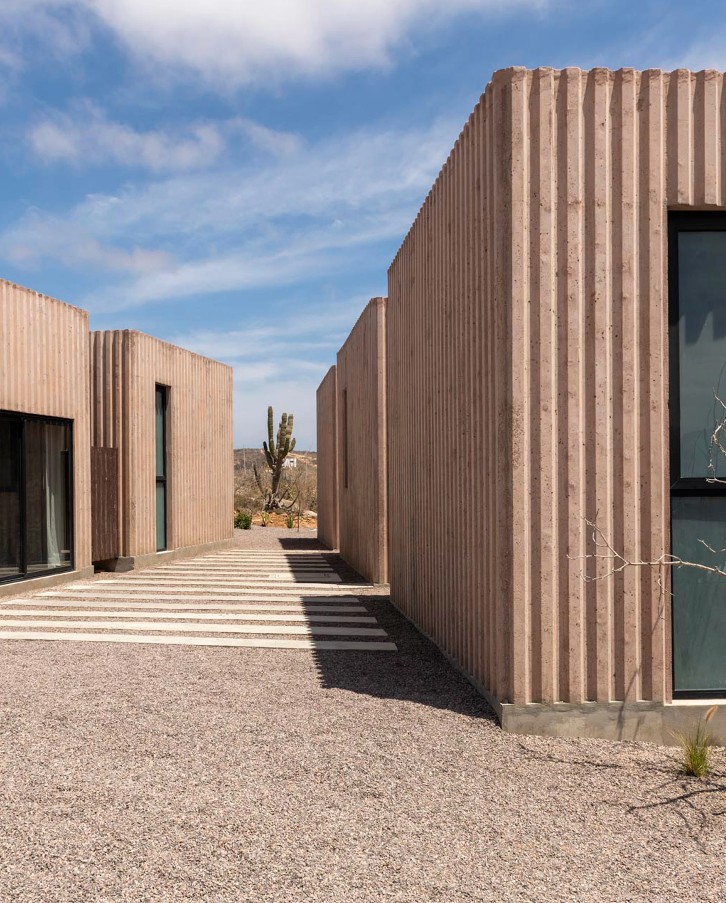 Situado en la localidad de Todos Santos, en el estado mexicano de Baja California Sur, el proyecto está compuesto por tres viviendas distribuidas en once módulos tipo, cada uno de 25 metros cuadrados. Funcionando en conjunto, el programa residencial se fragmenta en cubos de una planta e iguales dimensiones, que contienen una cocina, un comedor una sala de estar y habitaciones con baños. Las construcciones modulares se esparcen por el terreno, integradas en un eje con tres patios.