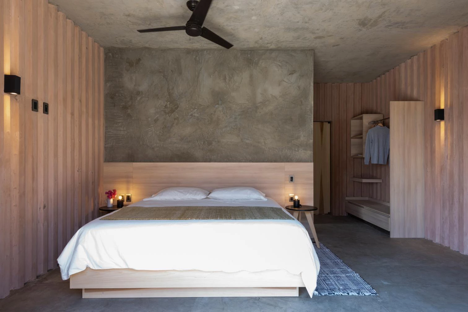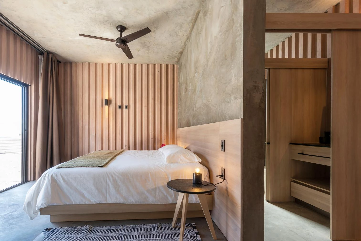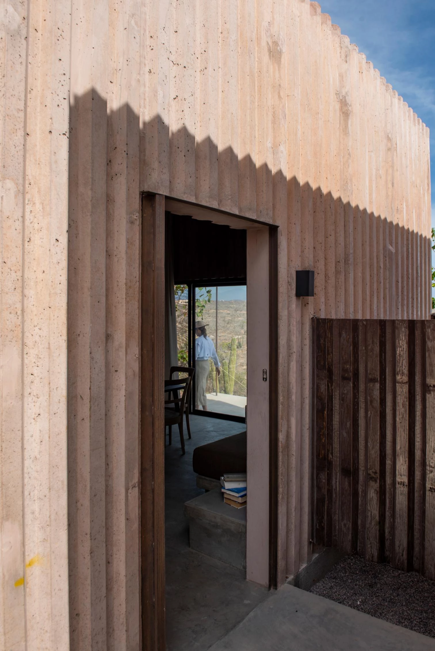 El elemento unificador es el hormigón teñido. Las superficies acanaladas de este material son a la vez estructura y acabado. Las estrías rítmicas generan sombras, actuando como protecciones térmicas para reducir el calor durante el día. La misma textura se repite en las paredes interiores.