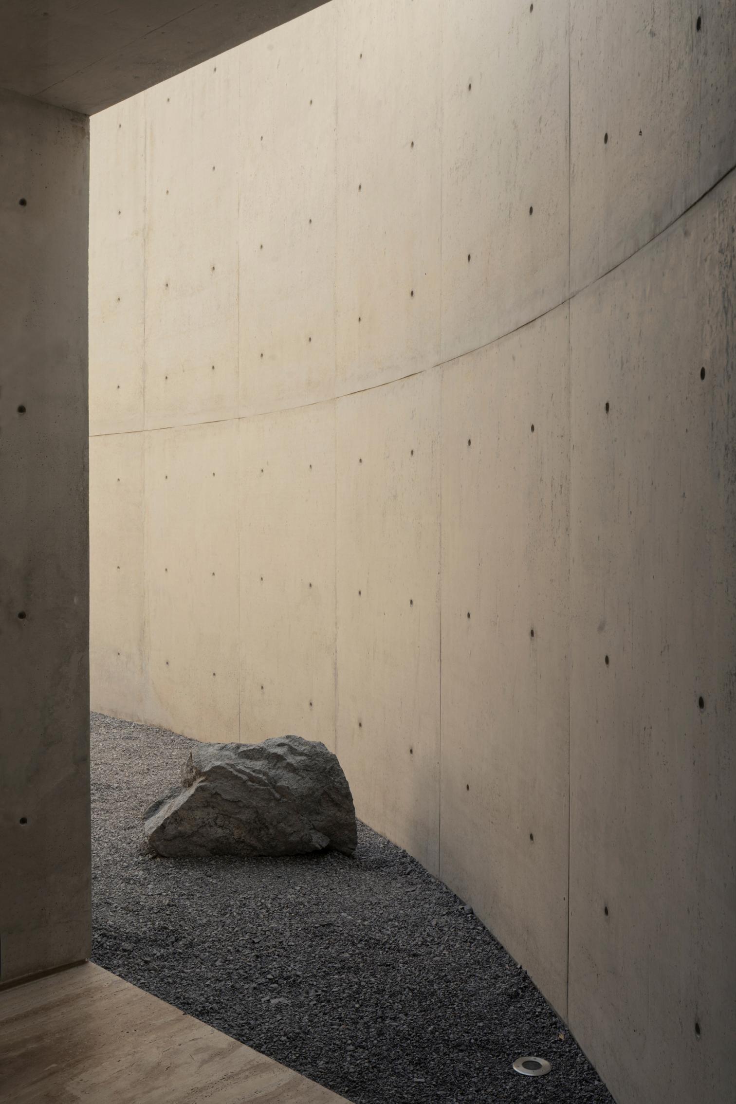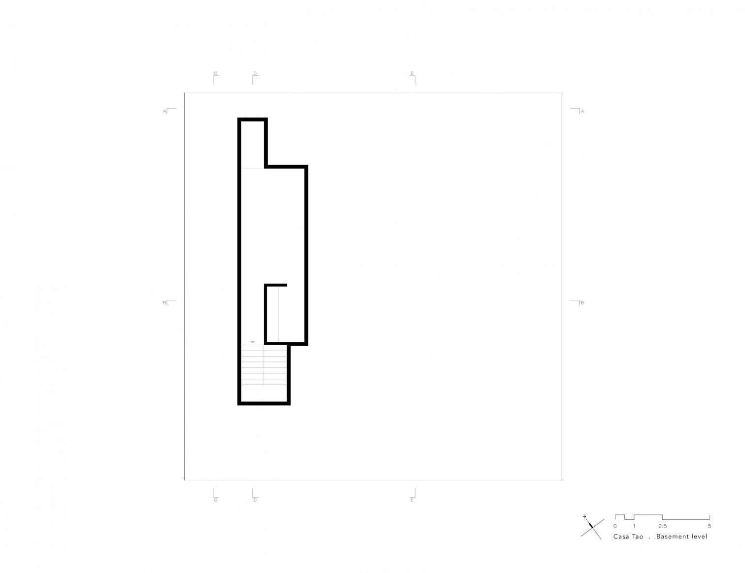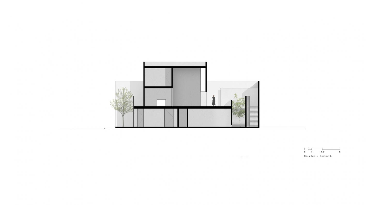 Un muro curvo señala un umbral acogedor, y un árbol da la bienvenida como si se tratara de un arreglo floral. La casa no se abre hacia el vecindario: busca el recogimiento. Casa Tao se retira con discreción y ofrece sus espacios como atmósferas de contemplación. Su arquitectura persigue deliberadamente la sombra, tanto como refugio físico como expresión poética.