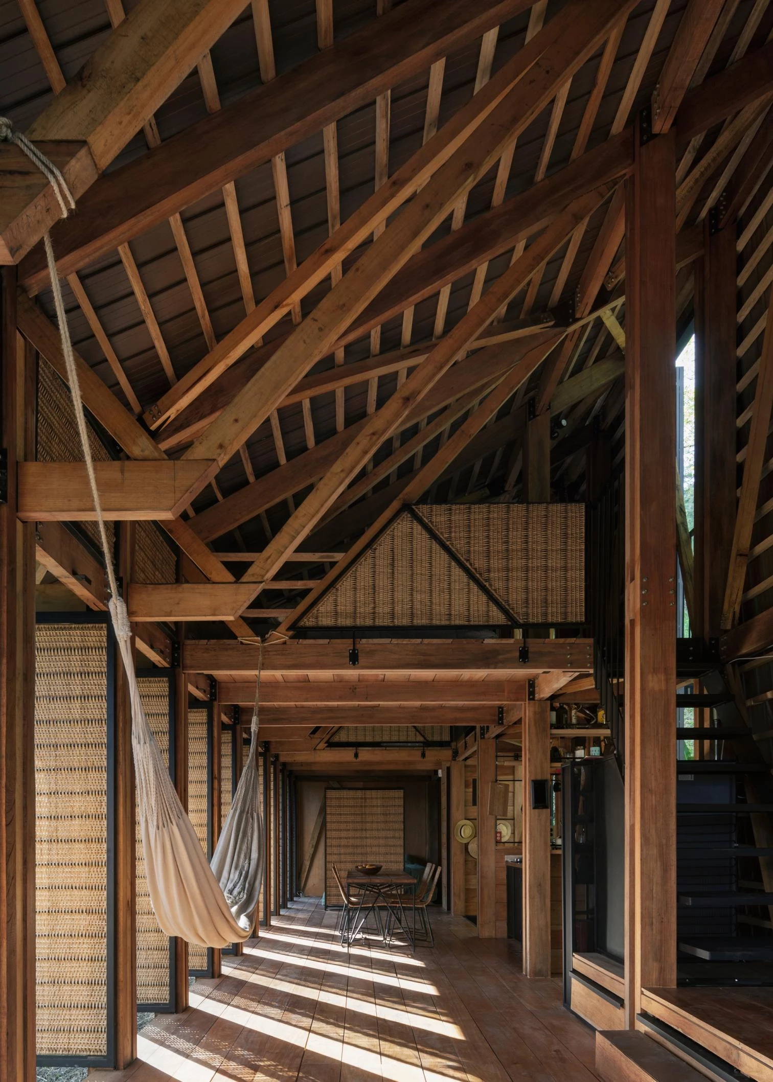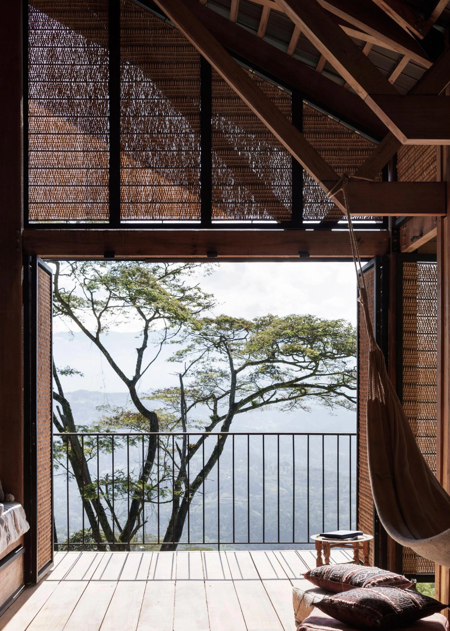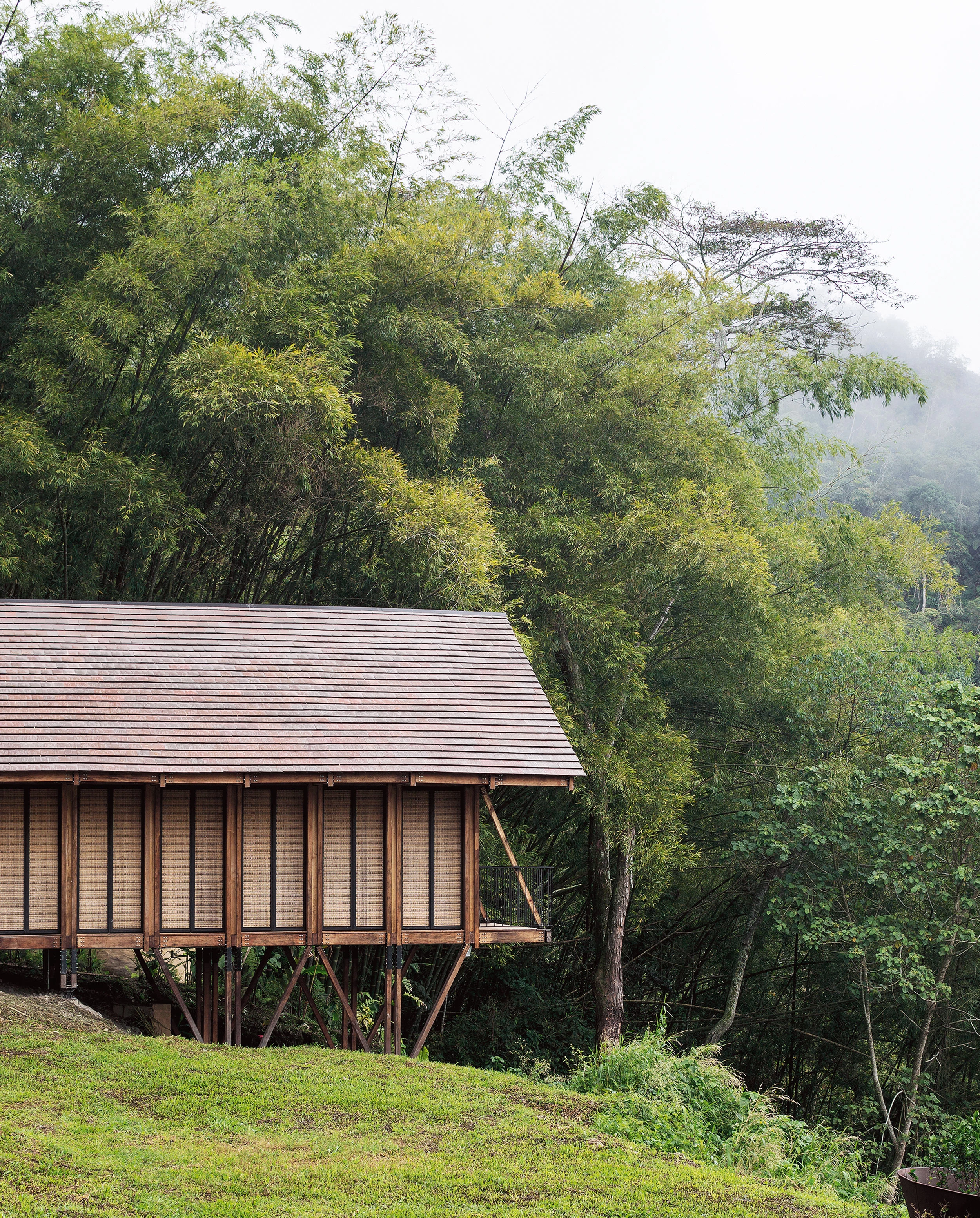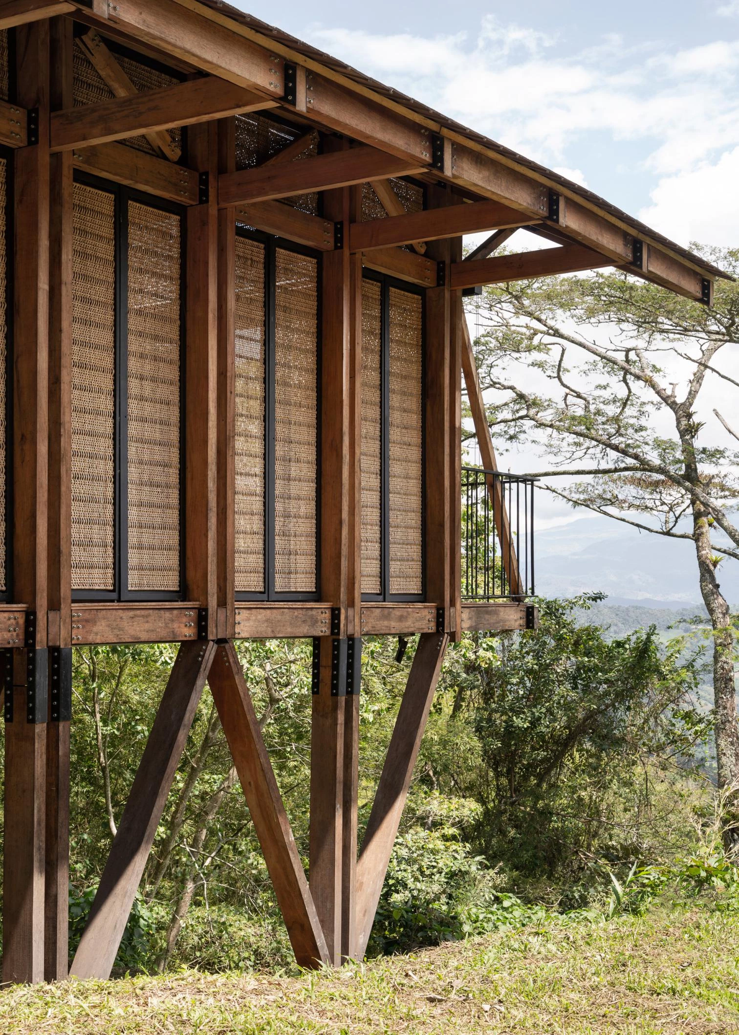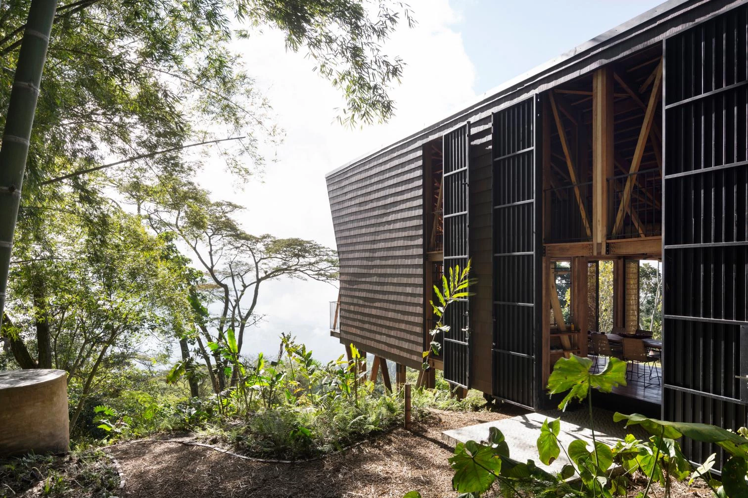 La casa aprende de las viviendas palafíticas prehispánicas para aprovechar la abundante materia prima local y generar un menor impacto. Un módulo-cercha se repite para configurar un espacio longitudinal a doble altura y abierto al paisaje en todo su perímetro, si bien una serie de paneles abatibles tejidos artesanalmente permiten ganar privacidad sin bloquear la entrada de luz y brisa.