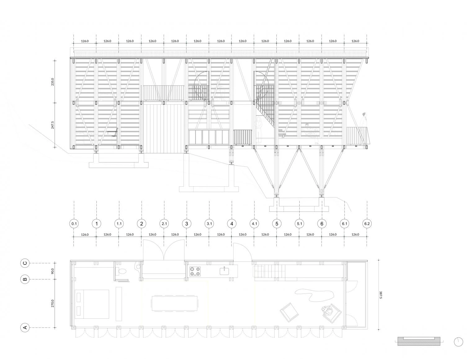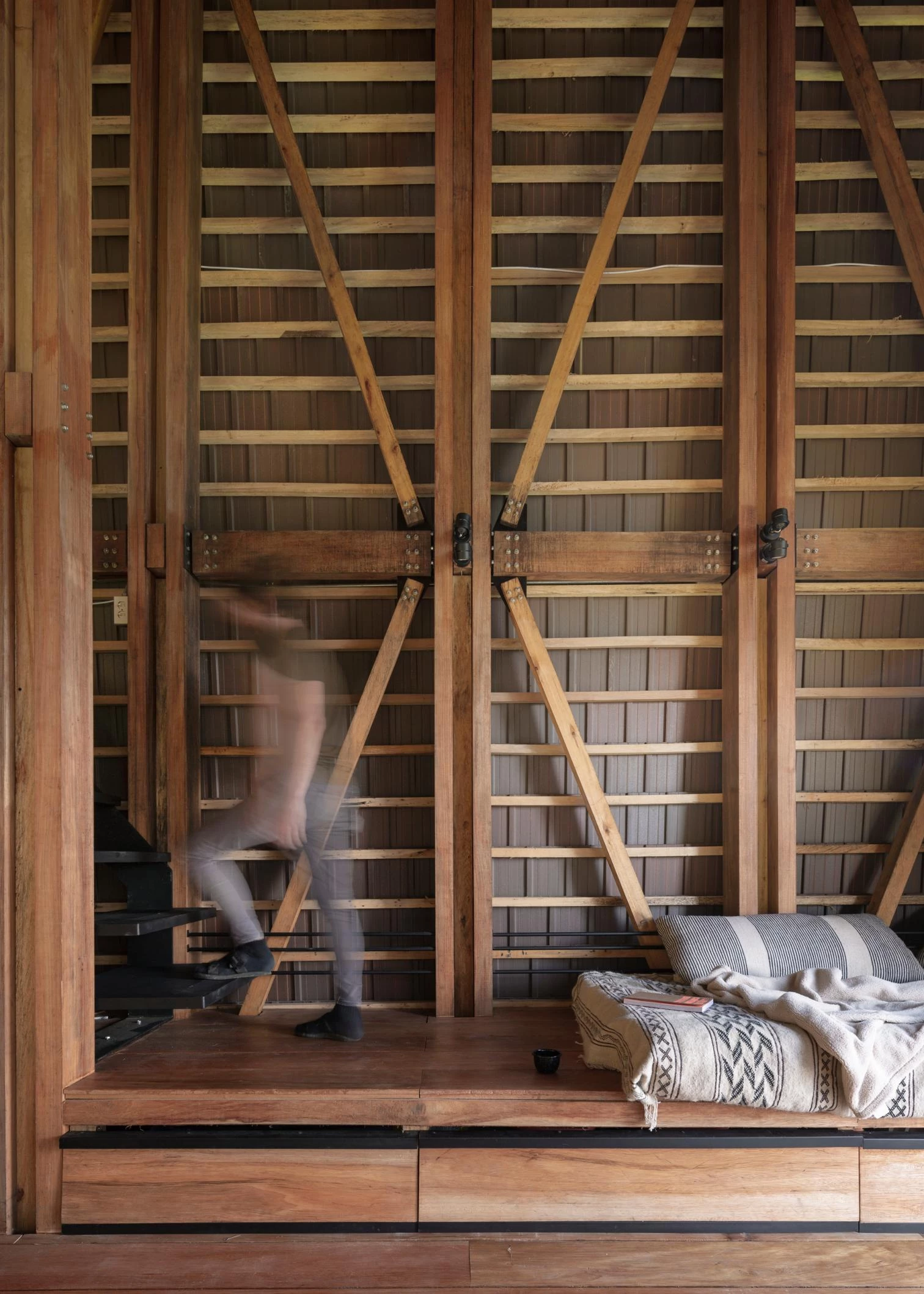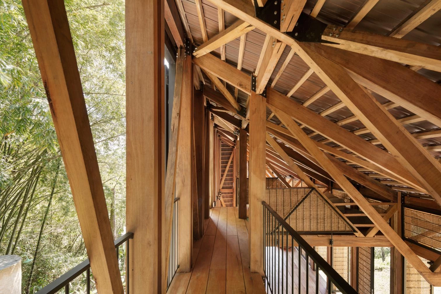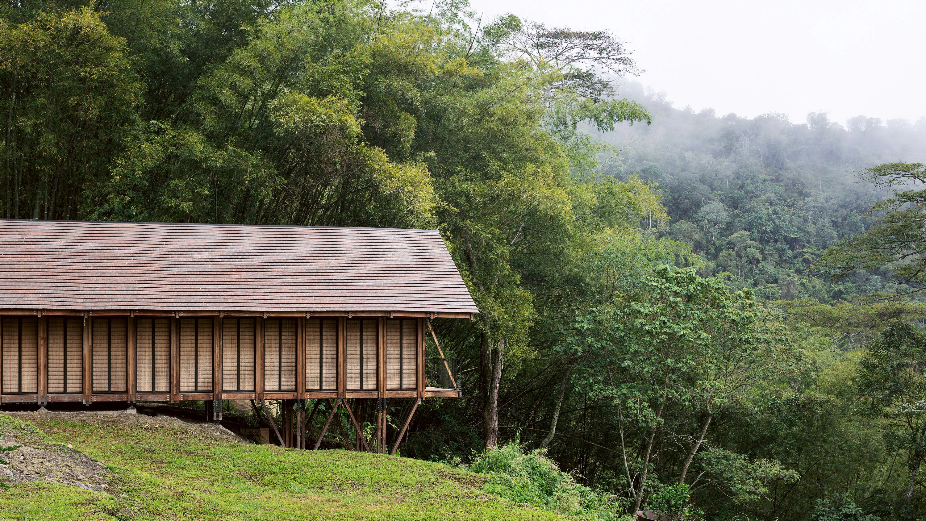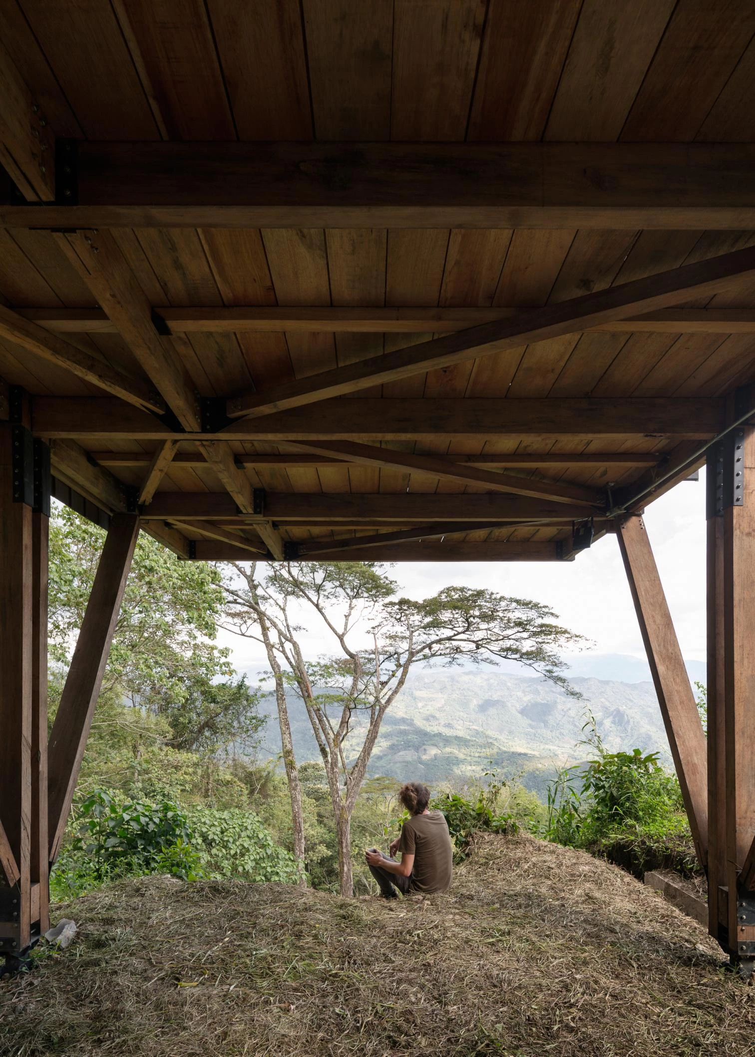 La casa aprende de las viviendas palafíticas prehispánicas para aprovechar la abundante materia prima local y generar un menor impacto. Un módulo-cercha se repite para configurar un espacio longitudinal a doble altura y abierto al paisaje en todo su perímetro, si bien una serie de paneles abatibles tejidos artesanalmente permiten ganar privacidad sin bloquear la entrada de luz y brisa.