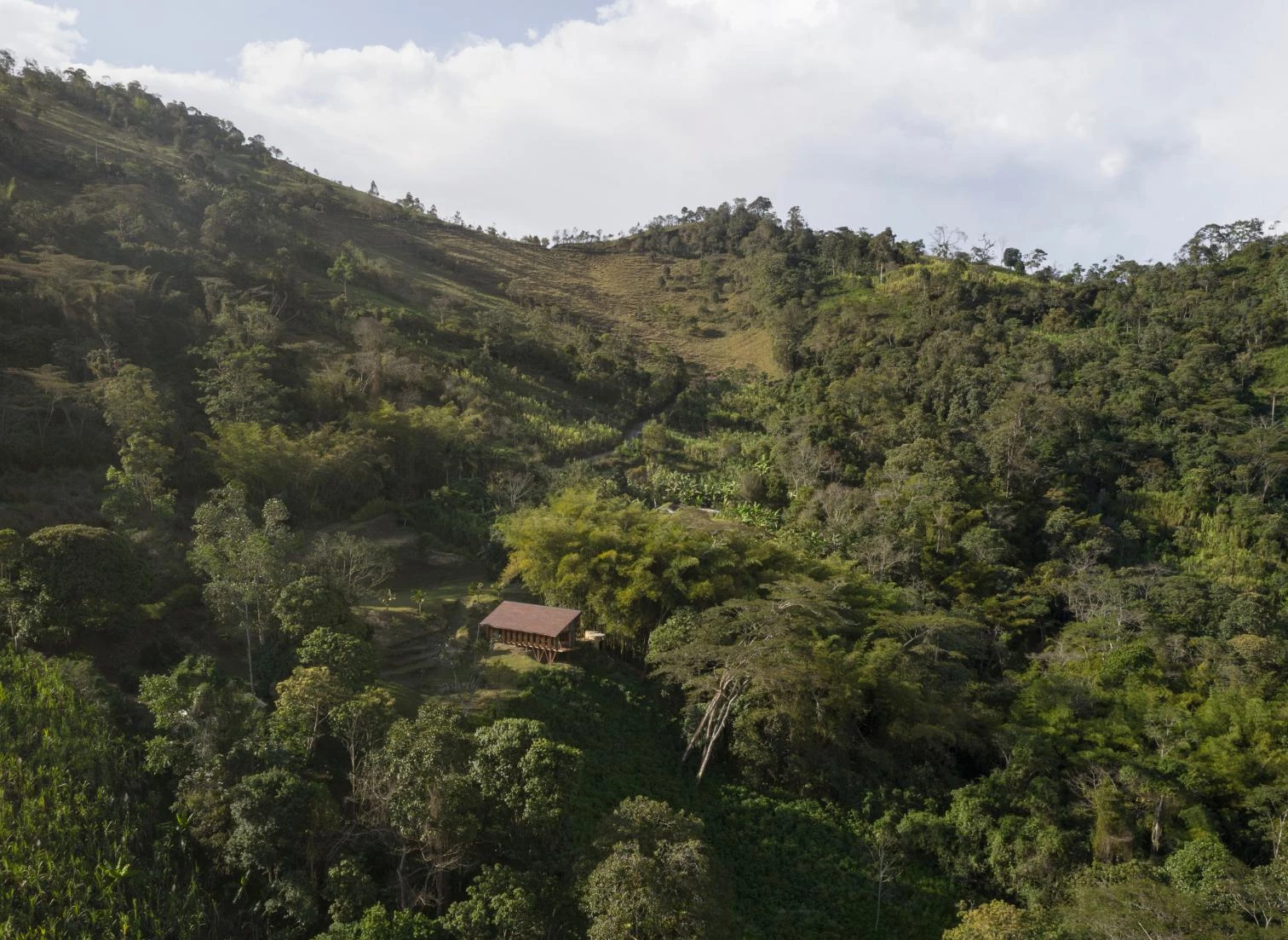 Nocaima es una remota comunidad rural de apenas veinte familias desperdigadas a lo largo de una vereda de montaña que discurre difícilmente entre densos bosques y plantaciones de caña y café. En ella, los lugareños suelen conformar terrazas para edificar sus casas siguiendo la topografía, lo que ocasiona problemas de estancamiento de agua de escorrentía en el frente que queda contra el terreno. Por el contrario, la Casa Tejida se dispone a favor de la pendiente, evitando grandes movimientos de tierra y buscando un mejor soleamiento.