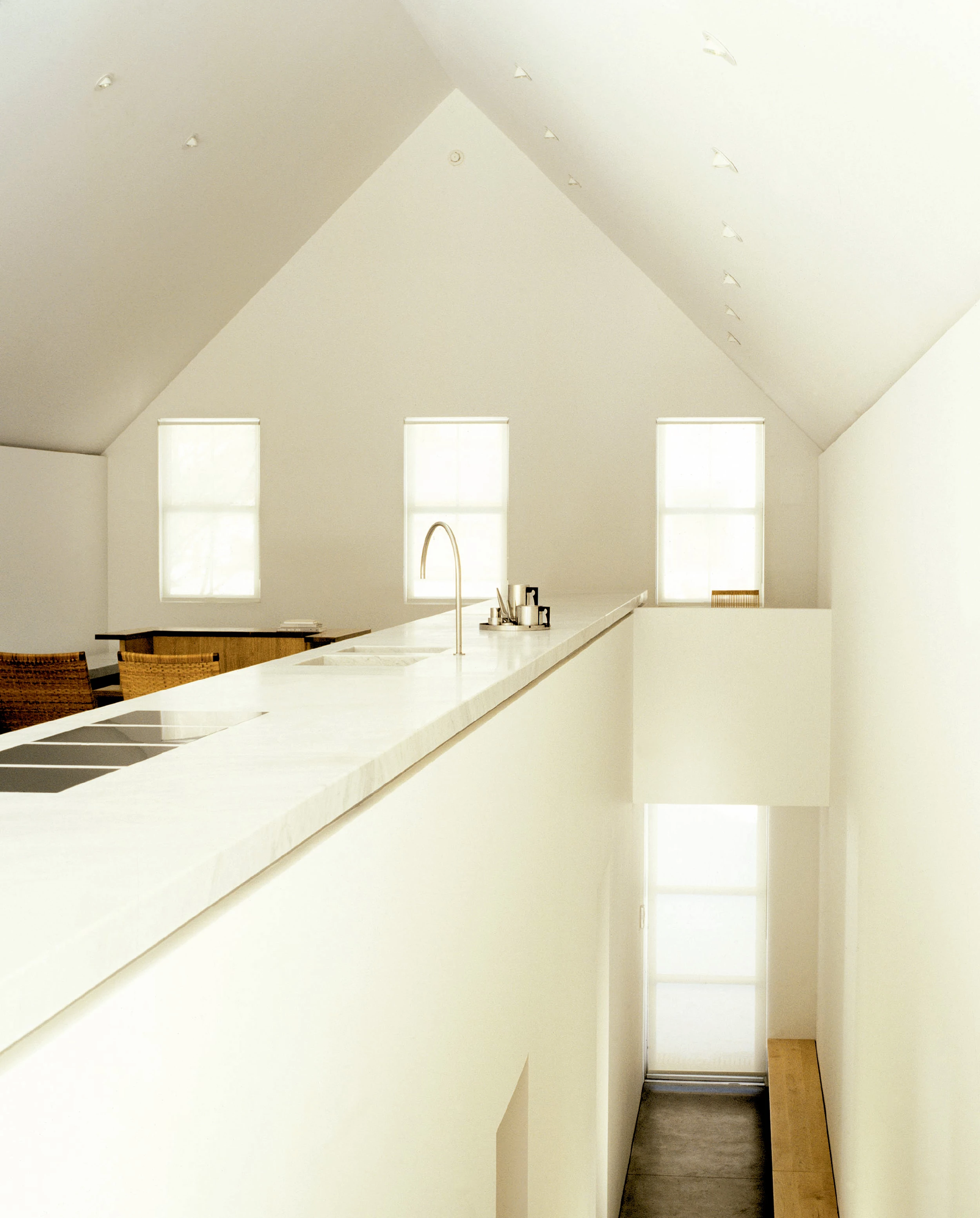 No sólo la forma exterior sino también los materiales a emplear —locales— estaban definidos por la normativa urbanística. Así, el volumen de dos alturas posee un zócalo de piedra en la parte inferior y un cerramiento a base de listones de madera en la superior, que junto con la cubierta metálica, la hacen pasar inadvertida entre las construcciones vecinas. La planta, un rectángulo de 26 x 7 metros, propicia dos niveles de distribución opuesta y complementaria: la planta baja se subdivide en dependencias relacionadas por un corredor lateral, mientras la planta primera no dispone de compartimentación alguna. El acceso, en uno de los lados cortos del rectángulo, da paso a tres piezas correspondientes al dormitorio principal primero y a los dos menores después, además de los baños; al fondo se sitúa el garaje con un vestíbulo intermedio, y en un lateral, la escalera, que se despliega en un solo tramo y a doble altura a lo largo de uno de los lados mayores del rectángulo; arriba, el muro que acompaña a la escalera se convierte, a media altura, en la encimera de la cocina, apuntando con este gesto al cambio de ambiente: junto a ella se disponen los muebles del comedor a un lado y los de la sala de estar a otro; el fogón en el punto medio de un costado, un pequeño estudio ganado sobre el hueco de la escalera, y una terraza sobre la zona de garaje completan el área más pública de la vivienda.