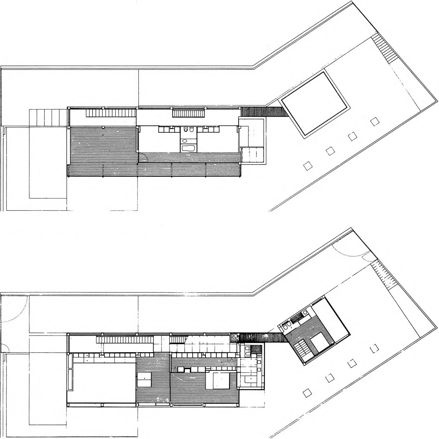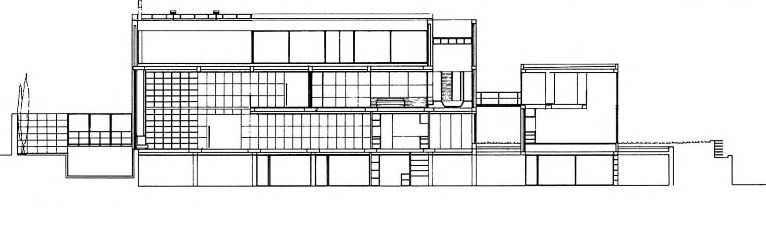 En el interior del cuerpo principal están netamente diferenciados los espacios de uso común y los de uso privado, y el conjunto de los espacios vivideros de los dedicados a circulación. La vivienda se organiza a partir de una franja longitudinal segregada de la planta —y en triple altura— que aloja todos los movimientos tanto horizontales como verticales de comunicación. Este volumen queda separado de la pieza principal mediante una suerte de ‘mueble contenedor’ de todos los usos domésticos (biblioteca, armario, televisión, hi-fi, buffet...) que permite obtener una planta auténticamente libre. El espacio a triple altura se utiliza como vestíbulo representativo, en donde se sitúa la escalera principal, fragmentada en dos inclinaciones para subrayar la dependencia visual y funcional entre la planta baja y la primera. El dormitorio principal y sus espacios anexos, que ocupan la primera planta, forman un espacio continuo comunicado mediante paneles correderos. El segundo tramo de la escalera conduce a los dormitorios gemelos de la segunda planta, separados por el baño.