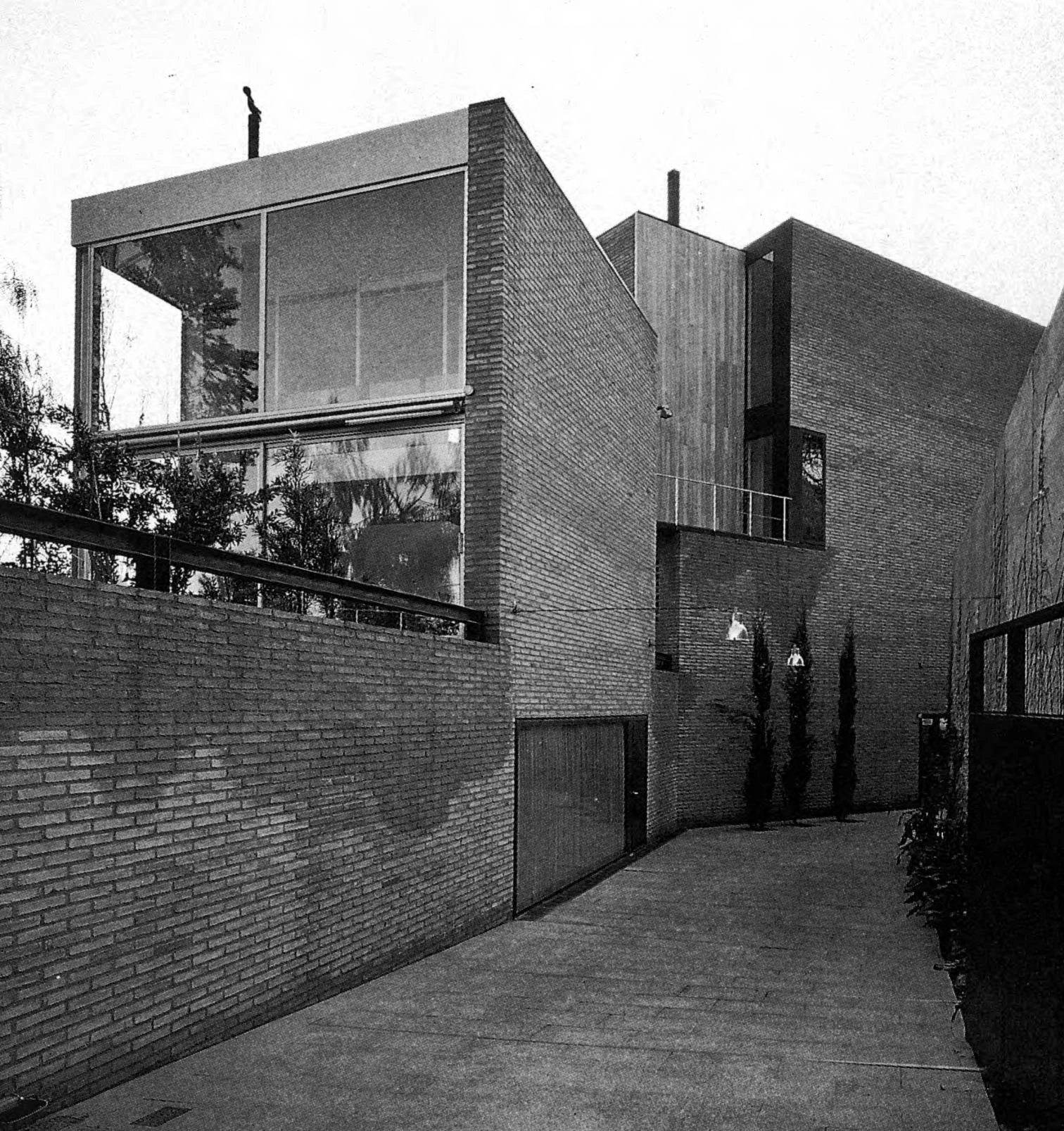 La fachada correspondiente a las rampas se presenta como un paño casi ciego de ladrillo visto que pone de manifiesto la unidad volumétrica del proyecto y la vinculación de ambos cuerpos a nivel de sótano. La fachada al jardín, por el contrario, se configura como un plano abierto en el que predominan el cristal y la madera. Esta fachada traduce externamente la rigurosa geometría de la estructura, mostrando las cinco crujías transversales que componen el volumen y guían toda la composición.