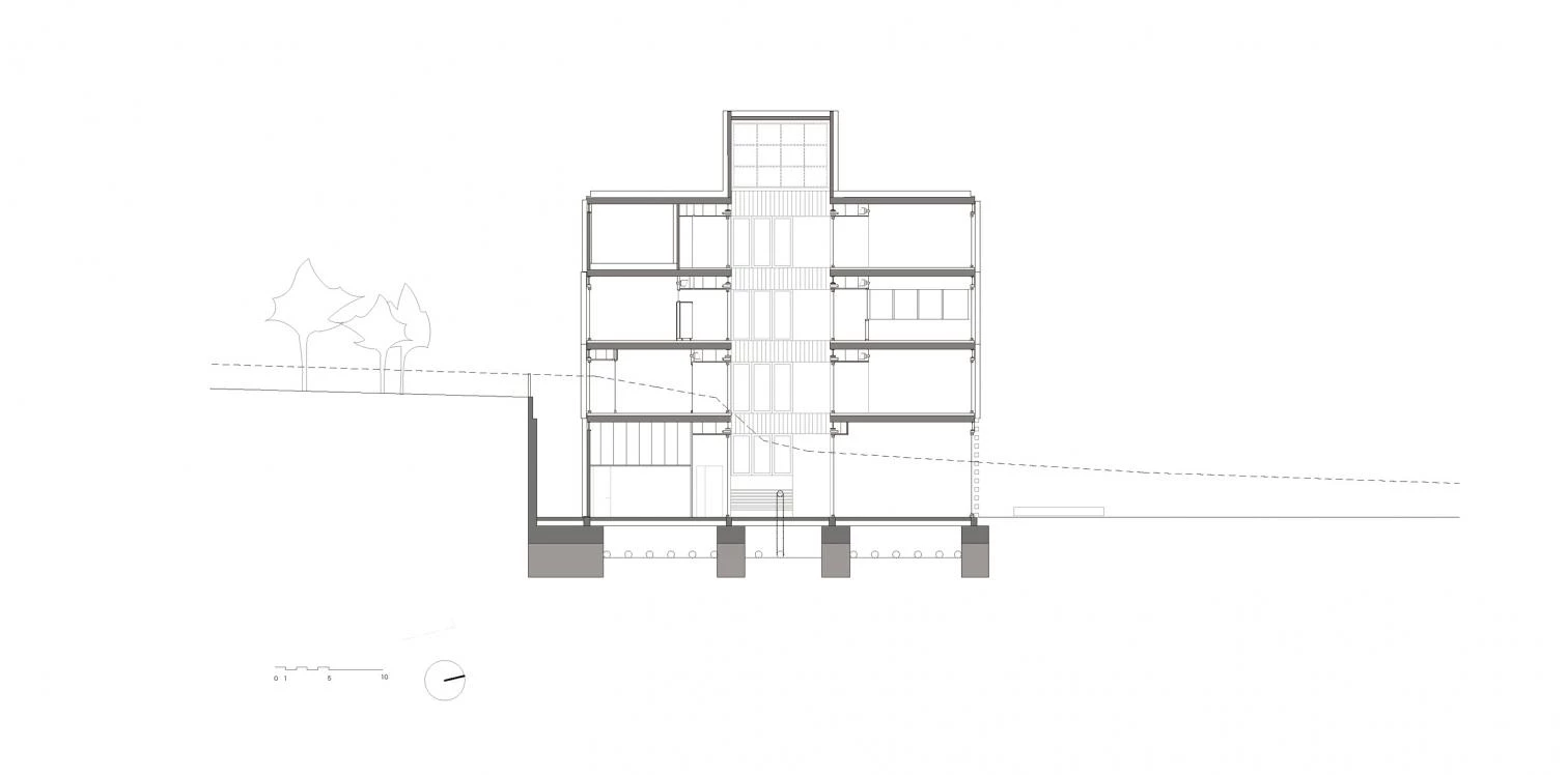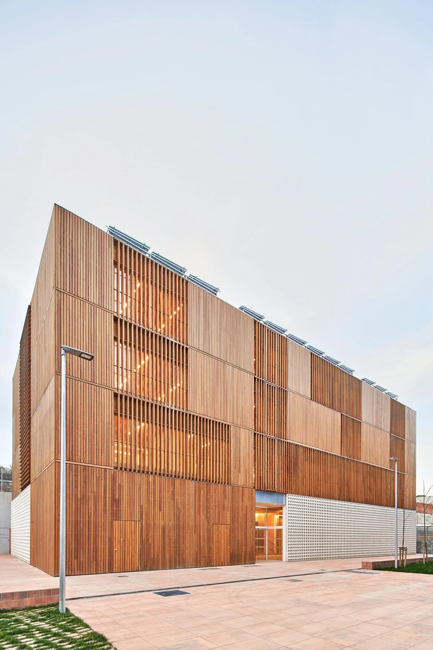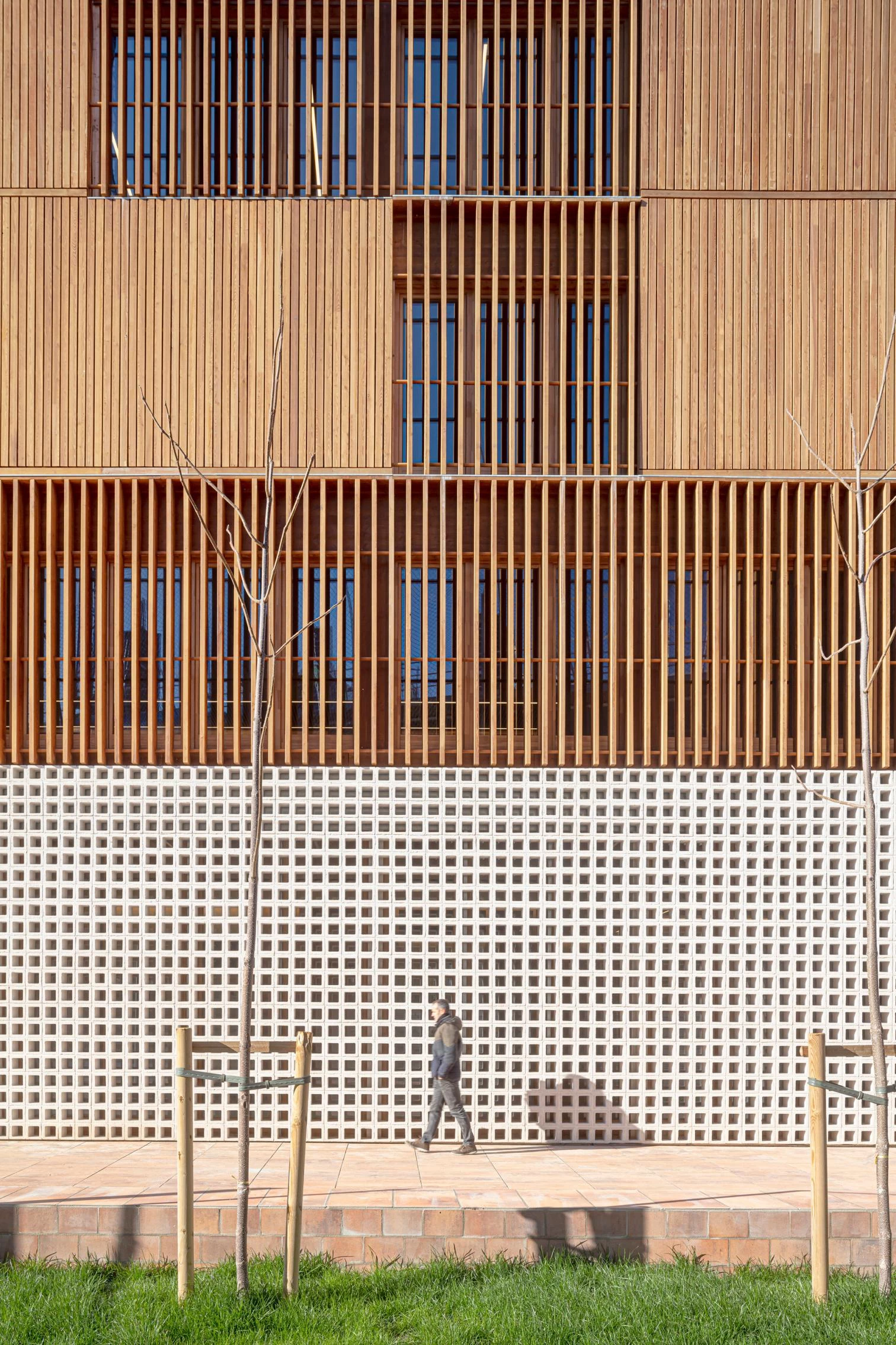 En este interior de manzana, íntimo y preservado, el proyecto busca crear un lugar confortable al fondo de la plaza, una casa pública que acoja gente de Sant Andreu y Nou Barris con diferentes necesidades, un edificio donde los usuarios se sientan como en casa. Así, para ofrecer calidez en un entorno urbano hostil, se apuesta por la madera como material principal. La madera absorbe CO2 durante toda su vida útil, dando como resultado un muy bajo impacto ambiental por huella de carbono. Debido a su bajo peso, no tiene inercia térmica, por lo que el proyecto opta por movilizar la inercia del terreno. El desmonte de tierras de la excavación en ladera se aprovecha para enterrar unos tubos por donde circula aire limpio, antes de levantar el edificio.